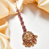 The Kalpana Temple Maang Tika is a stunning piece of jewelry that exudes elegance and tradition. Crafted from high-quality alloy and plated with gold, this Maang Tika features intricate designs adorned with vibrant pink and green kundan stones, making it a perfect statement piece for weddings, festive occasions, and pooja wear. The central pendant showcases a beautifully detailed deity, surrounded by a halo of colorful stones and delicate gold beads, adding a touch of royal charm to any ethnic ensemble. Ideal for gifting, this Maang Tika is a thoughtful present for women on occasions like Valentine's Day, Diwali, Rakshabandhan, Christmas, and New Year. Whether styled with traditional sarees, lehengas, or contemporary fusion wear, this elegant piece enhances the beauty of any outfit, making it a versatile addition to any jewelry collection.