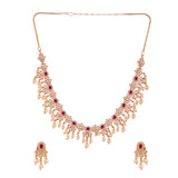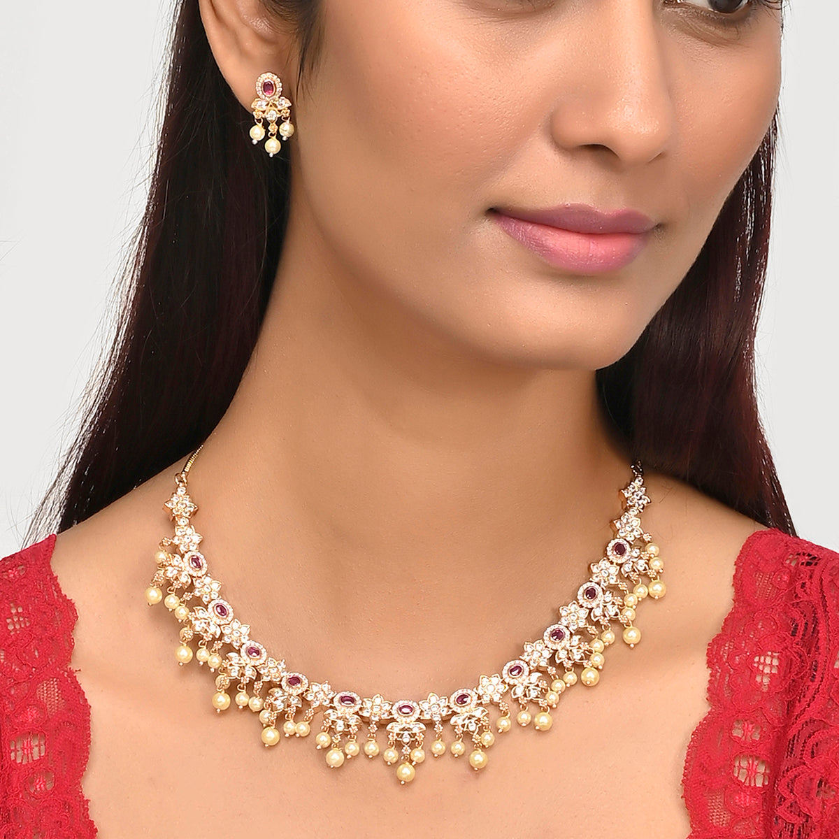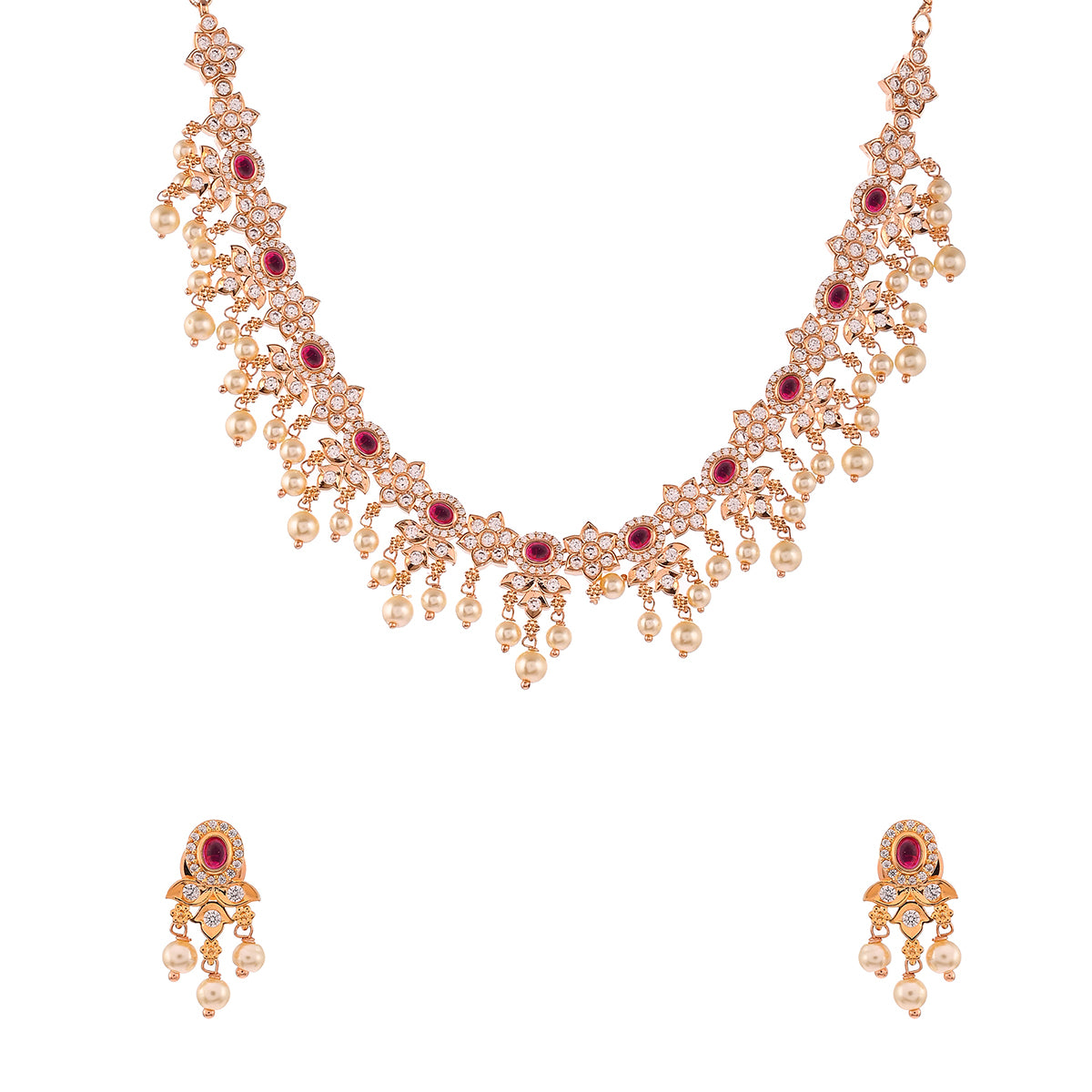 Ethnic jewellery set featuring a classic meenakari pattern. Fashioned out of brass and gold plated, the necklace and drop earrings have been embellished with faux pearls and cubic zirconia gemstones. Pair with traditional Indian outfits.