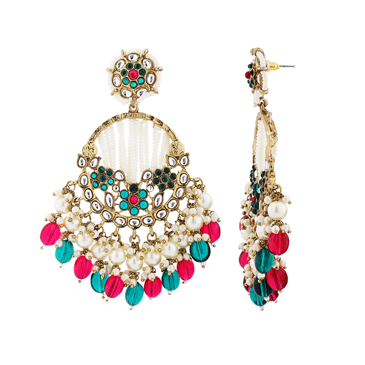 Make every celebration shine brighter with the Gold Opulence Noor Jashn Kundan Chandbalis Earrings, a radiant expression of Indian tradition and festive glamour. Crafted in high-quality brass and finished with a rich gold polish, these oversized chandbali-style earrings feature intricate kundan polki work, delicate pearl strings, and vibrant green and ruby red bead drops that dance with every movement. Designed to bring grandeur to weddings, poojas, Diwali, and sangeet nights, they are statement-makers in every sense. The circular chand motif evokes traditional elegance, while the colorful detailing adds a joyful, celebratory feel. Whether paired with lehengas, silk sarees, shararas or even Indo-western gowns, these earrings promise to turn heads. As part of the Gold Opulence collection, Noor Jashn is perfect for women who love bold, heritage-inspired jewellery that reflects light, emotion, and artistry. They also make a thoughtful gift for your wife, sister, girlfriend, or mother, ideal for Valentine’s Day, Rakshabandhan, Karwa Chauth, or wedding gifting.