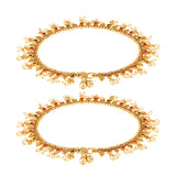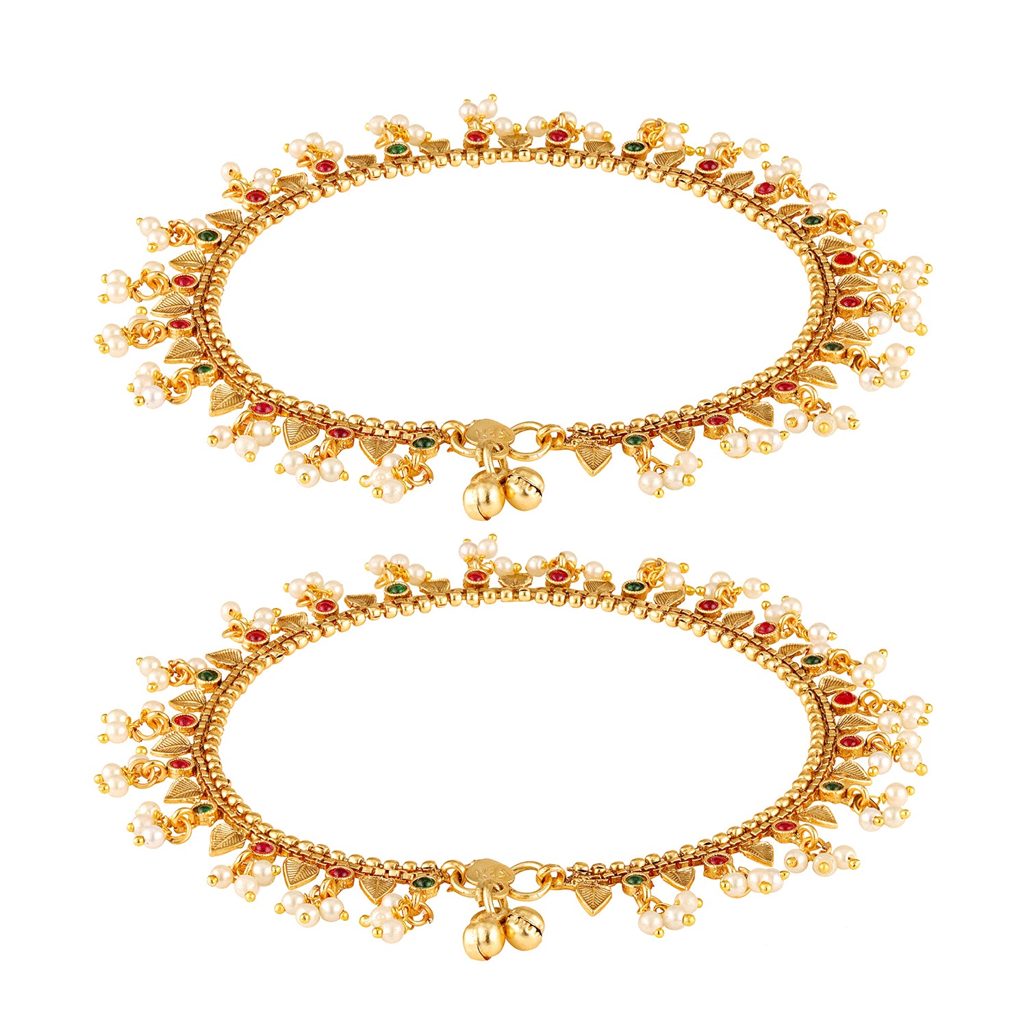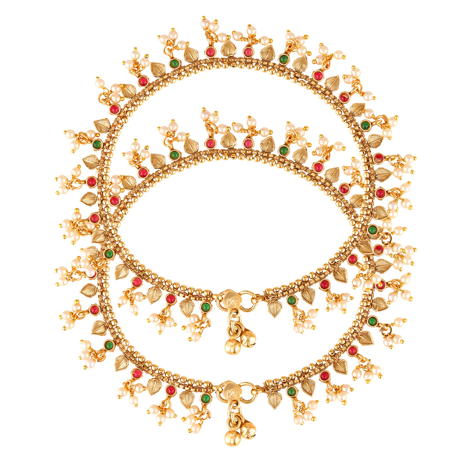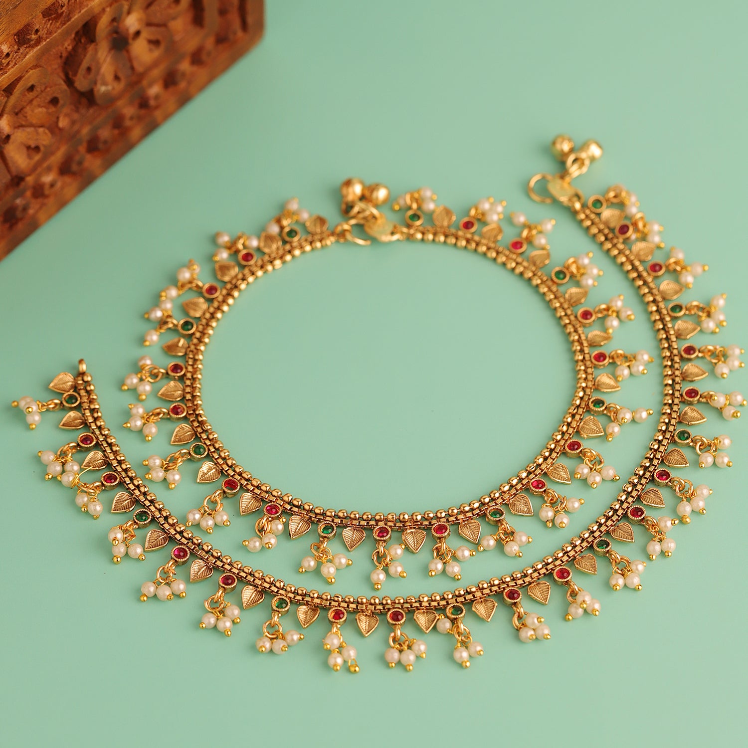 A timeless masterpiece infused with the grandeur of South Indian temple jewelry. Meticulously crafted from high-quality alloy with a luxurious gold plating, these anklets are a symbol of heritage and refinement. Adorned with intricate leaf motifs, beaded edges, and delicate pearl accents, they exude a regal charm that complements festive and traditional ensembles effortlessly. The vibrant red and green stones enhance their opulent appeal, making them perfect for bridal wear, pooja ceremonies, and wedding festivities. Whether styled with an ornate saree or a contemporary fusion outfit, these temple anklets add an exquisite finishing touch to any look. Beyond their aesthetic splendor, they serve as an ideal gifting choice—be it for Rakshabandhan, Diwali, Valentine’s Day, or Christmas—delighting sisters, mothers, wives, and loved ones with a gesture of elegance and tradition. A statement piece for every occasion, these anklets transcend trends, embodying a chic, festive, and royal sophistication that makes them a must-have in every jewelry collection.
