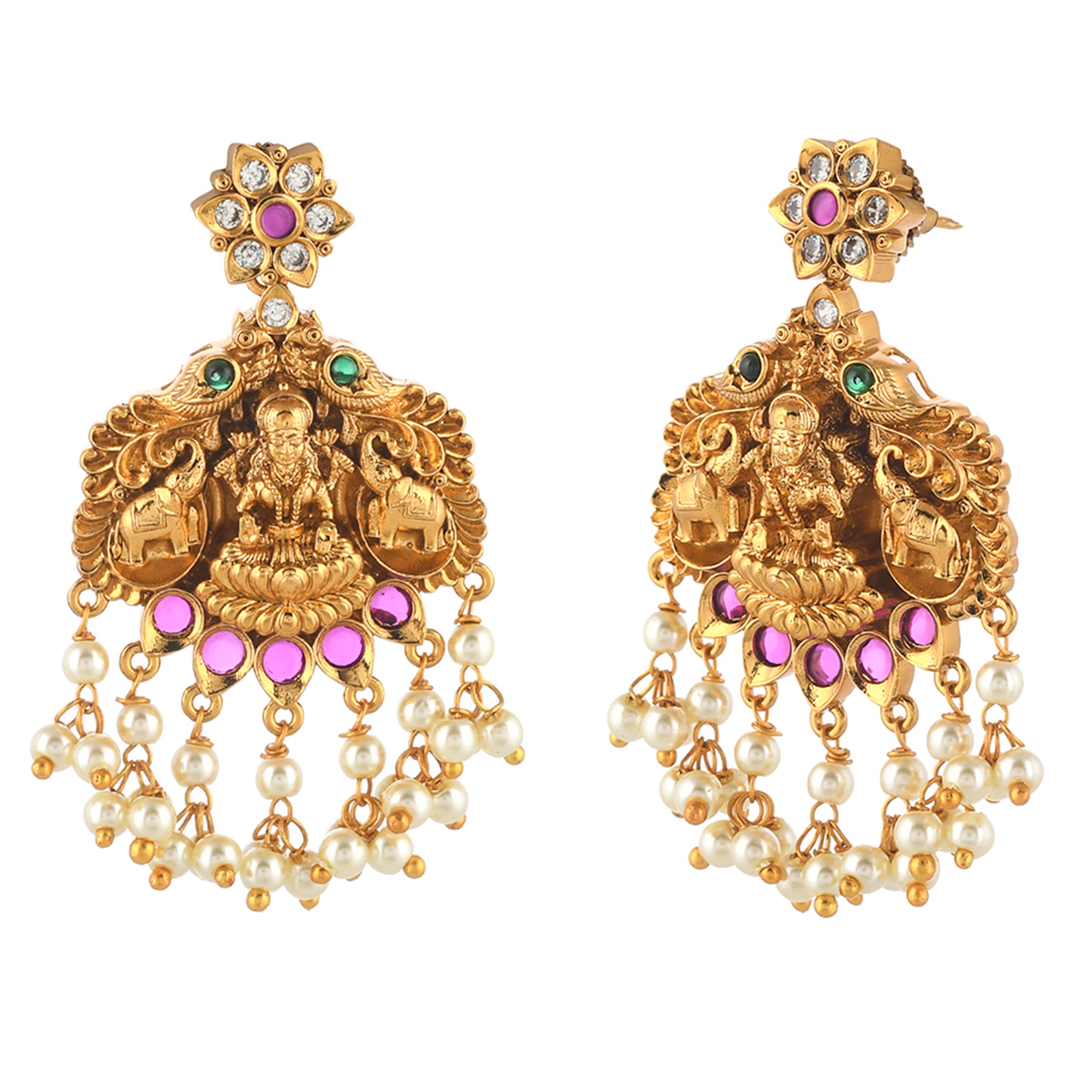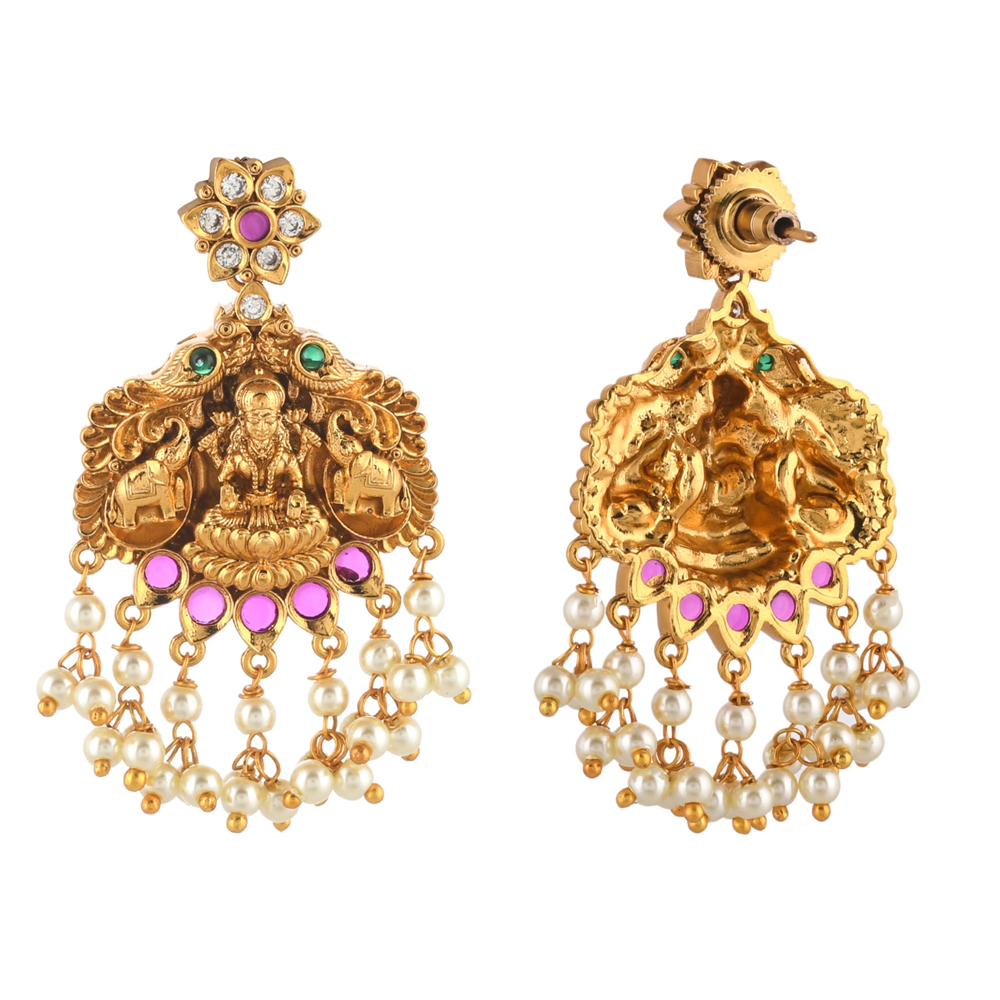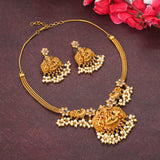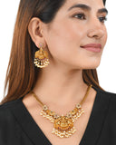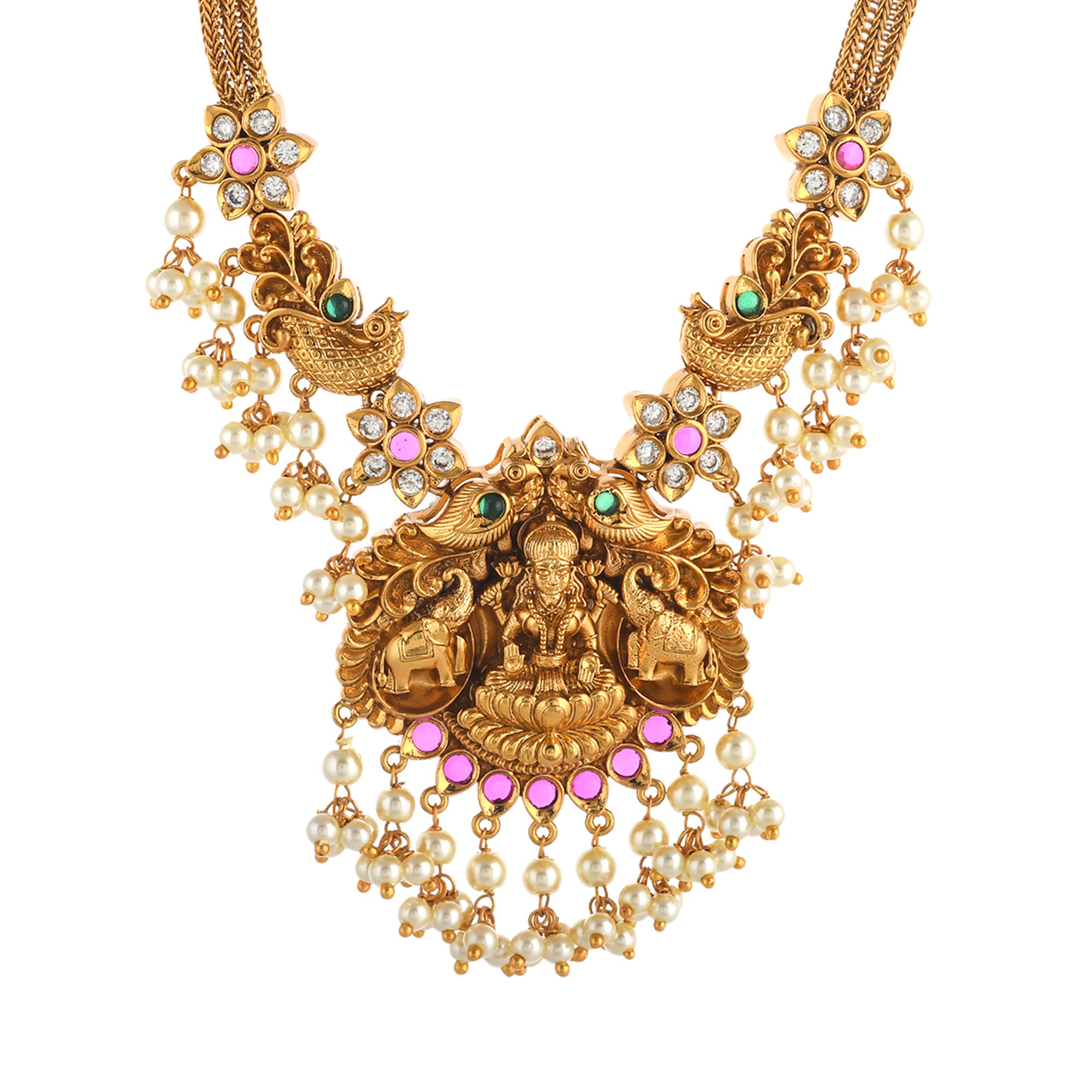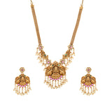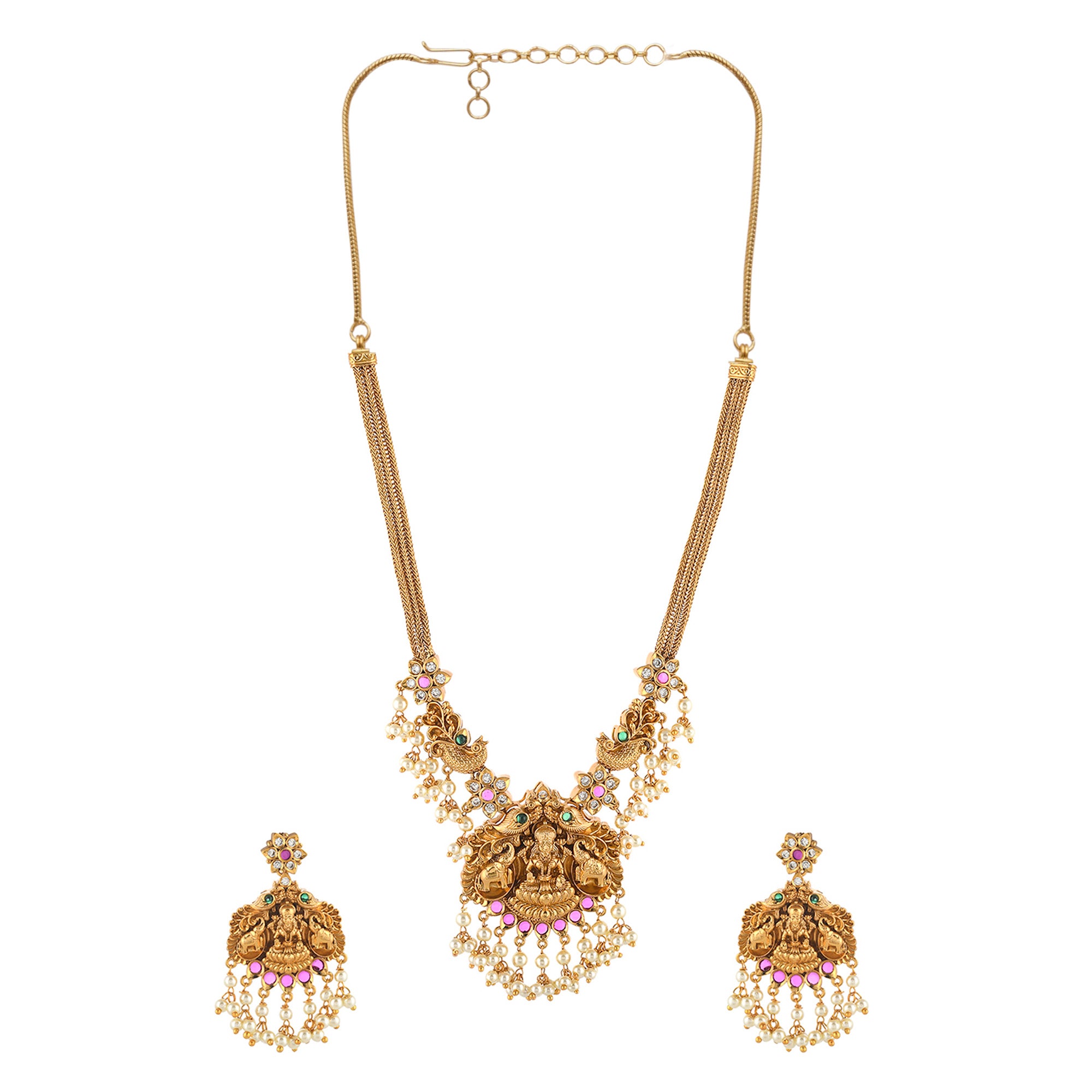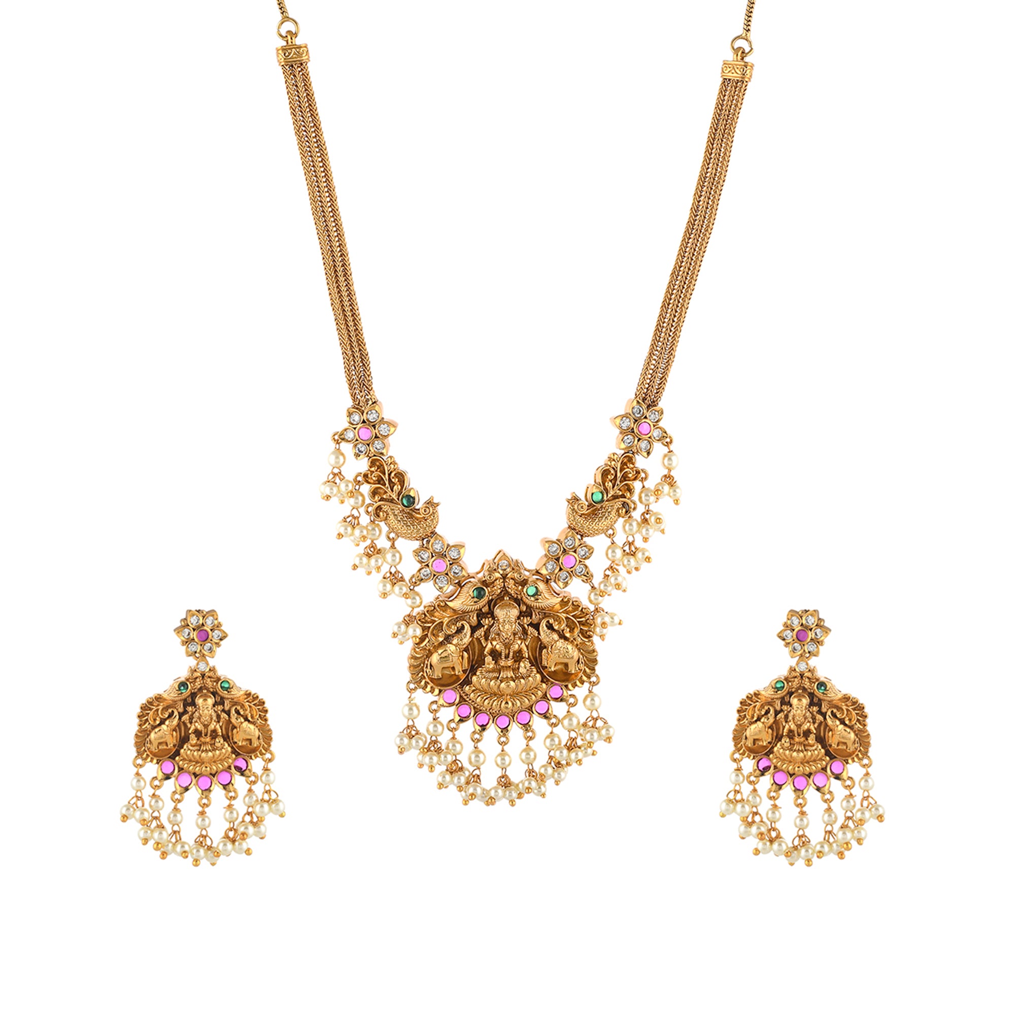 Traditional temple jewellery set made from quality brass. Featuring divine motifs and pearl embellishments. Pair the set with a silk saree.