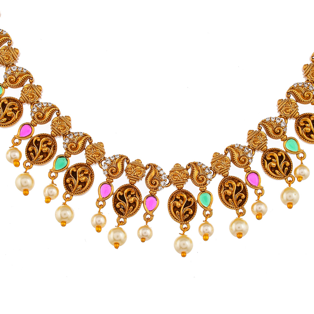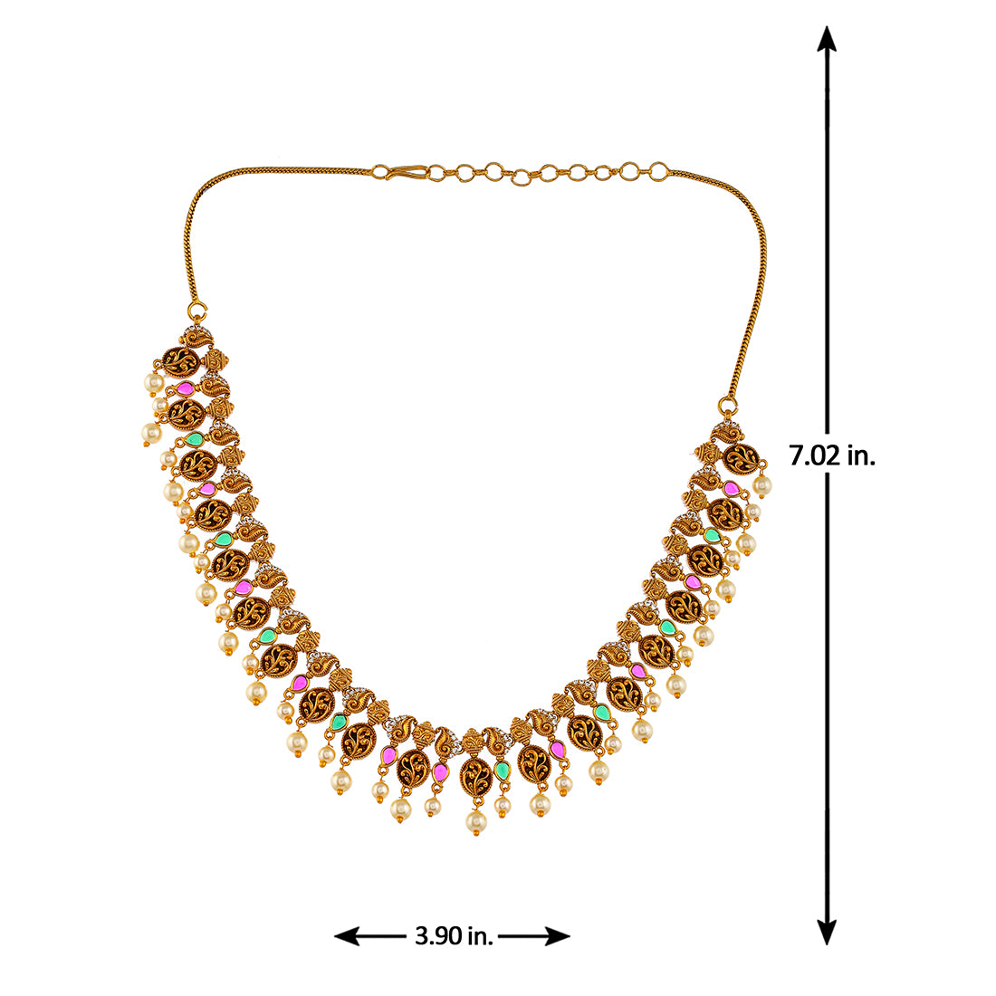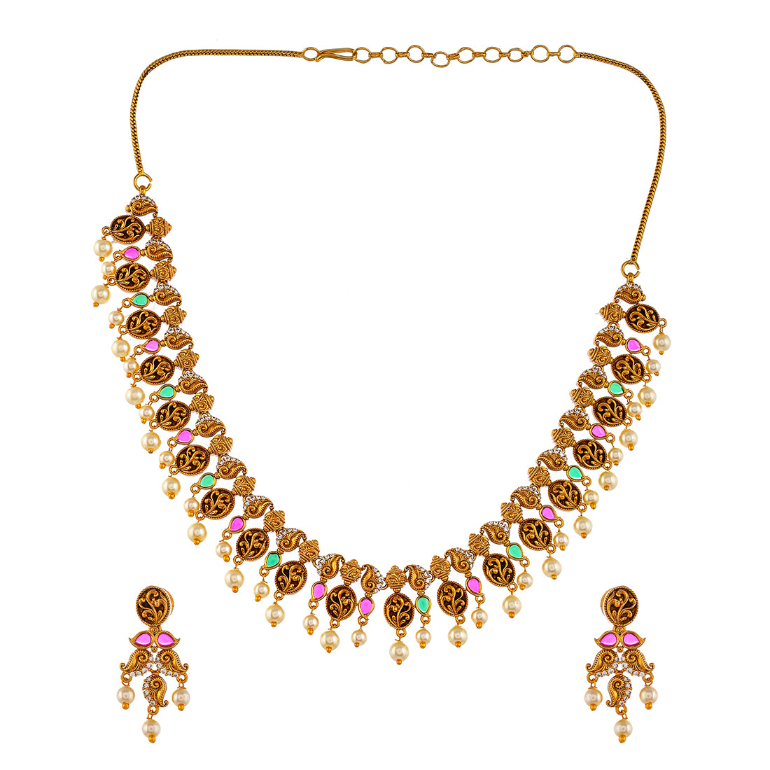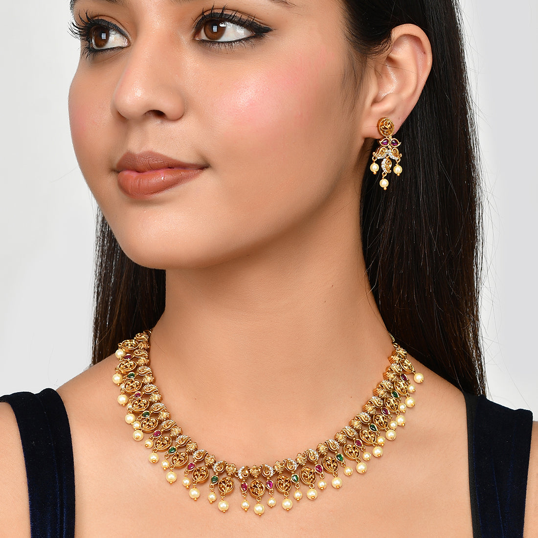 Elevate your style with this stunning gold-plated necklace set. The intricate design and delicate chain will complement any outfit, while golden tones exude sophistication and luxury. The set includes matching earrings, making it a perfect addition to your jewelry collection. Feel confident and radiant with this timeless piece.