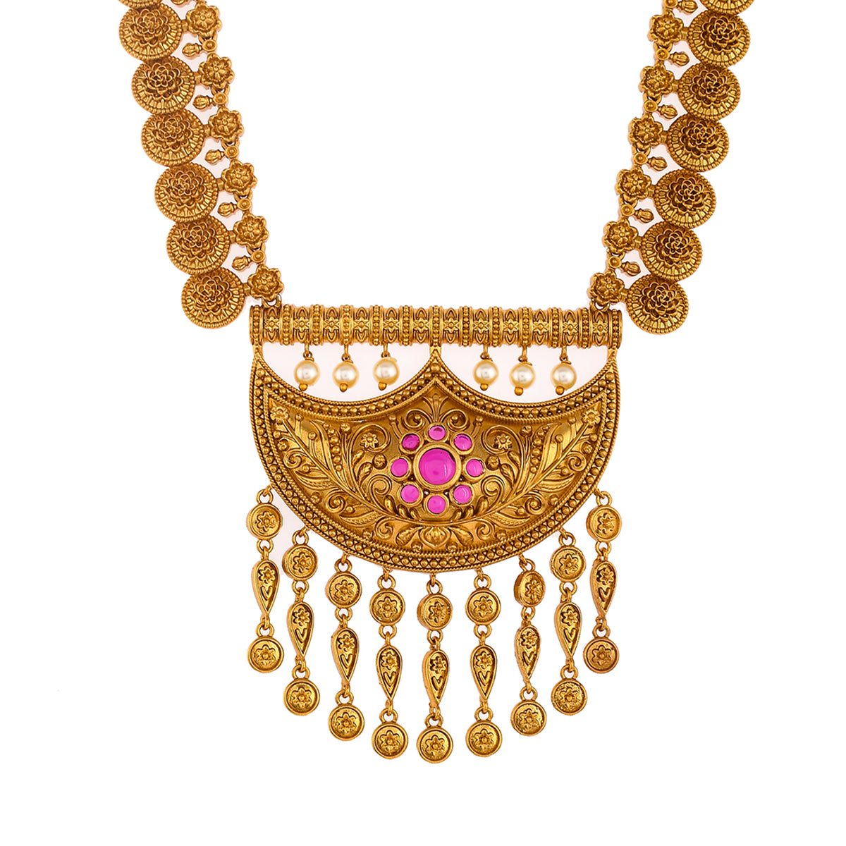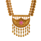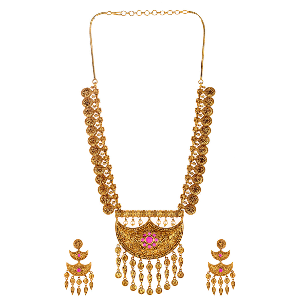 A classic coin jewellery set in a traditional design, adorned with white pearls. Gold plating adds to the charm of this brass set, which can be paired with a wide range of formal Indian attire.