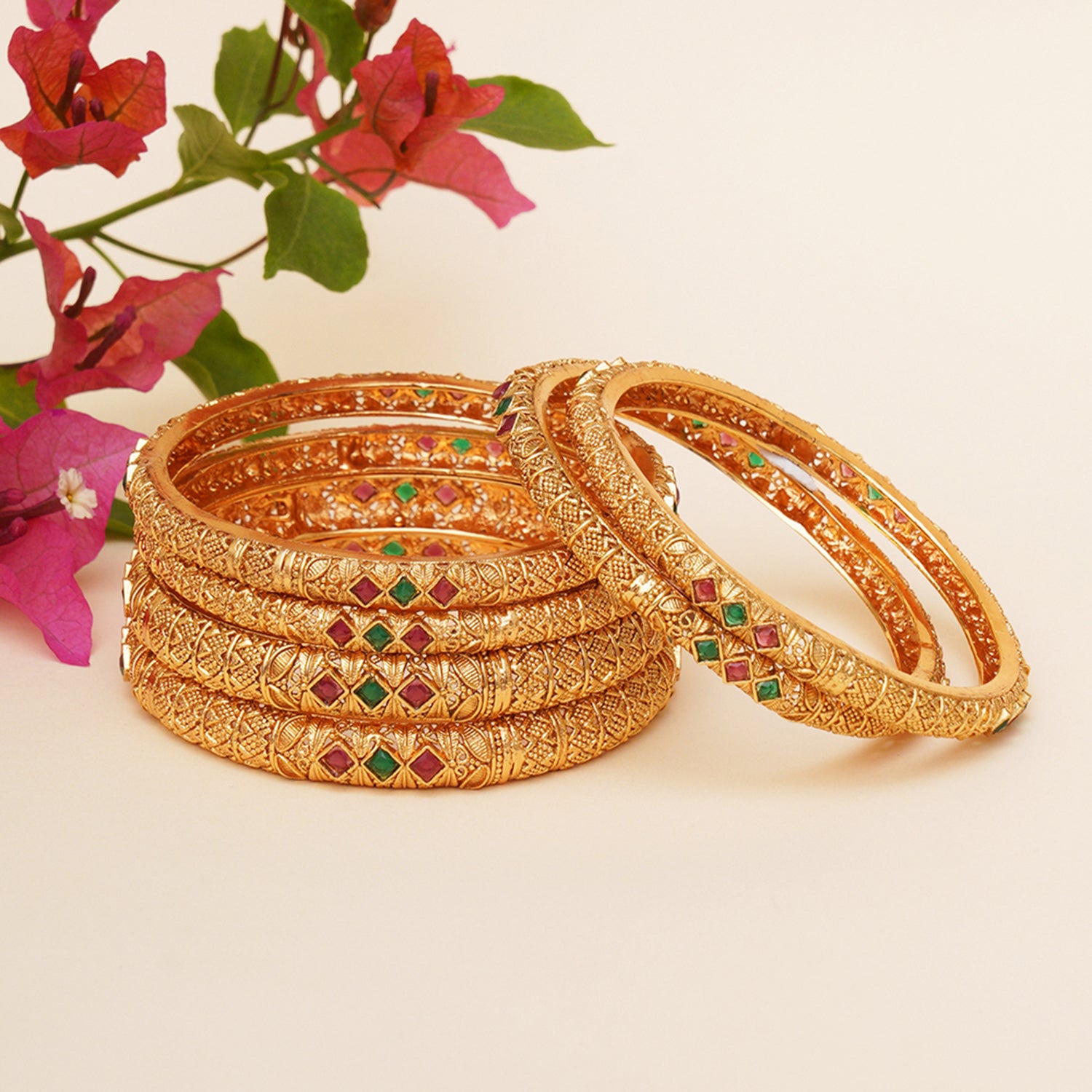 The handcrafted gold plated brass bangles is a wardrobe essential for those who are in love with the ethnics. The red and green gemstones embellished in the bangles give it a premium finish and will elevate your traditional look. Grab it before its gone.