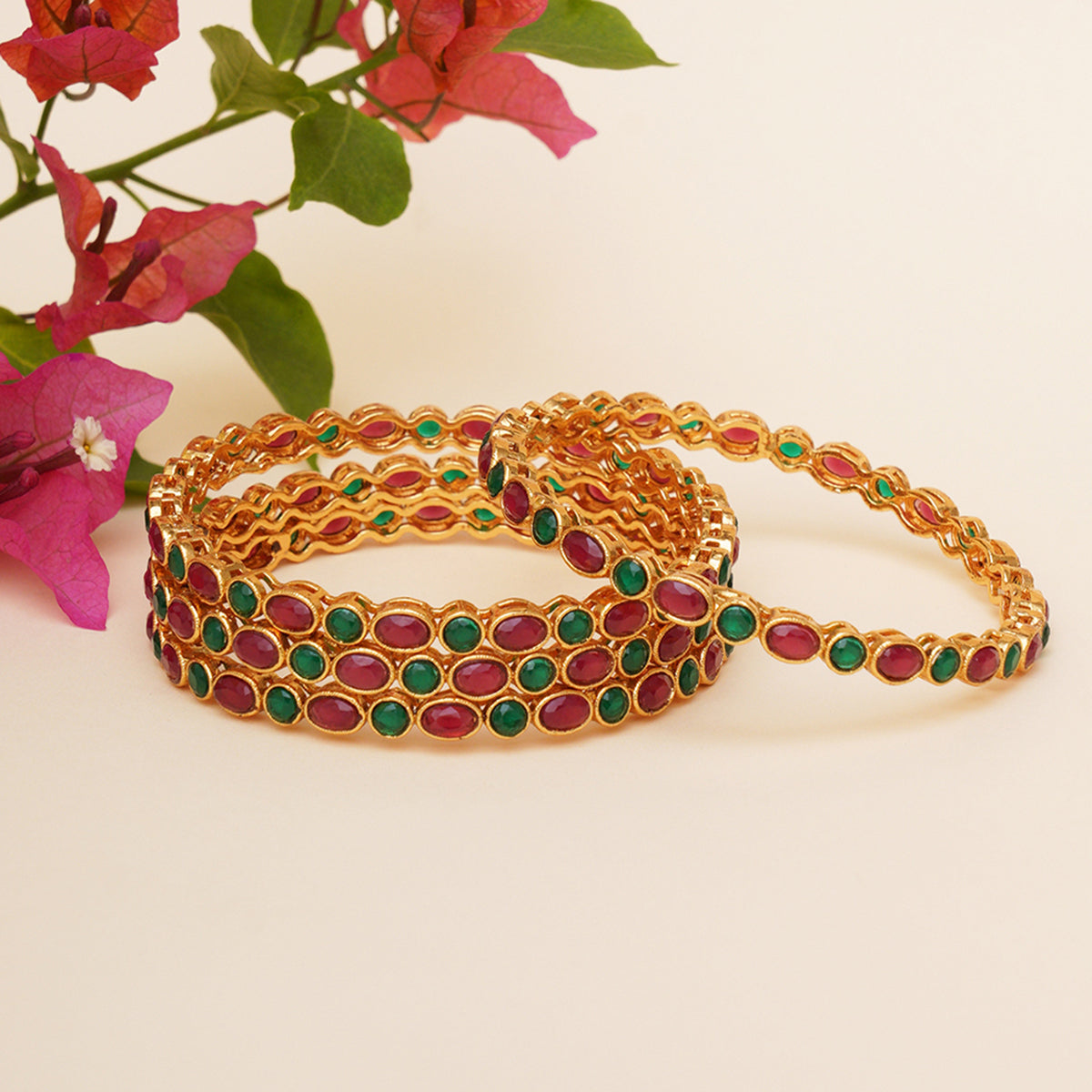 This handcrafted gold plated bangles with green and red motifs embellished in them, is a wardrobe essential for any go to traditional look. Pair it up with your lehenga and add that extra oomph to your look.
