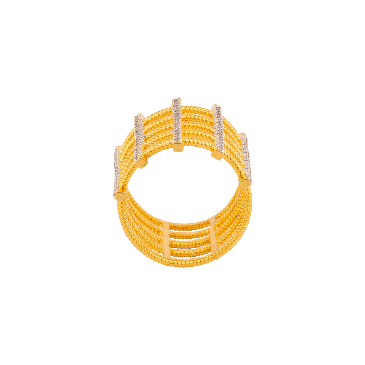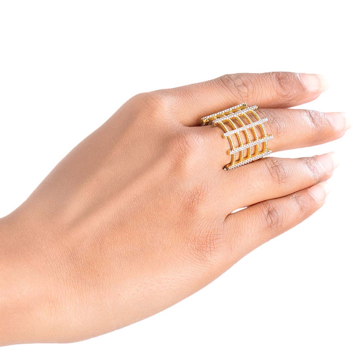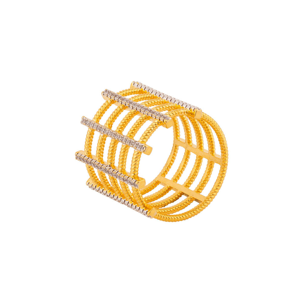 Brass cage ring with gemstones. Yellow gold plated. Pair with formal outfits.