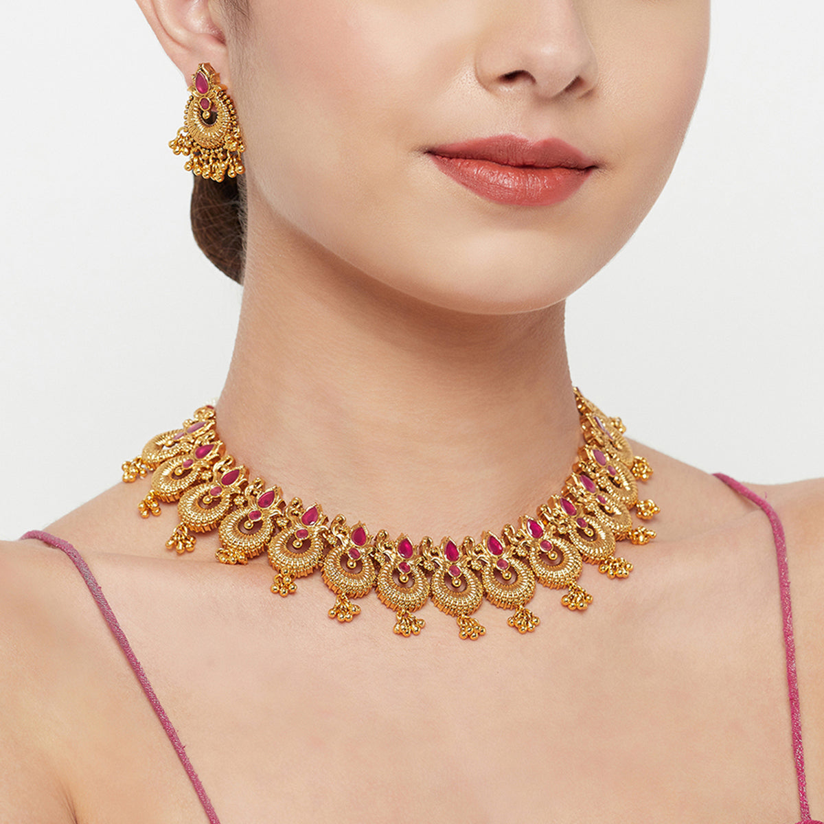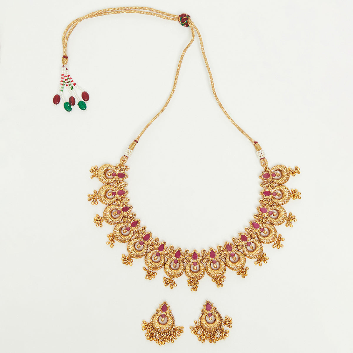 This handcrafted brass necklace set is a designer piece which will elevate your traditional look and will make heads turn at any event you go to. The gold plated jewllery is one of the most alluring designs we have for you. Grab it before its gone.