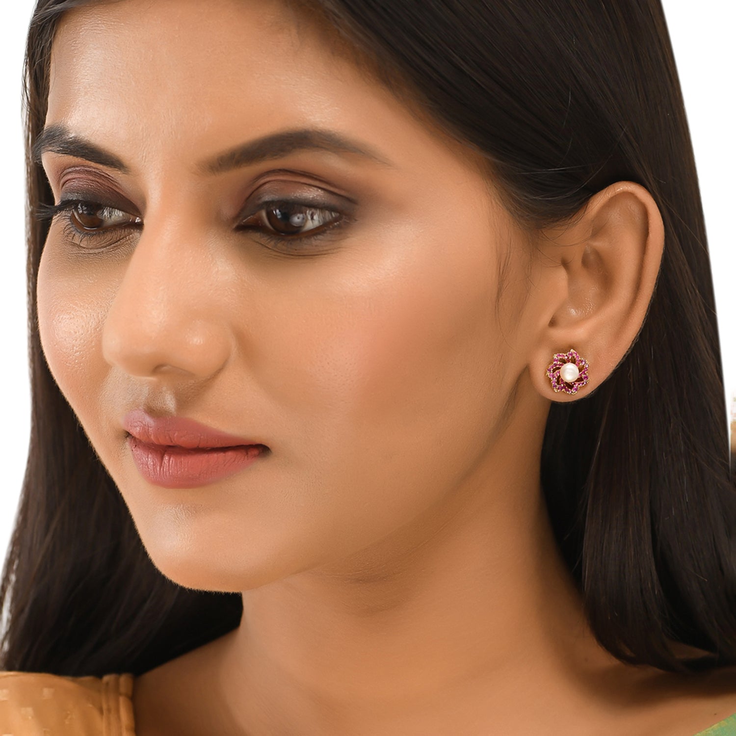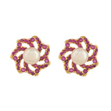 Floral stud earrings, made from brass and embellished with zircon gemstones and faux pearls. Gold plating adds to the charm of this pair, which will look splendid when worn with a summer dress.