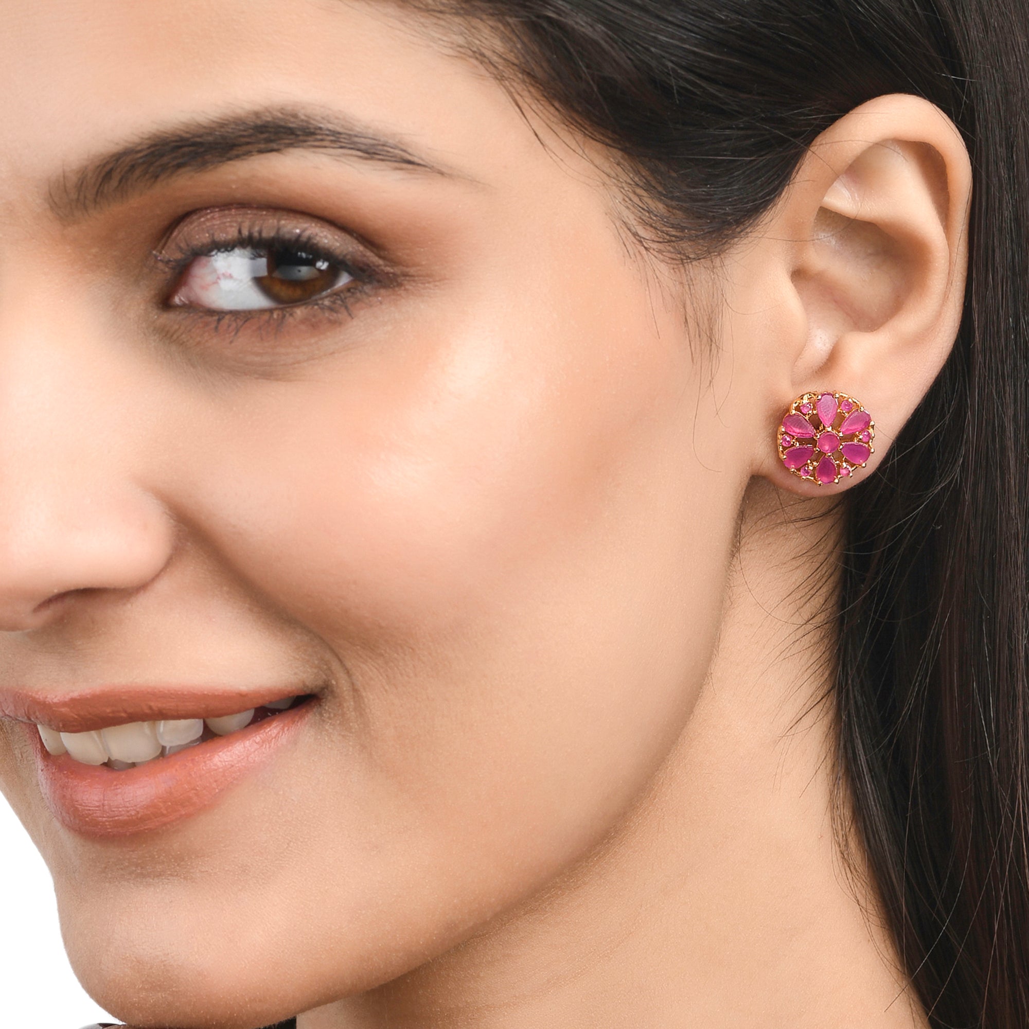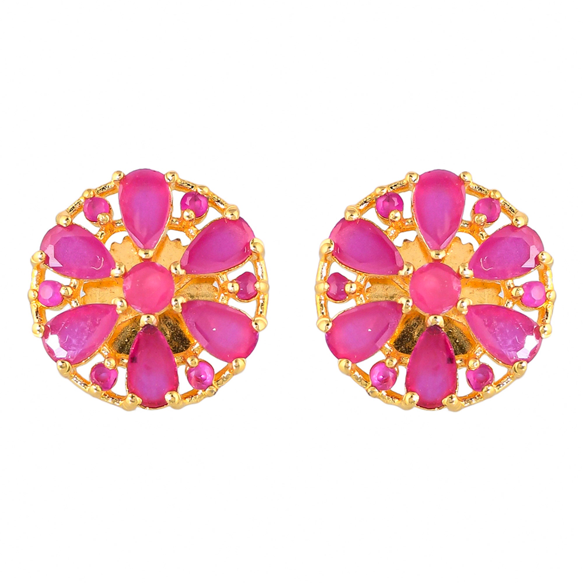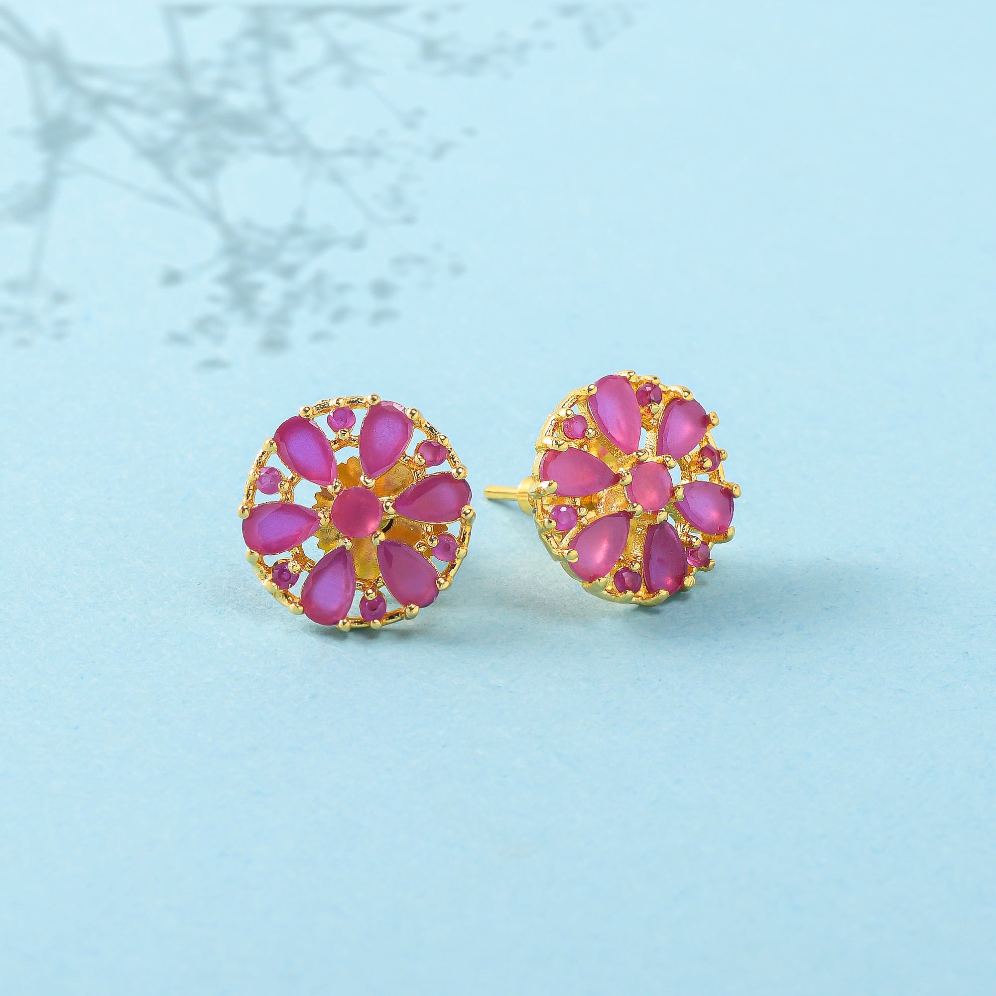 Teardrop and round cut pink CZ gems stud earrings. Made from brass and gold plated. Pair with casual attire.
