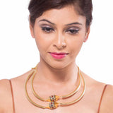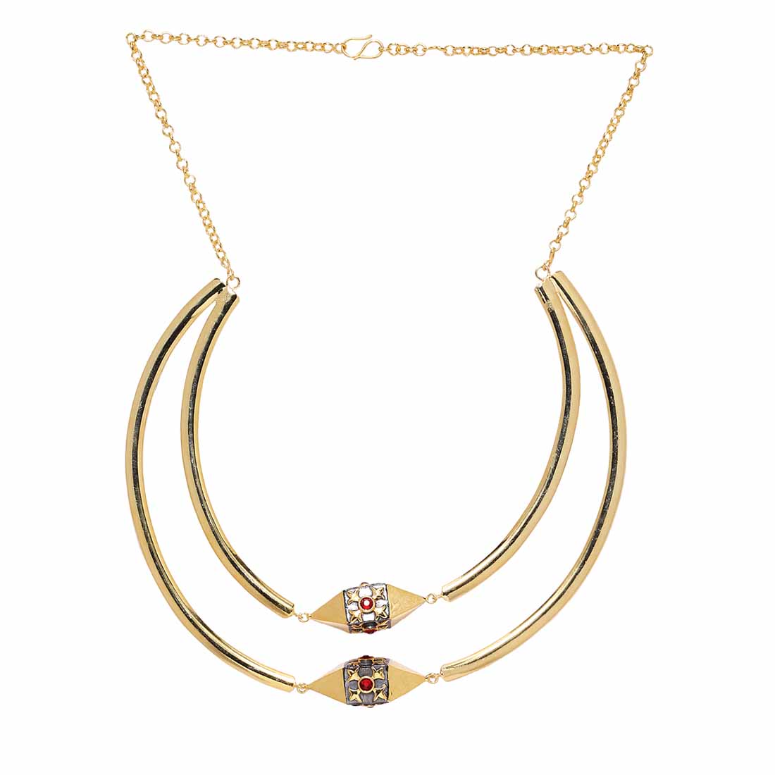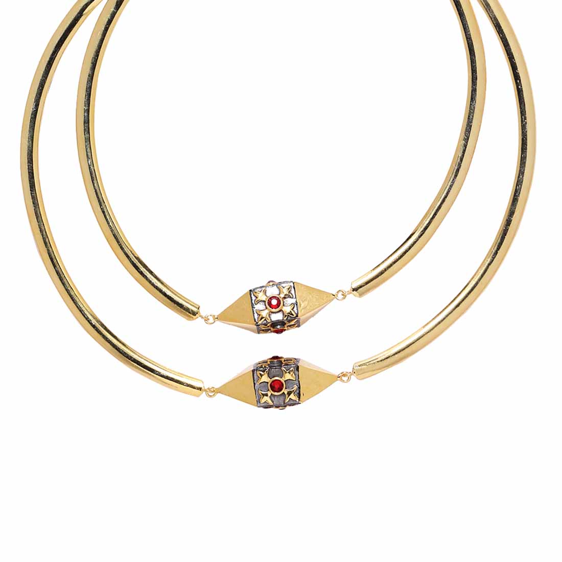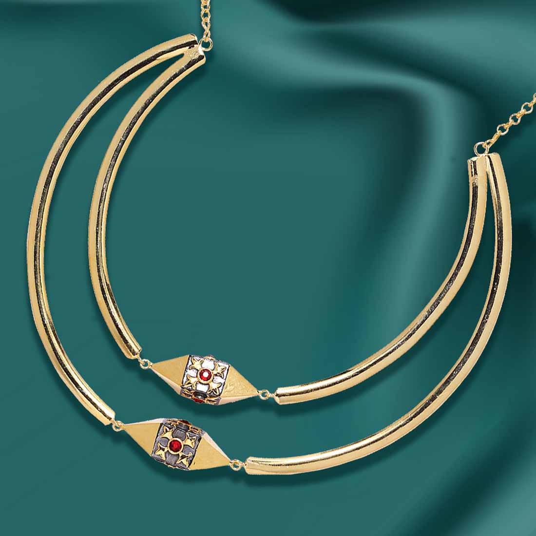 Classy and elegant, this round shaped necklace features an attractive and smooth design with red stone embellished dual tone beads adorned in the middle. Wear it on special occasion to get a charming look.