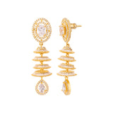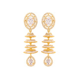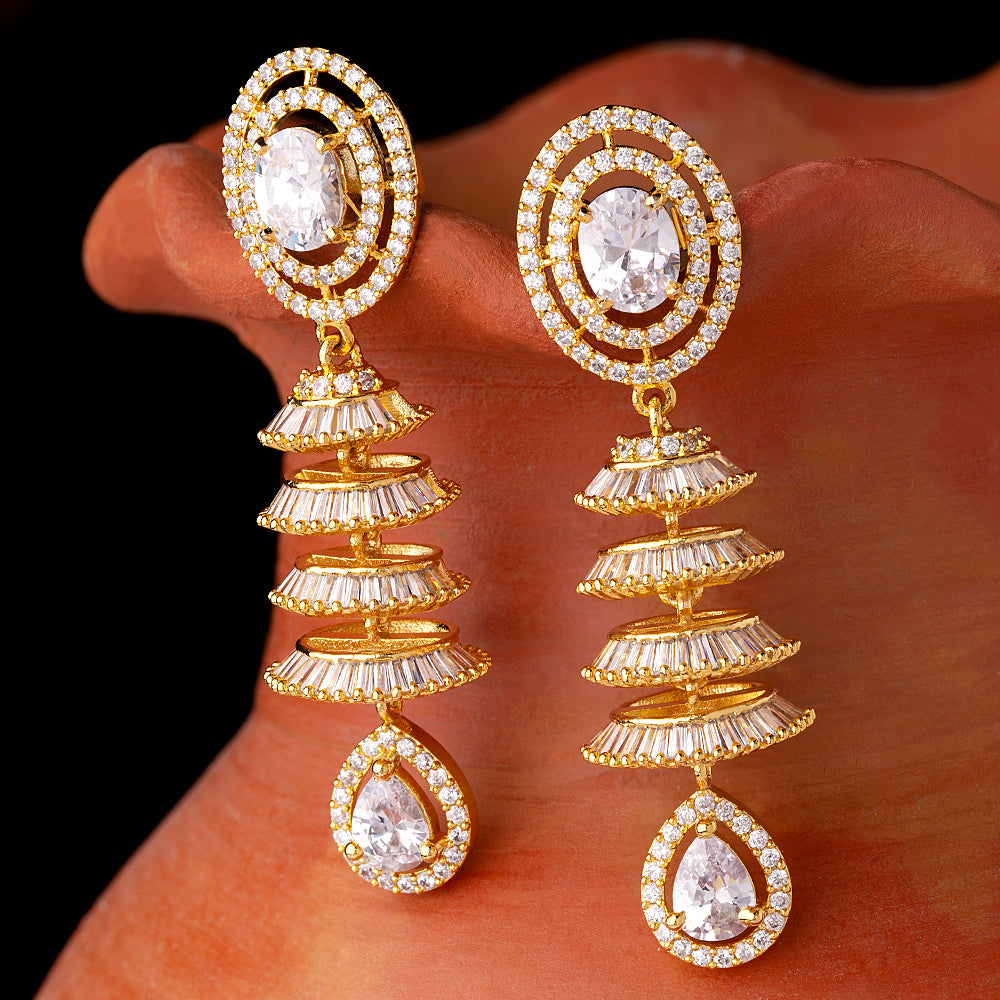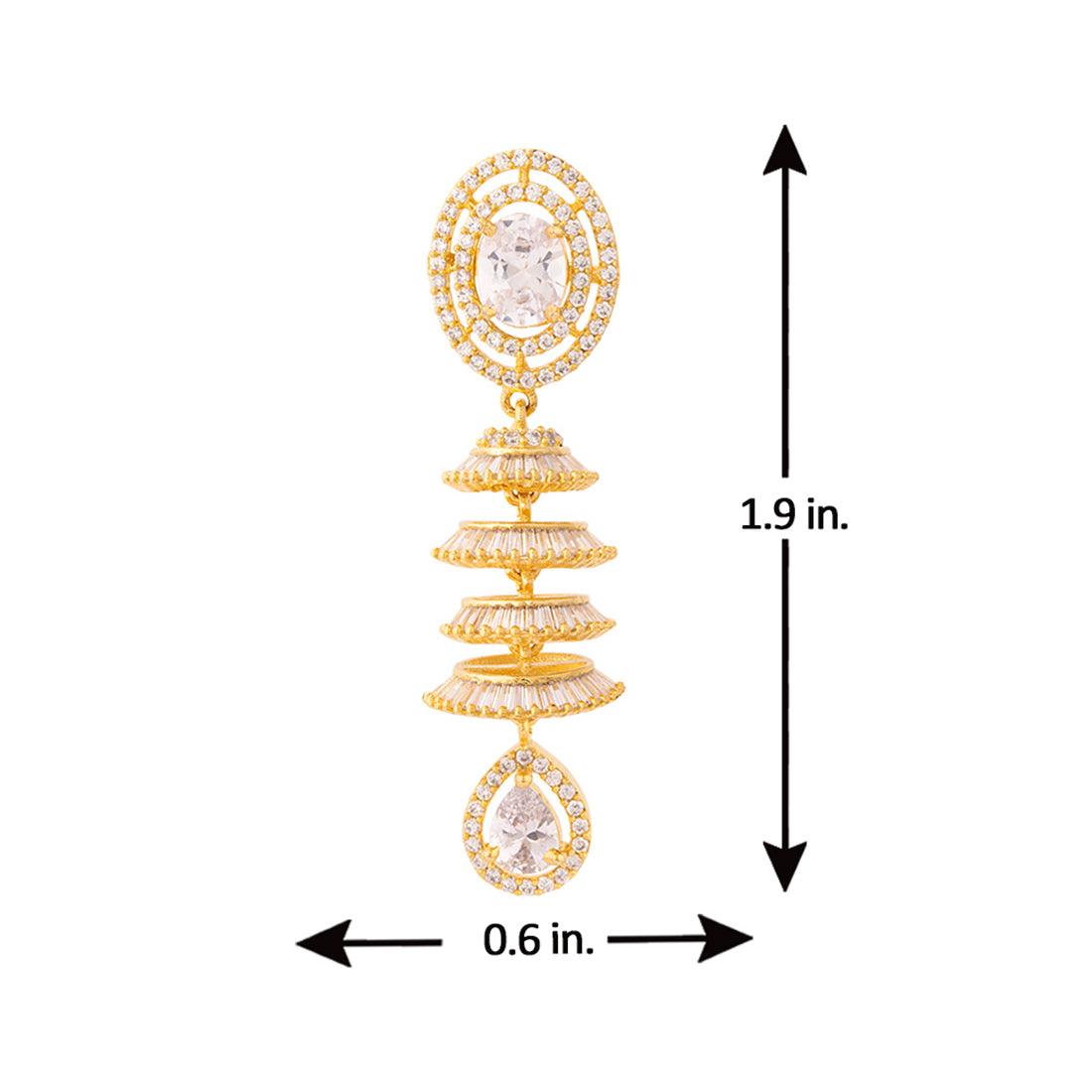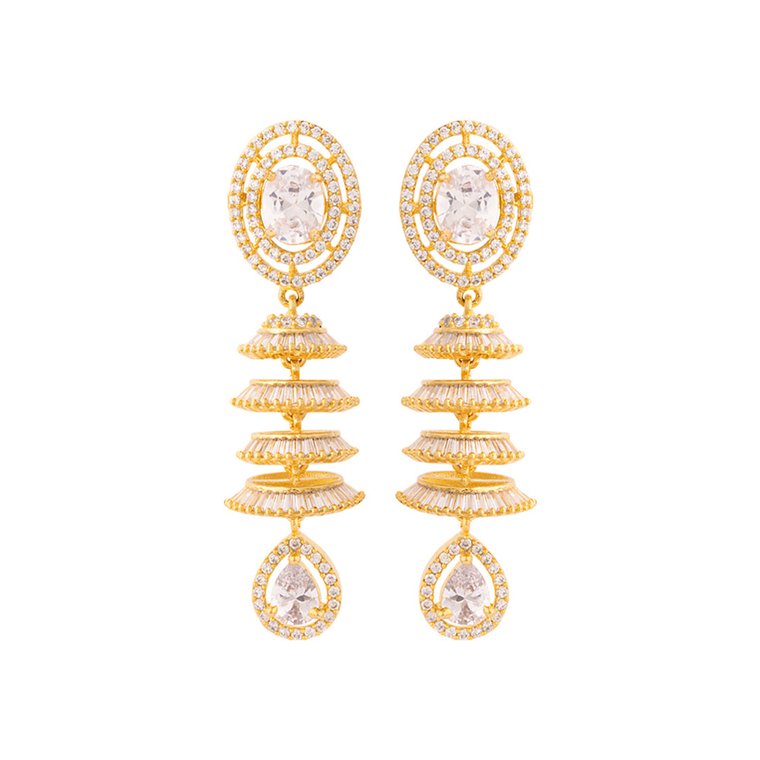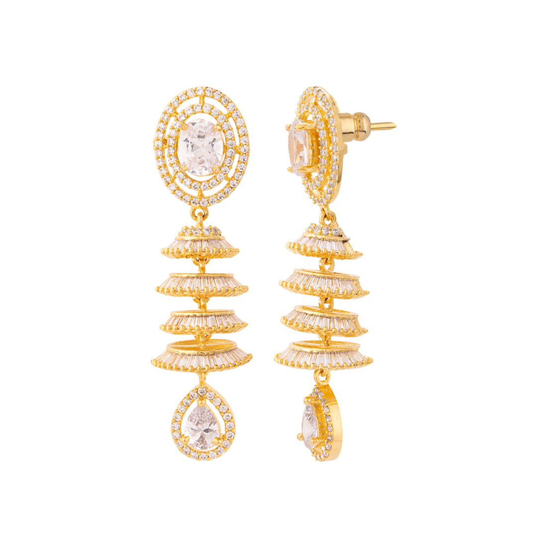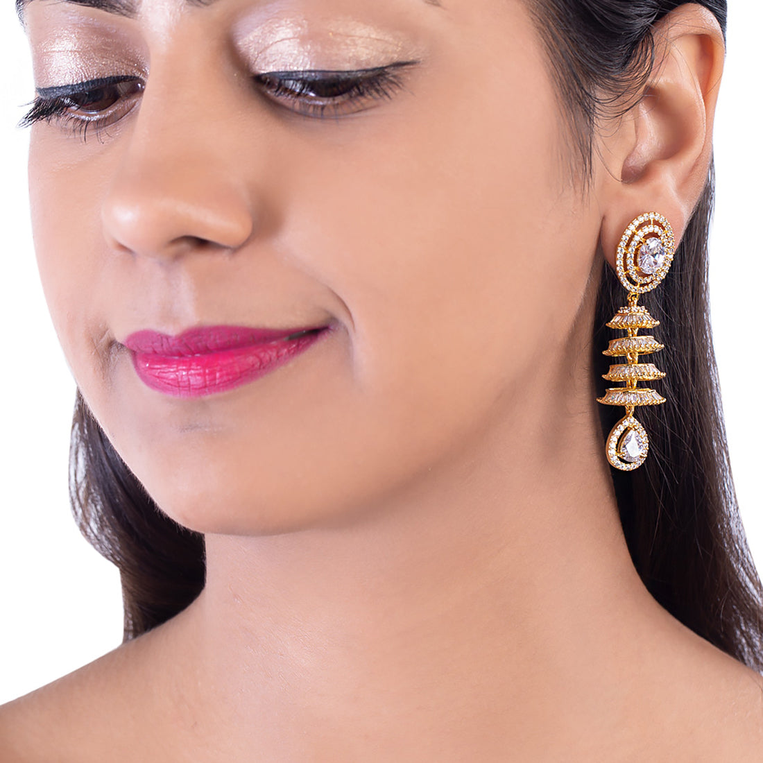 Drop earrings fashioned out of brass and yellow gold plated. Embellished with American Diamond gems. A good match for formal attire.