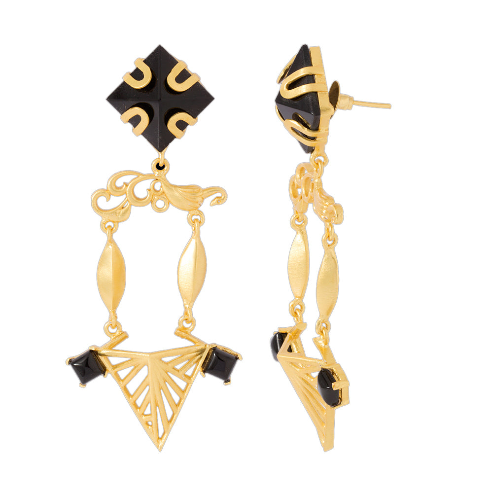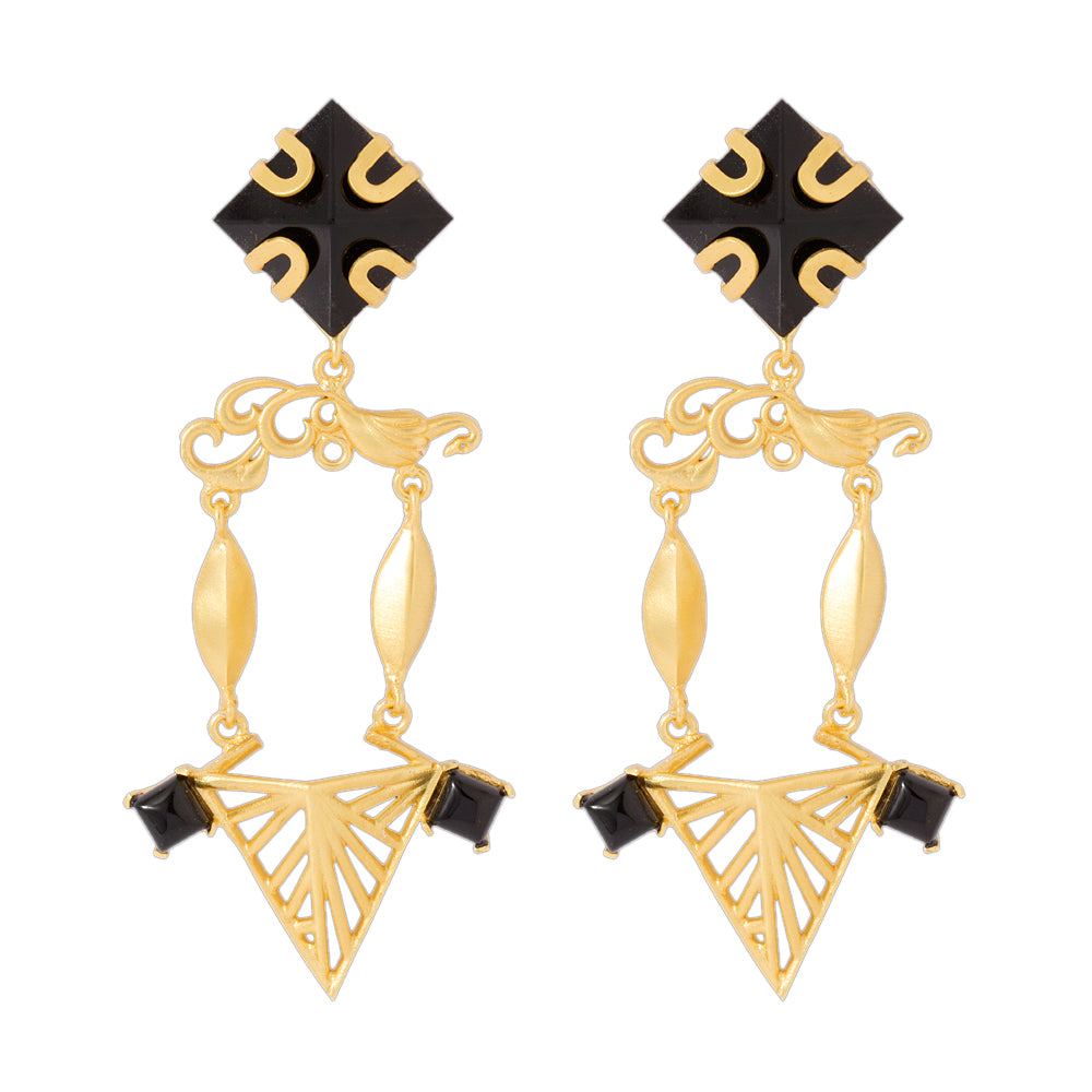 Edge up your look with this pair of gold-toned earrings. The unique geometric design with black stones set in attractive pattern is sure to turn all eyes on you. Wear it with ethnic or fusion wear.