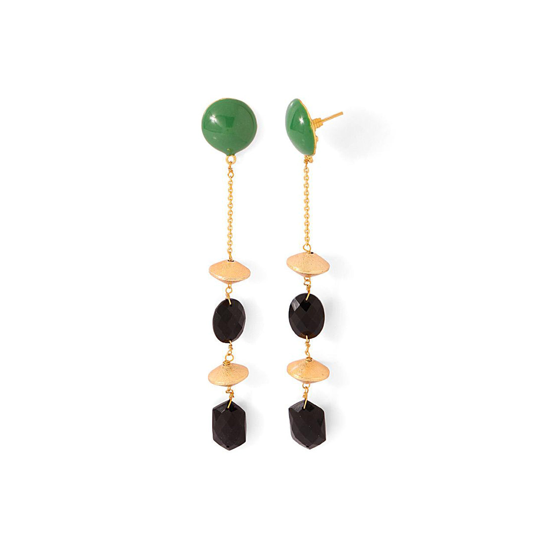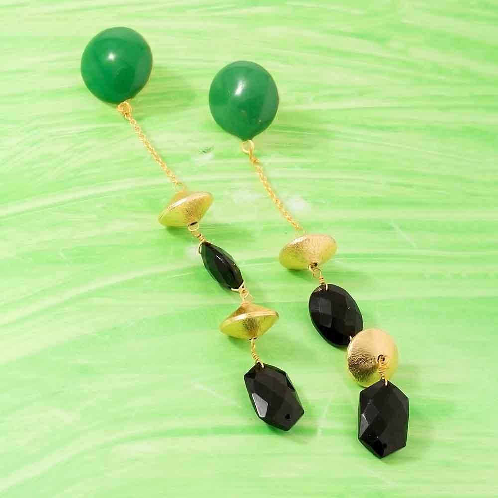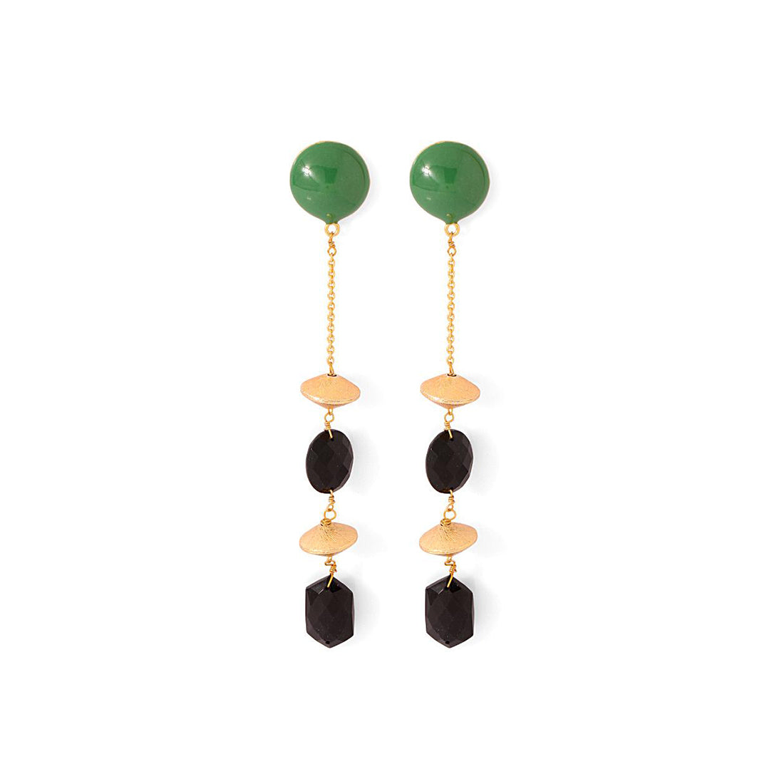 Superbly designed, these gold-toned dangler earrings are a unique pick for all fashionistas. The green enamel finish and black stone dangling will add a breathtaking aura to your ensemble. Wear this versatile piece with anything!