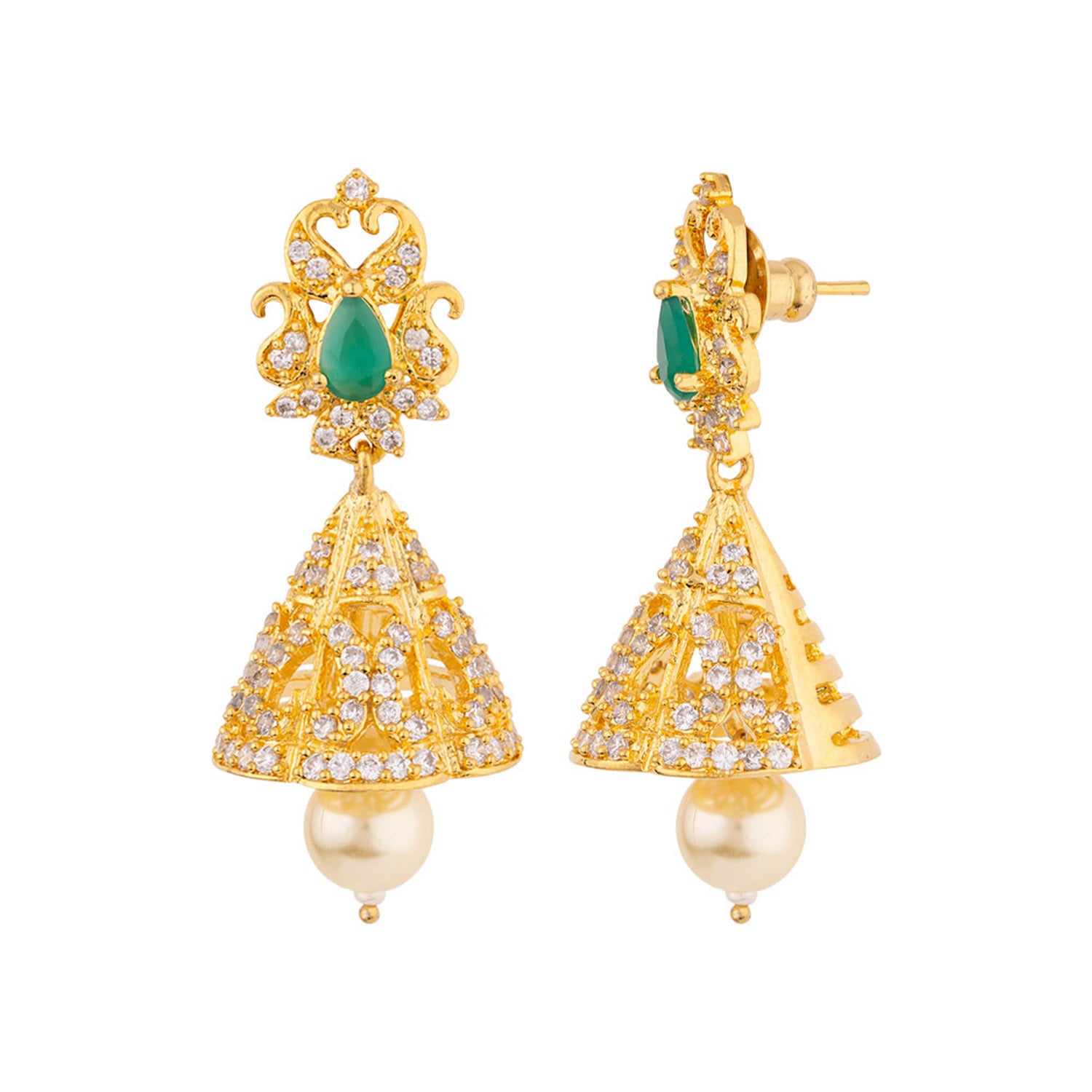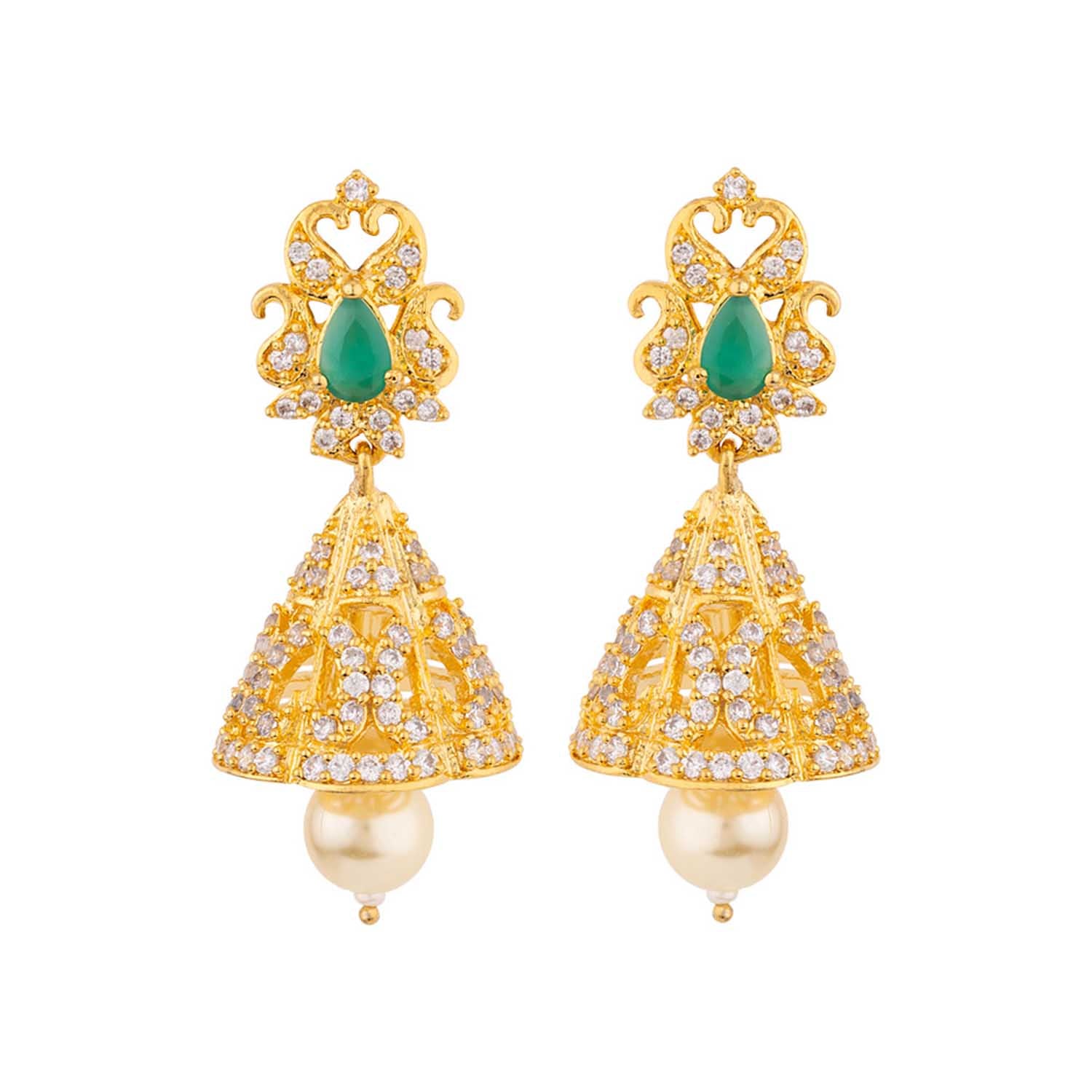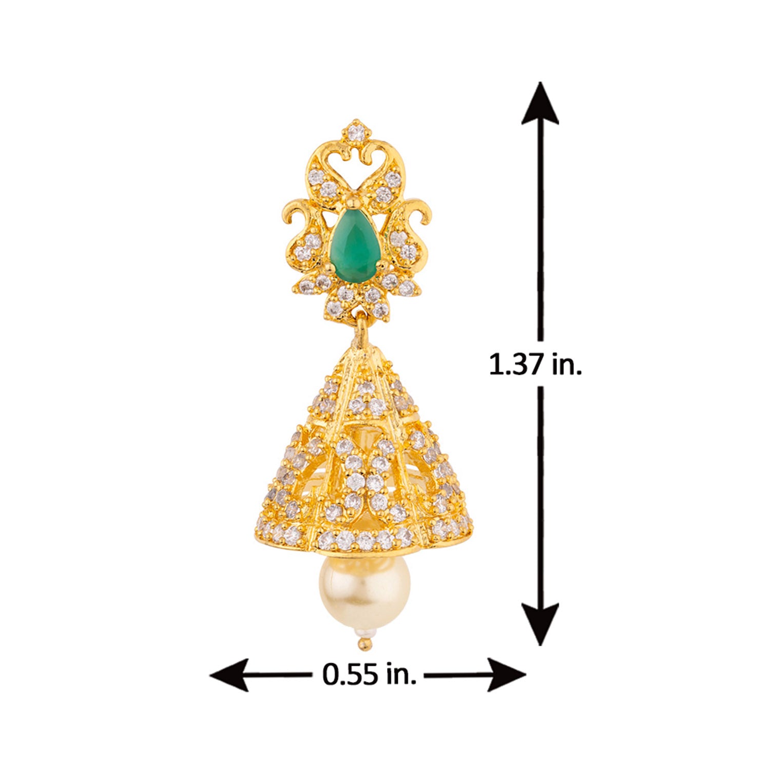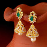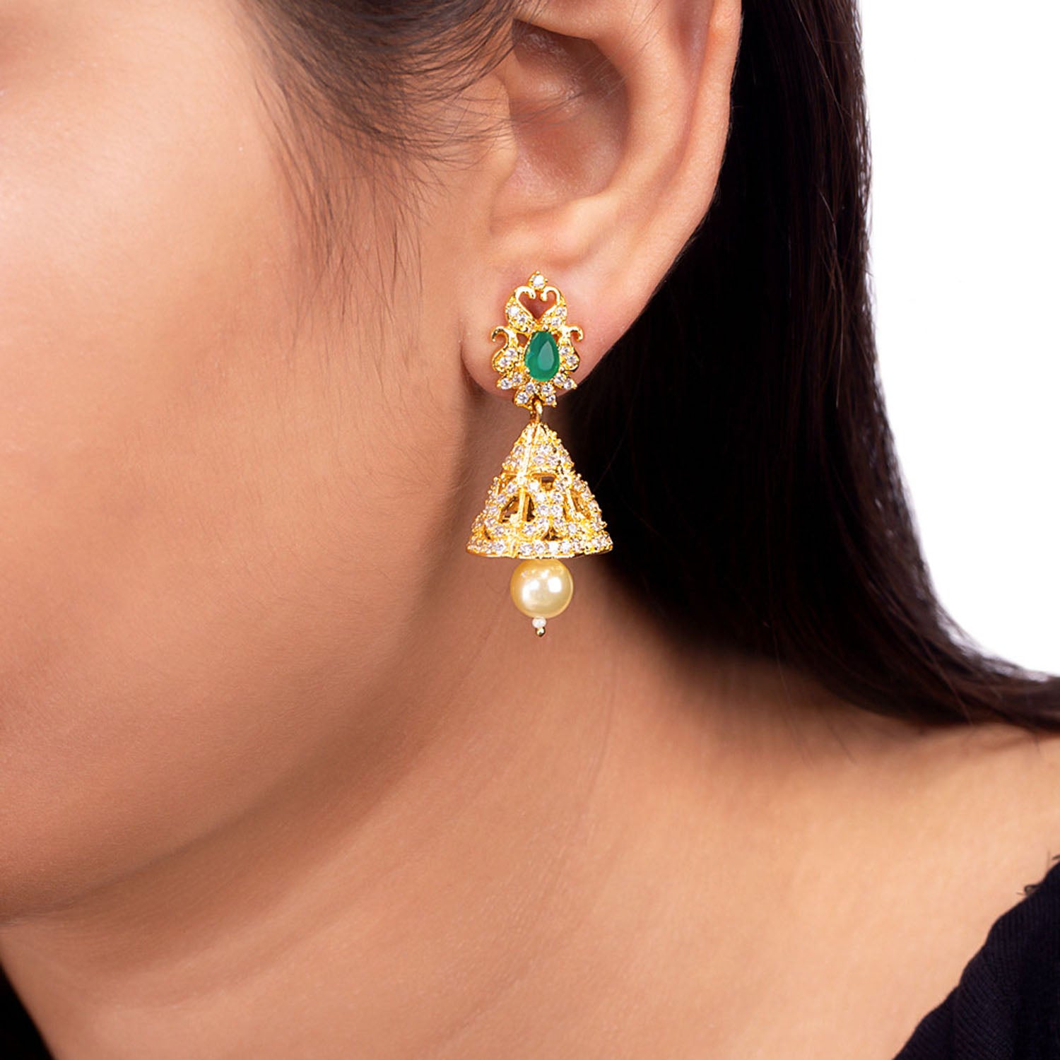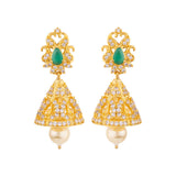 Gold toned ethnic jhumka earrings with yellow gold plating. Embellished with American Diamond gems and faux pearls. Wear with Indian attire.