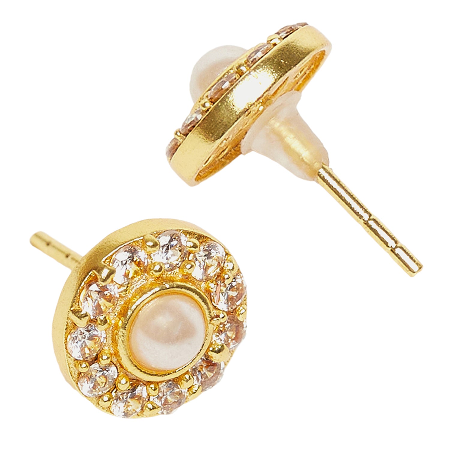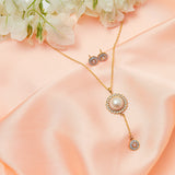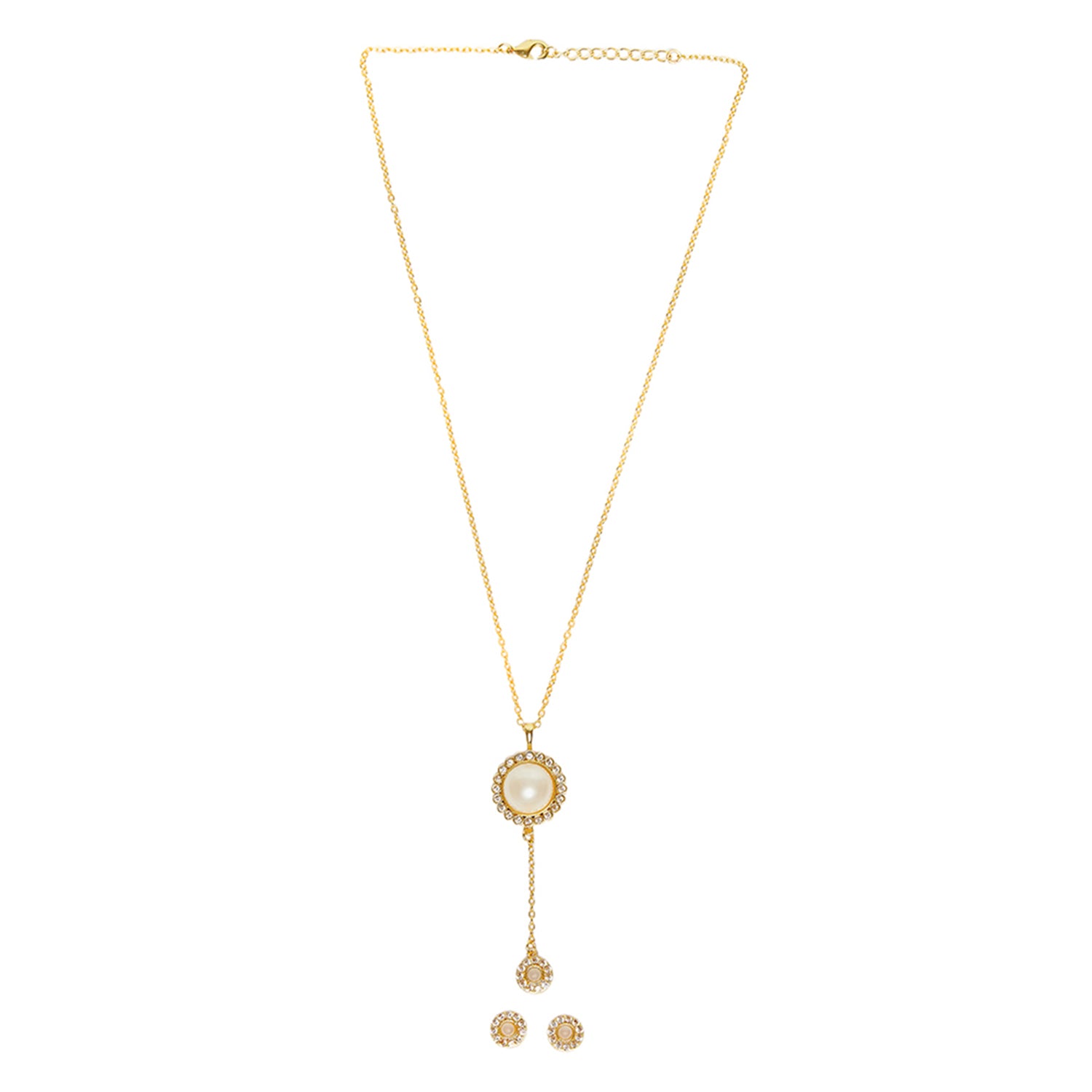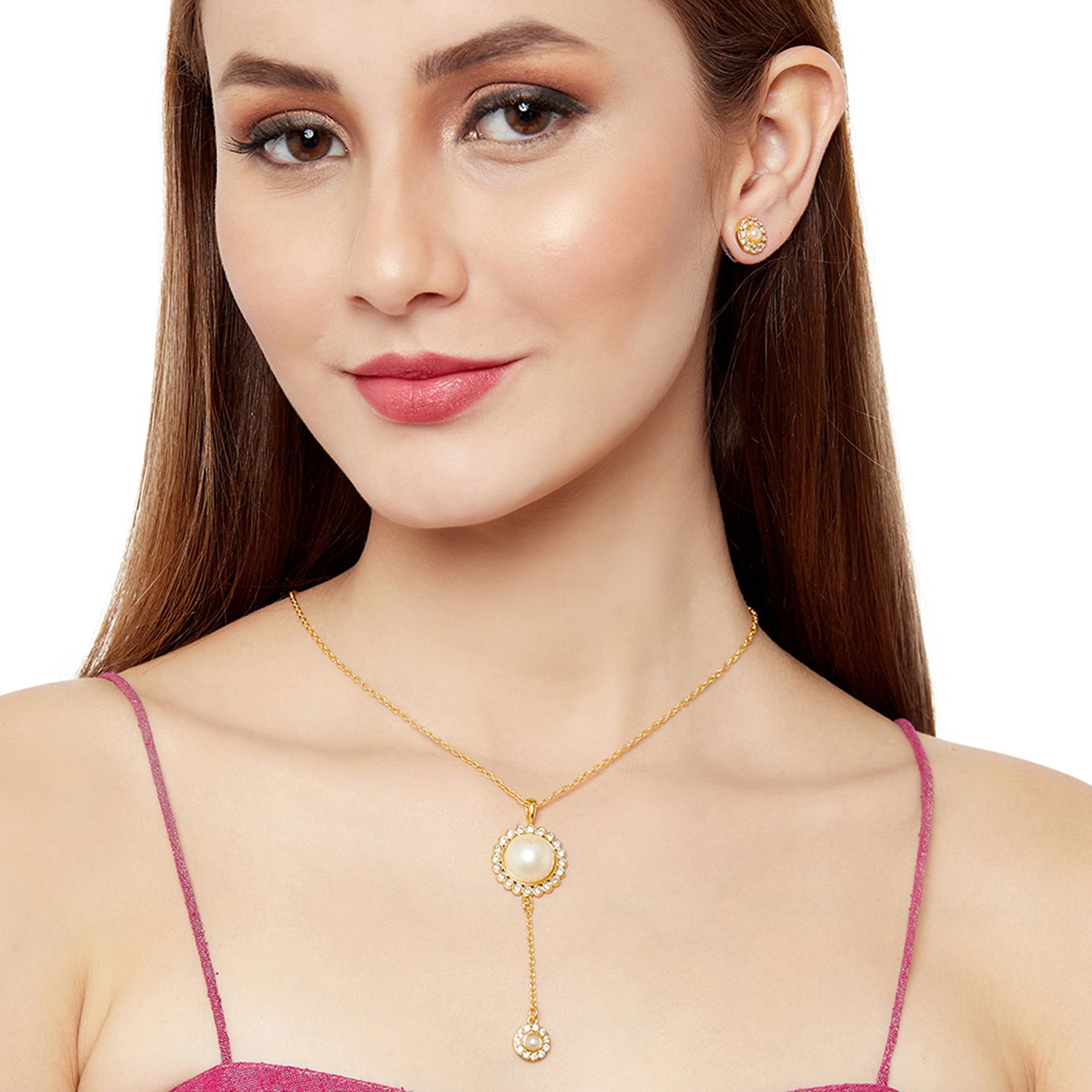 Add more grace to your feminine look through this eye-catching gold toned pendant set embellished with CZ sparkles and studded with pearl beads. Add an instant glamour to your overall look with this vibrant necklace piece that will fetch you lovely compliments.