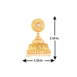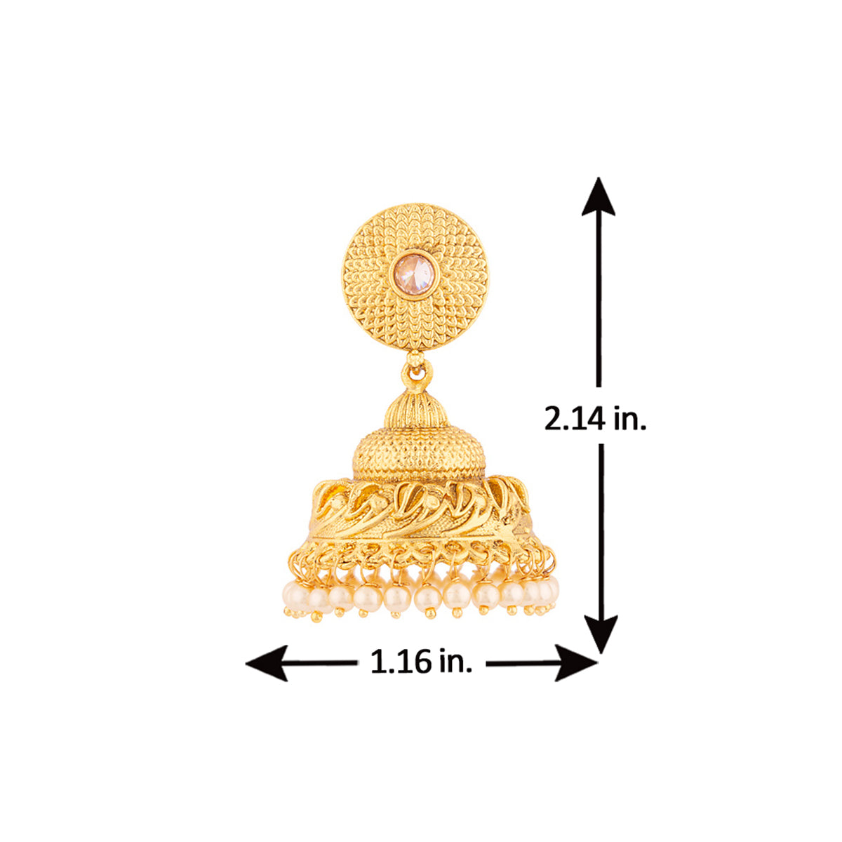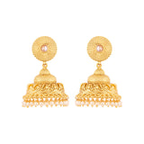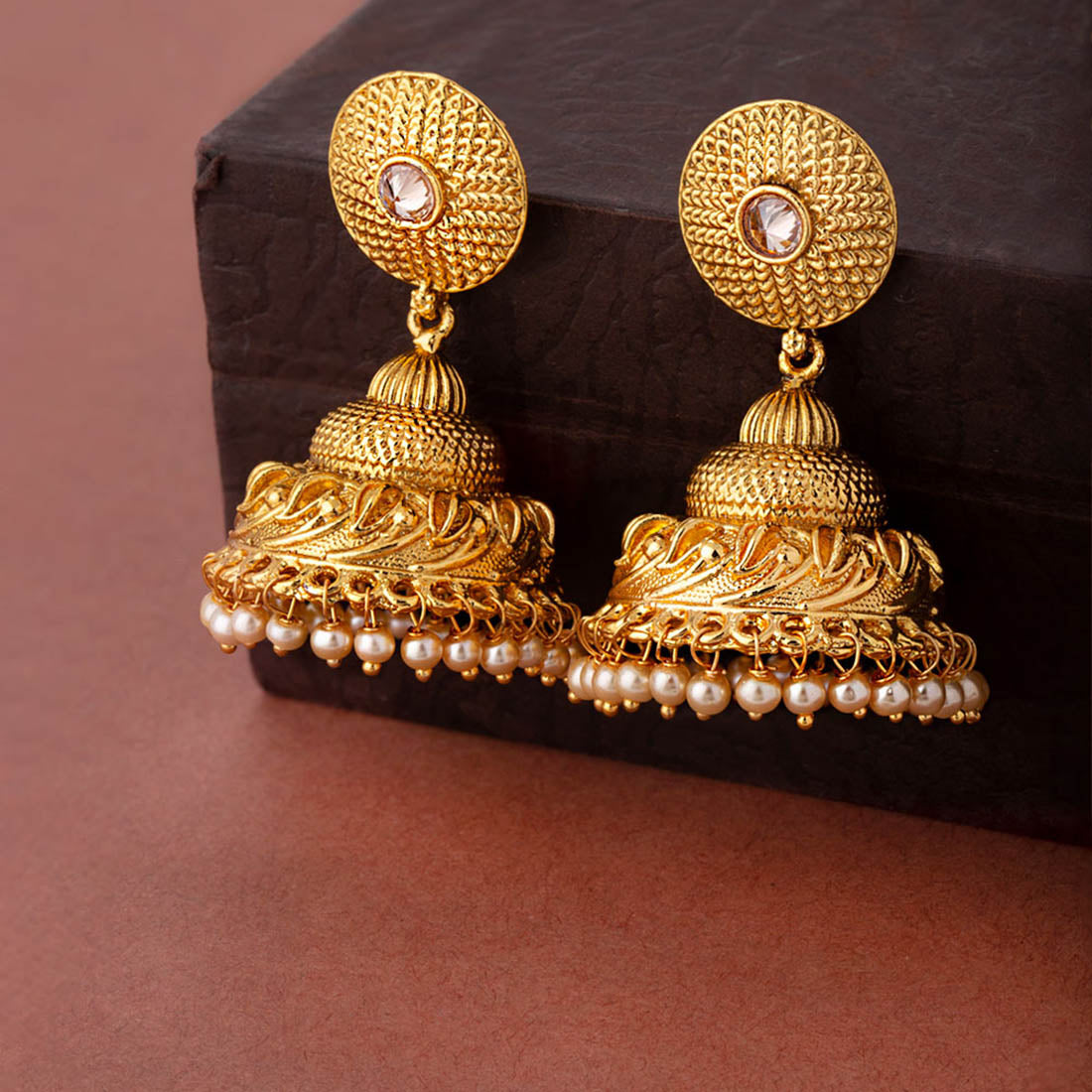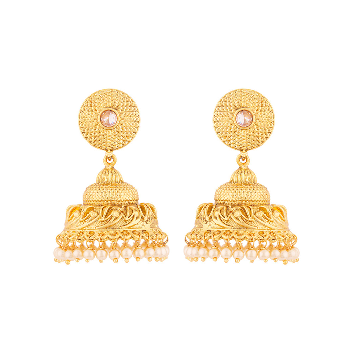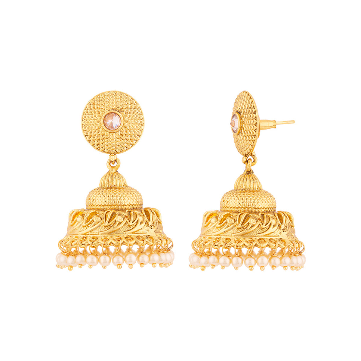 Traditional jhumka drop earrings, lightly embellished and made from brass. Yellow gold plated and good for ethnic looks.
