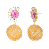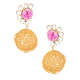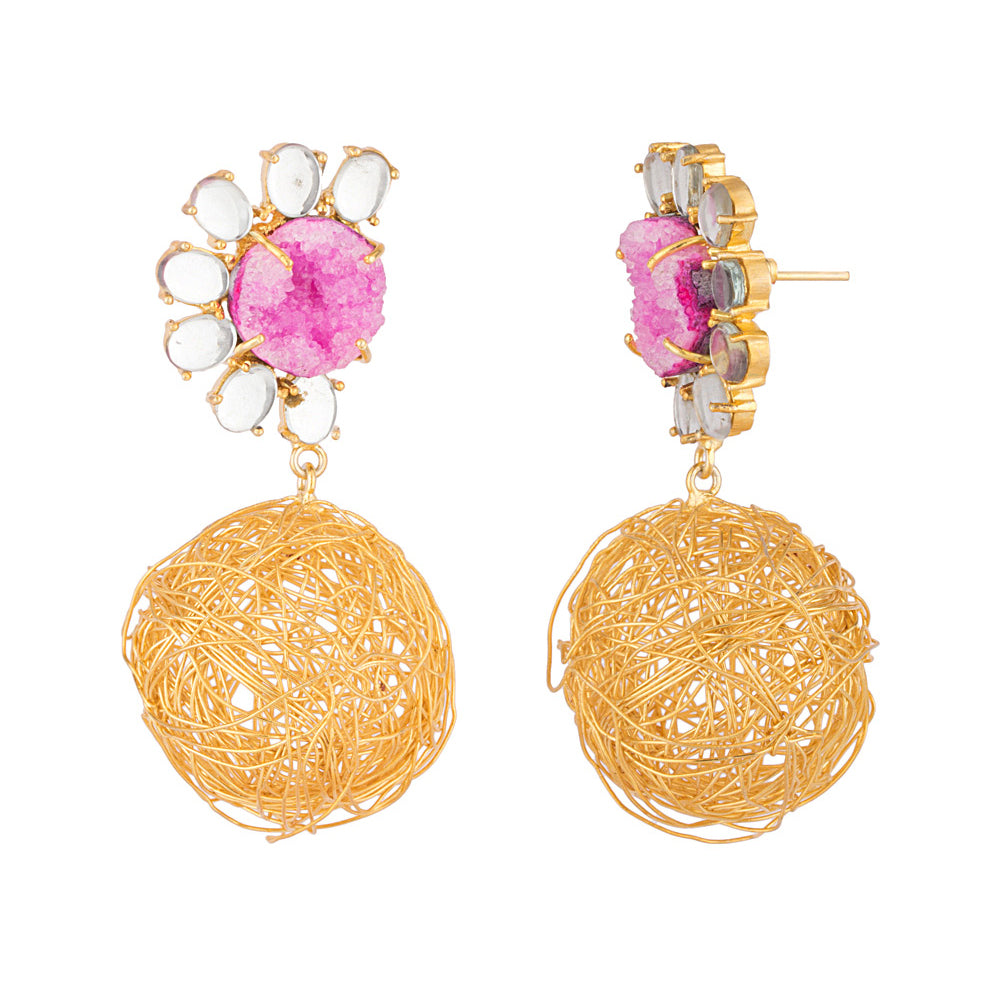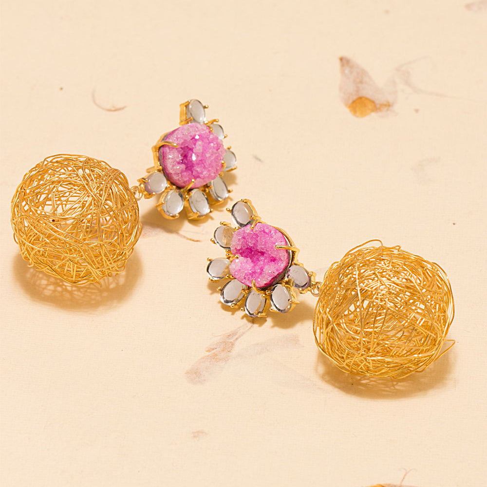 Golden Ball Drops Dangler Earrings Decked With Pink Druzy