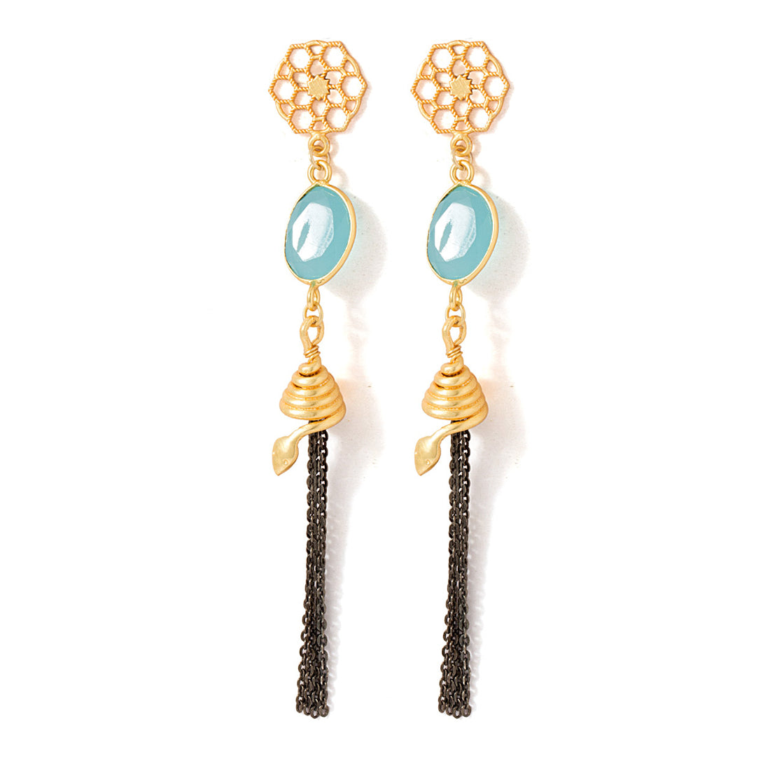 Golden Dangler Earrings Studded With Aqua Blue Stones