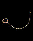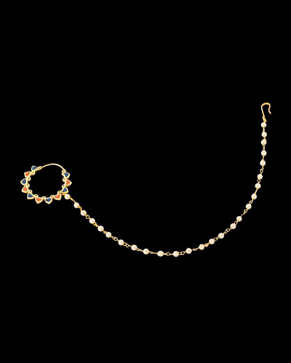 Complete your traditional look through wearing this golden nose-pin rimmed with pearl beads that is specially designed to elate your divine beauty on those special occasions. Make your moment memorable with this exquisite collection of jewel.