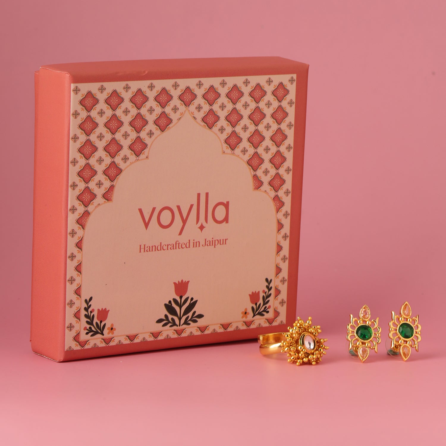 Celebrate love in its most radiant form with the Golden Promise Valentine Jewellery Hamper, a thoughtfully curated jewellery gift set designed to make Valentine’s moments truly unforgettable. Crafted in premium brass with yellow gold plating, this elegant jewellery combo brings together statement earrings and a beautifully detailed ring, creating a perfect balance of glamour, romance and everyday wearability. Inspired by the warmth of love and the glow of gold, this hamper is designed for women who appreciate jewellery that feels special yet timeless. The rich gold finish paired with sparkling American diamond accents adds a luxurious touch, making this jewellery combo perfect for romantic gifting, proposals, anniversaries and Valentine’s Day surprises. Whether you are celebrating a new beginning or a lasting bond, this Valentine jewellery gift set turns your emotions into something she can wear and cherish. Beautifully presented and ready to gift, the Golden Heart Valentine Jewellery Hamper is an ideal choice for girlfriends, wives and partners who love elegant jewellery with emotional meaning.