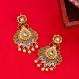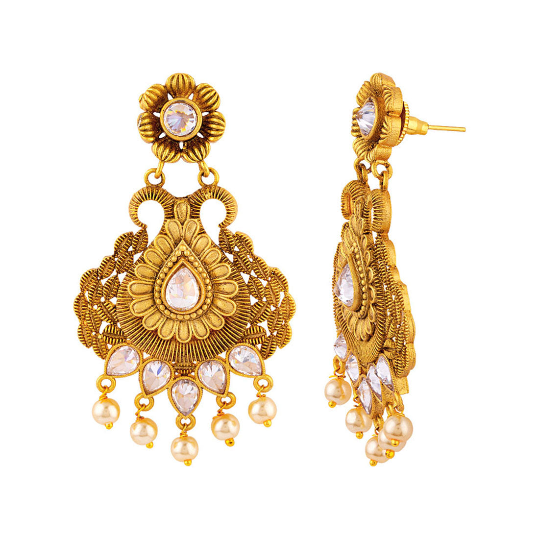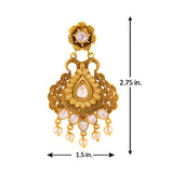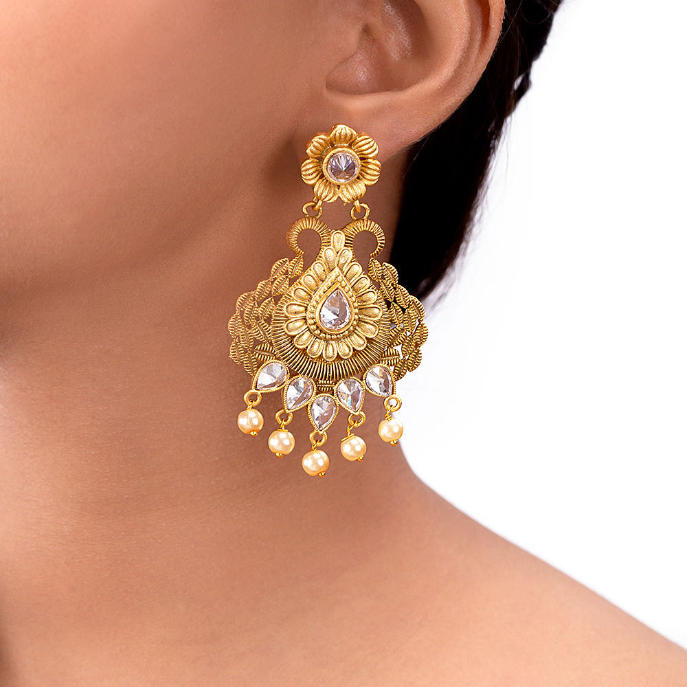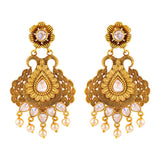 Antique jewelry inspired drop earrings, made from brass and yellow gold plated. Gems and faux pearls embellished. Wear with a traditional saree.