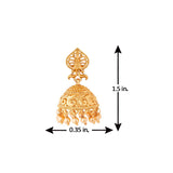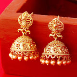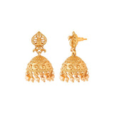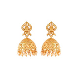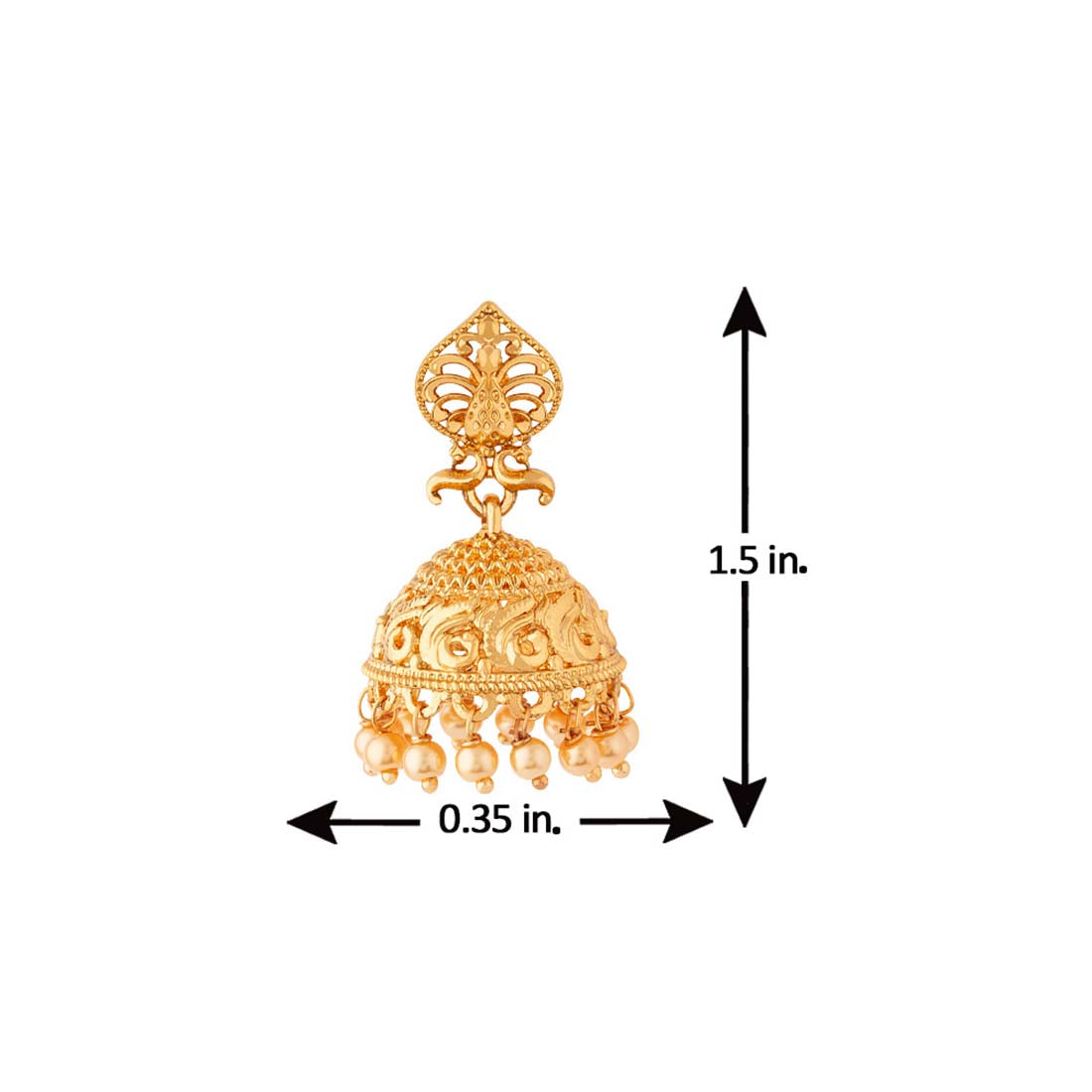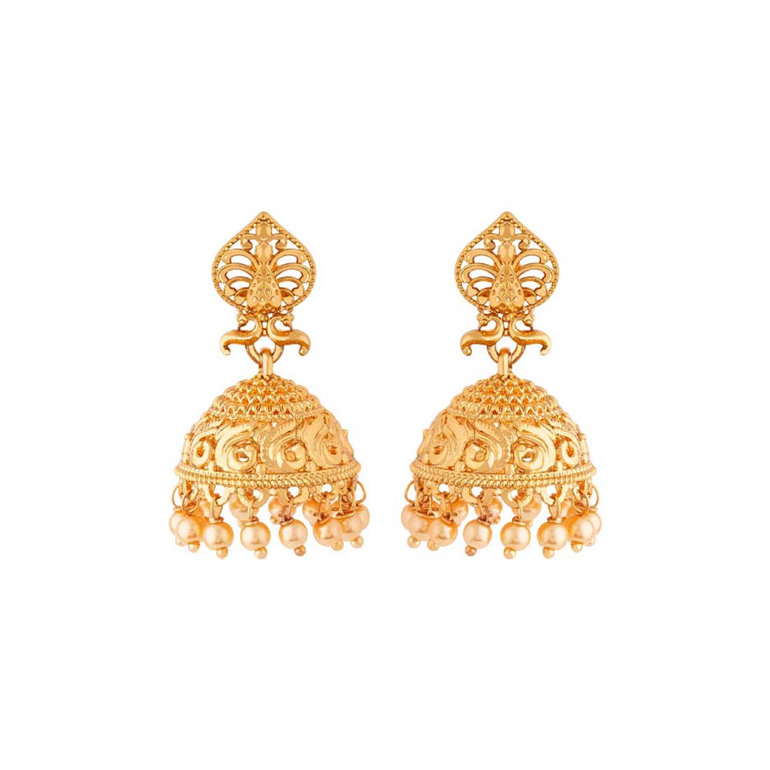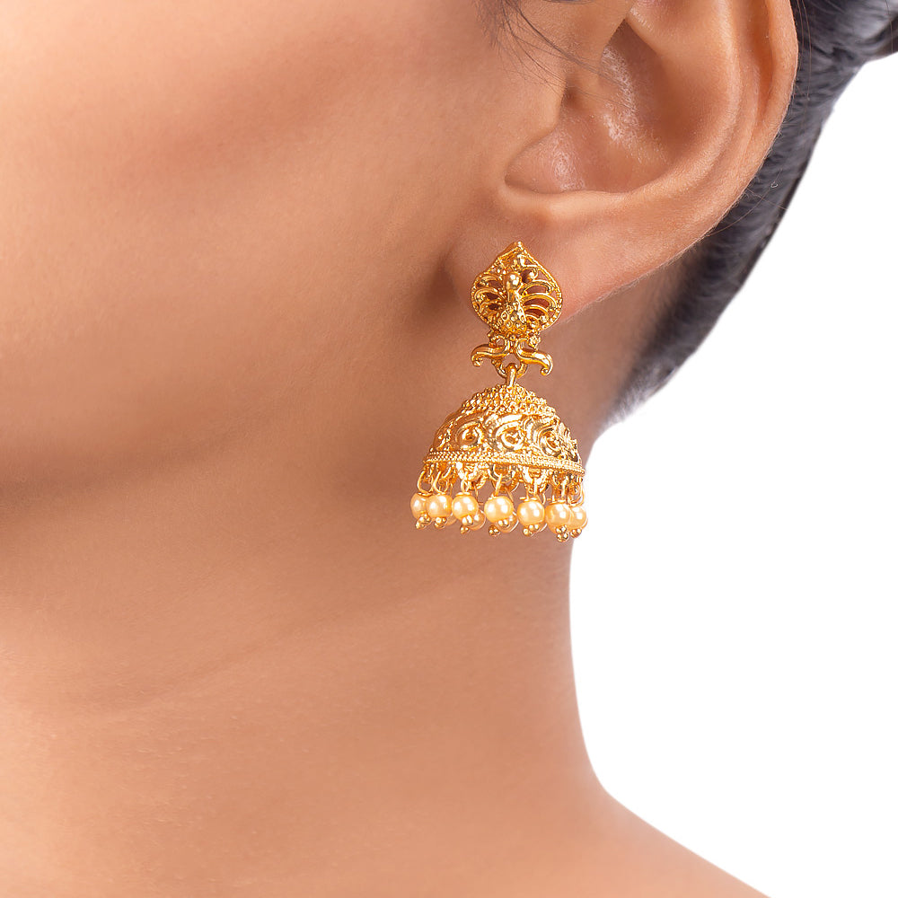 Faux pearls and gems adorned jhumka earrings. Yellow gold plated and fashioned out of brass. Good match for casual ethnic looks.
