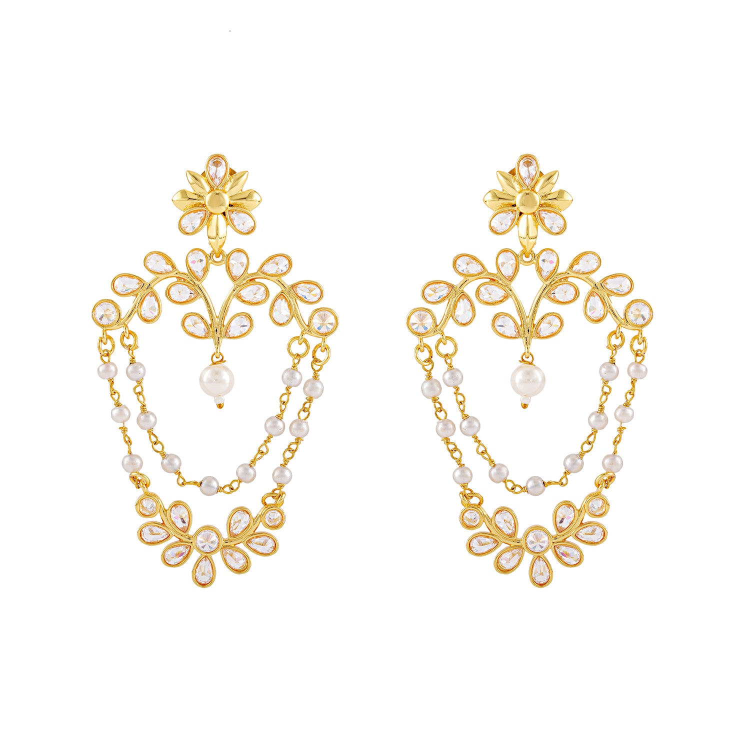 Add a touch of royal elegance to your festive look with the Gota Patti Shahi Jhalar Earrings. Handcrafted in premium brass, these statement dangler earrings feature a leafy motif adorned with sparkling reverse AD stones, strung with delicate pearl chains that drape gracefully like a jhalar. A single pearl drop at the center adds sophistication and charm, making them a perfect balance of tradition and modern chic. Inspired by Rajasthan’s Gota Patti artistry, these earrings embody the grandeur of royal celebrations. Designed as versatile festive statement earrings, they are ideal for weddings, poojas, and cultural festivities. Lightweight yet impactful, the Shahi Jhalar Earrings also make for an unforgettable jewellery gift for women, a timeless gift for her, a festive delight for a sister, or a cute gift for girlfriend who loves stylish earrings with a royal story.