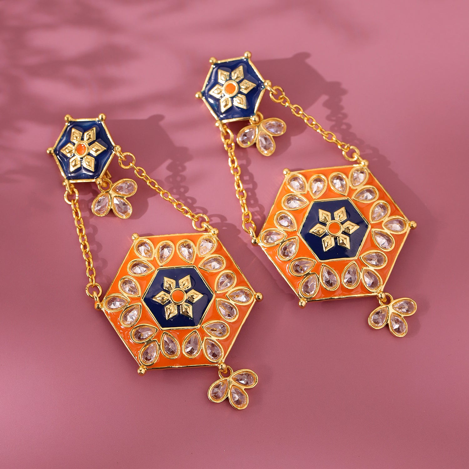 Bring home the grandeur of royal palaces with the Gota Patti Shahi Jharokha Baaliyan Earrings. Handcrafted in fine brass, these majestic dangler earrings are designed in a bold hexagonal shape, with deep navy enamel at the center, fiery orange enamel on the frame, and sparkling reverse AD stones forming a radiant border. The design is finished with delicate chain detailing and floral stone danglers that add graceful movement to every step. Inspired by the ornate windows and arches of Rajasthan’s royal havelis, these enameled ethnic earrings are a true statement of heritage and modernity combined. Perfect as wedding enamel earrings, festive statement earrings, or even elegant pooja earrings for women, they’re designed to light up celebrations with unmatched elegance. Their striking color palette and bold structure make them a must-have for the festive season. And with their thoughtful craftsmanship, they also double as a timeless jewellery gift for women, an unforgettable gift for her, a festive surprise for your sister, or a cute gift for girlfriend who loves jewellery with a royal twist.