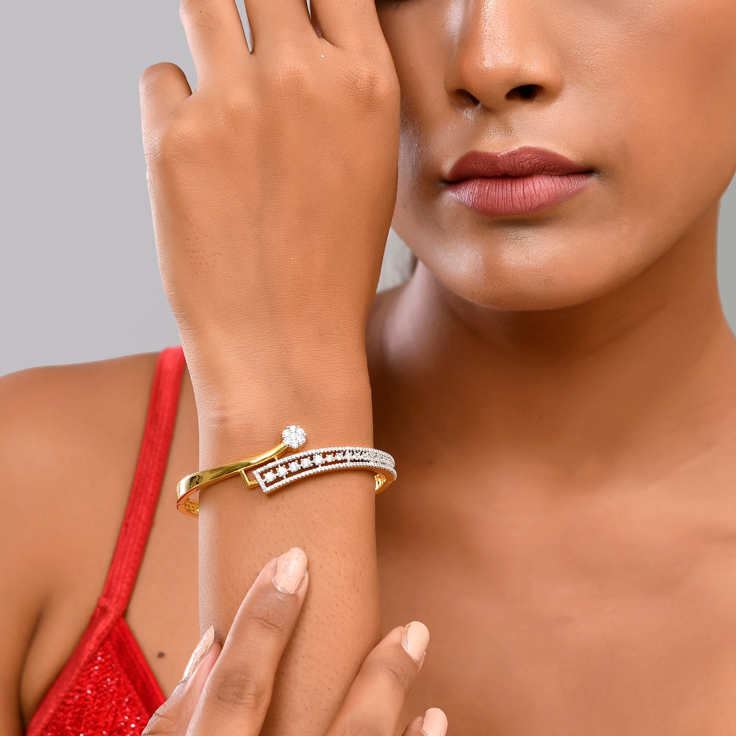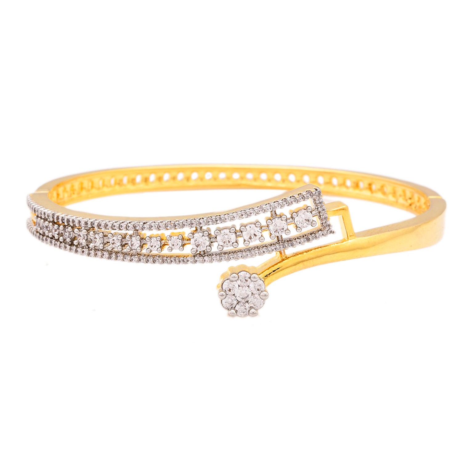 Celebrate the festive season with this exquisite Voylla American Diamond Bracelet, designed to add a touch of elegance to any outfit. Crafted from high-quality brass and plated with gold, this bracelet features sparkling cubic zirconia stones that mimic the brilliance of real diamonds. The intricate design showcases a blend of traditional and contemporary styles, making it perfect for Navratri, Diwali, Durga Puja, Rakshabandhan, and other festive occasions. This bracelet is an ideal gift for women, whether it's for a wife, sister, girlfriend, mother, or friend. Elevate your festive look with this stunning piece from Voylla.