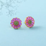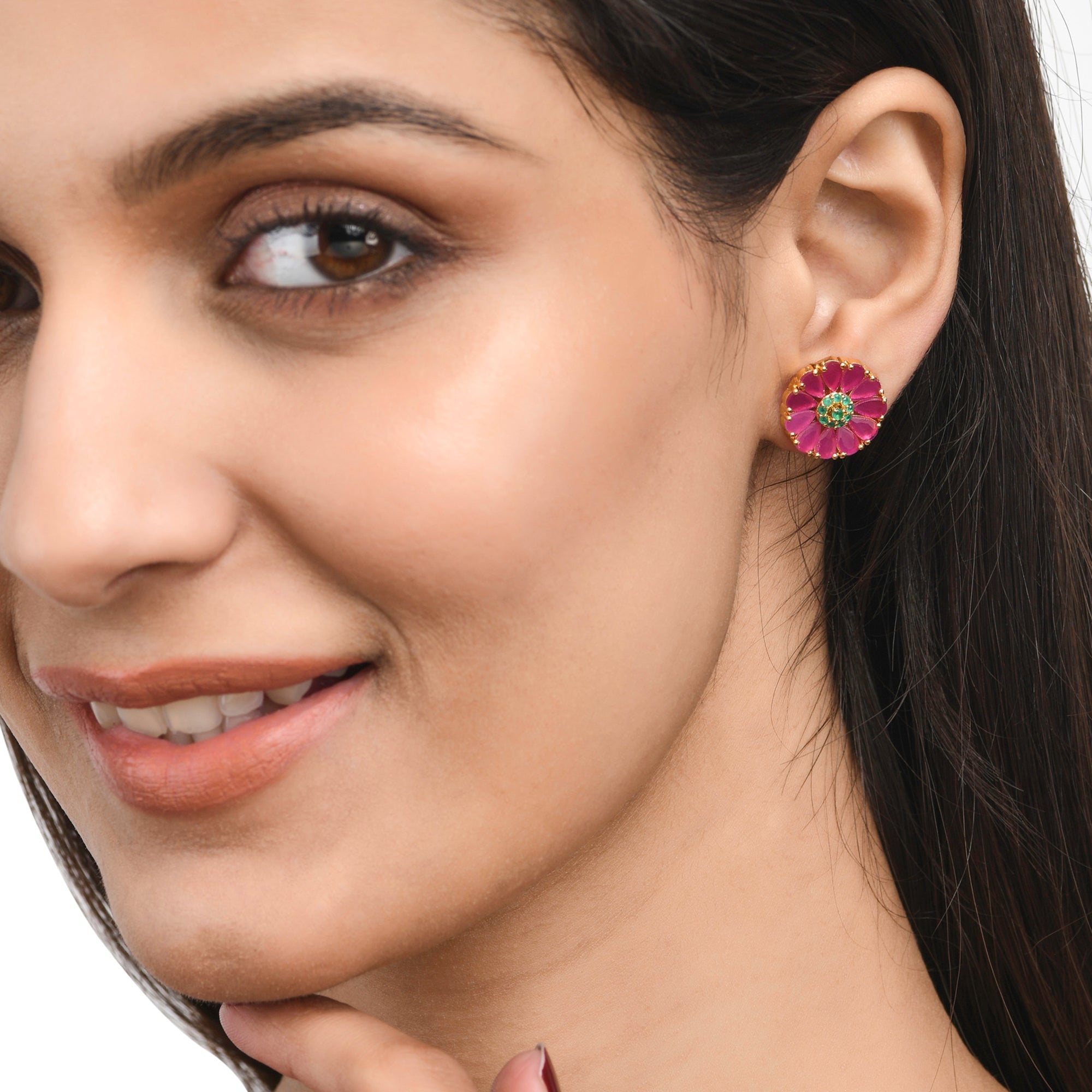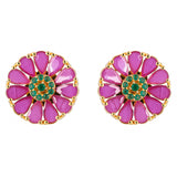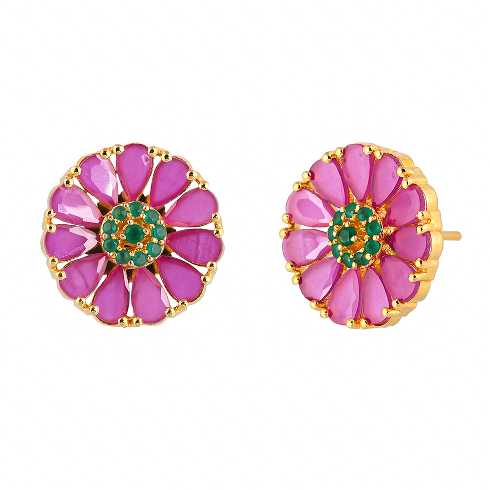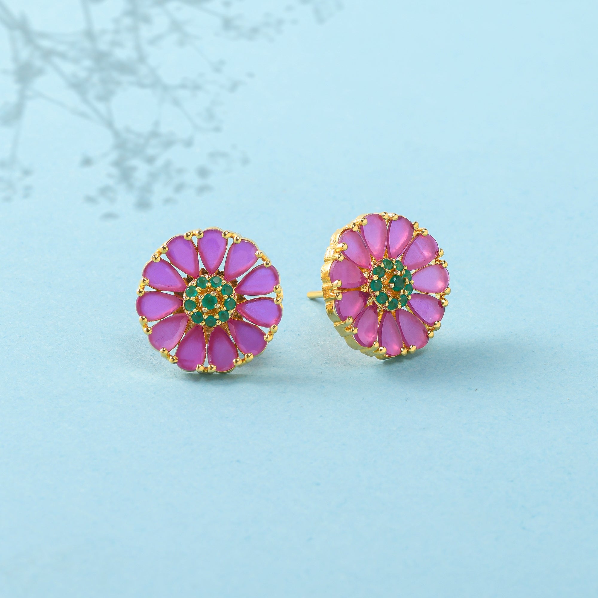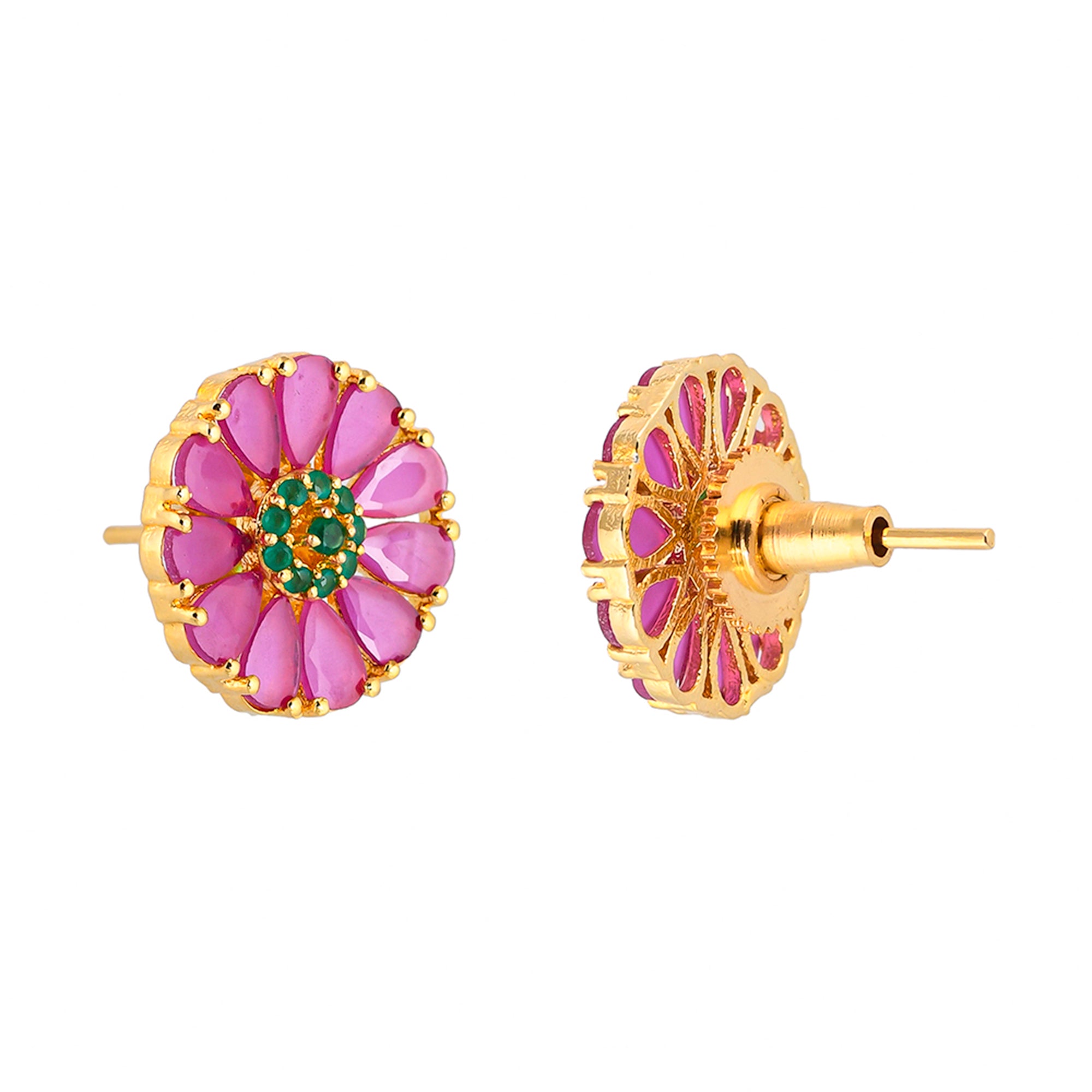 Green and pink CZ gems stud earrings with gold plating. Fashioned out of brass. Pair with casual looks.