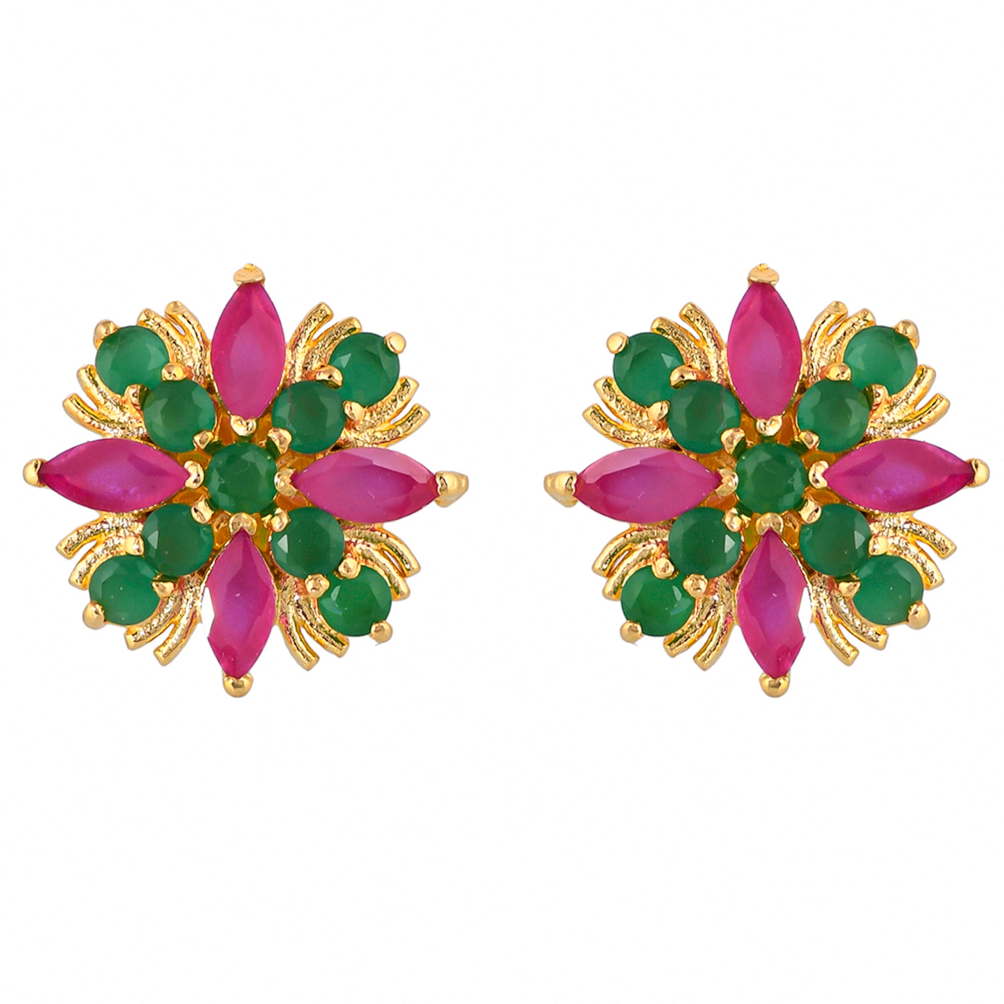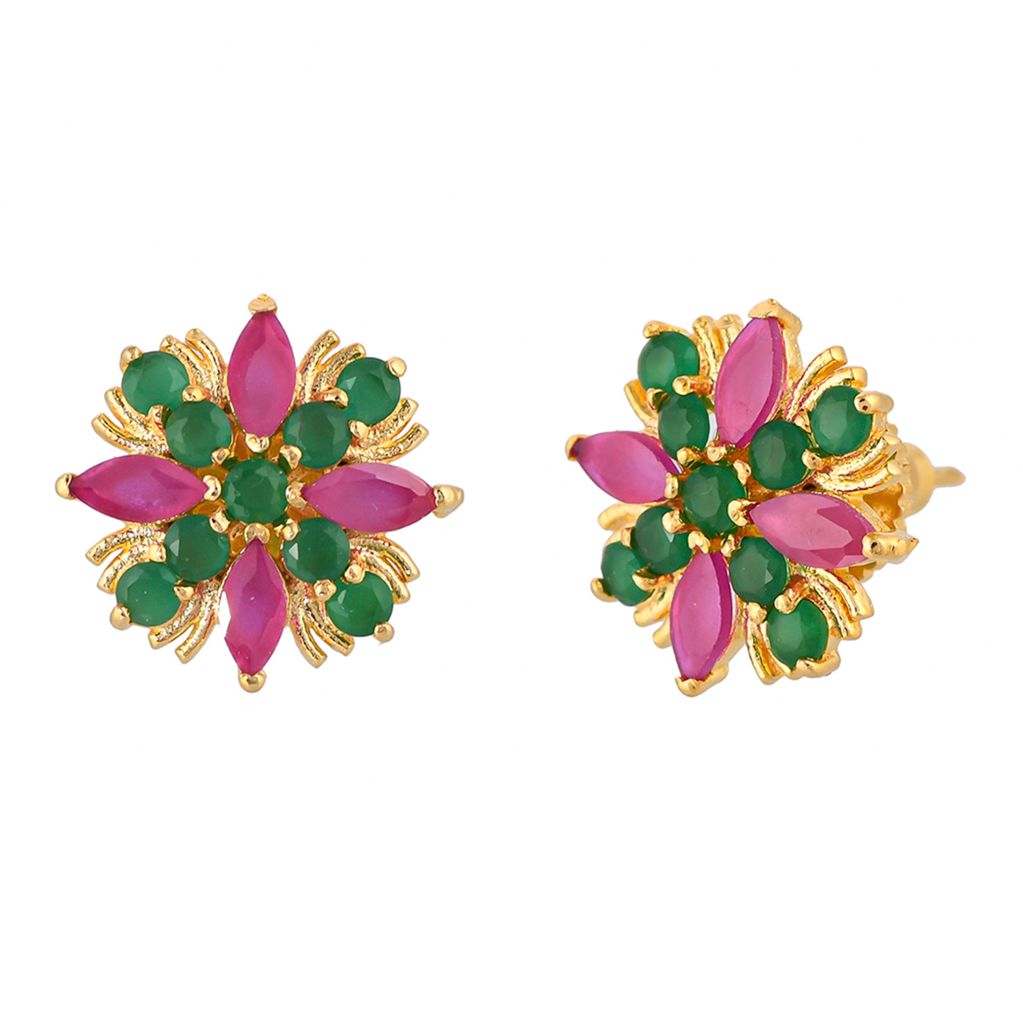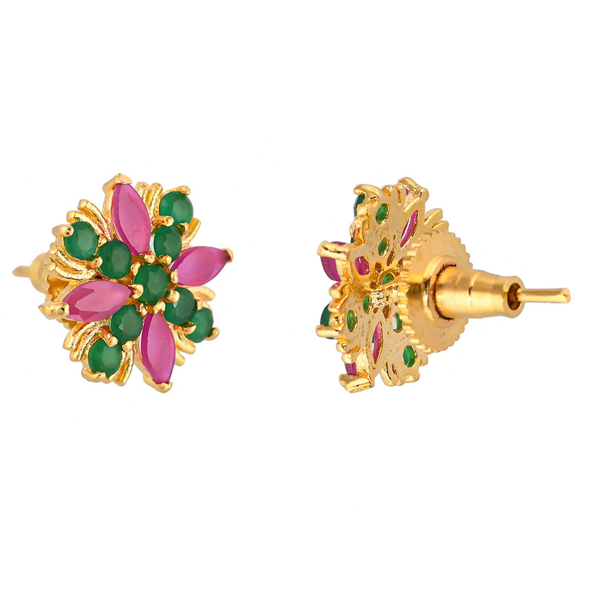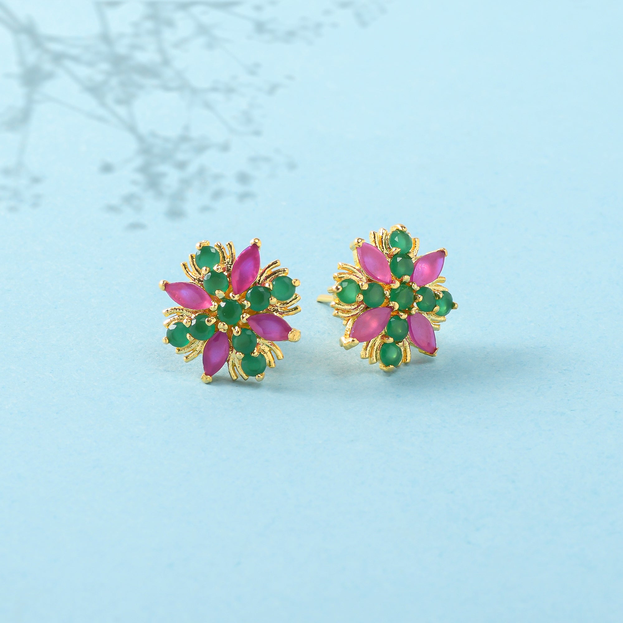 Green and pink CZ gems adorned tiny brass stud earrings. Gold plated, lightweight, comfortable and versatile.