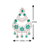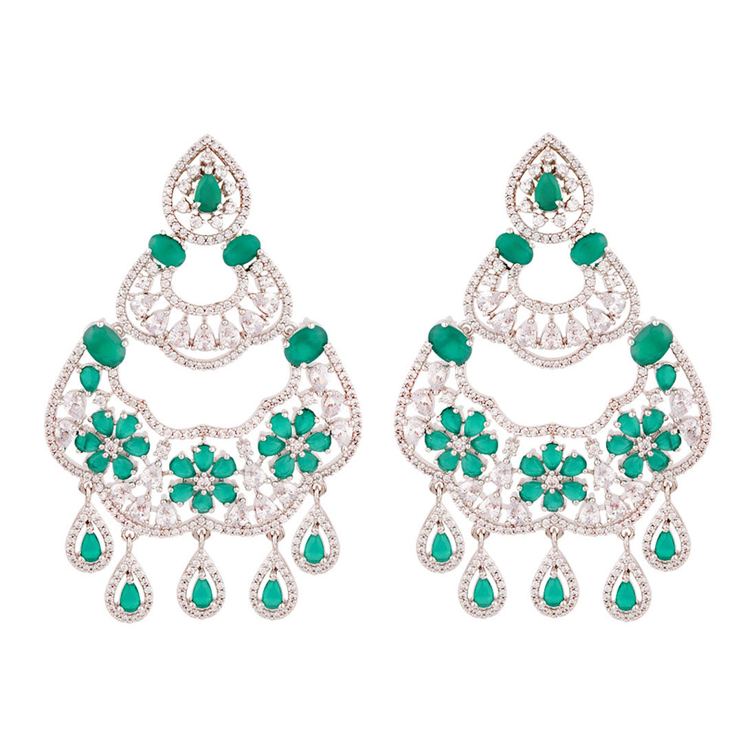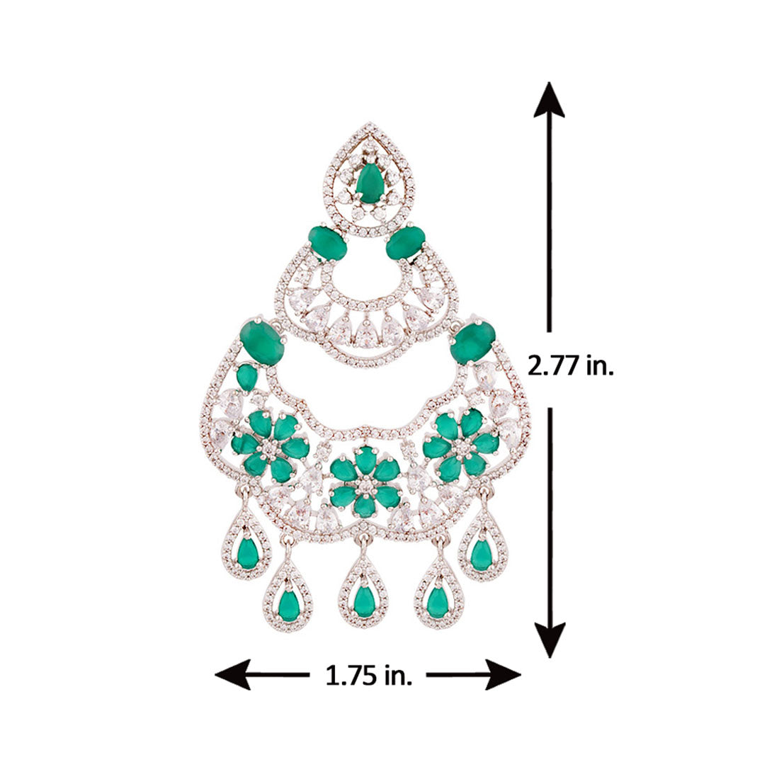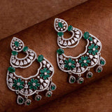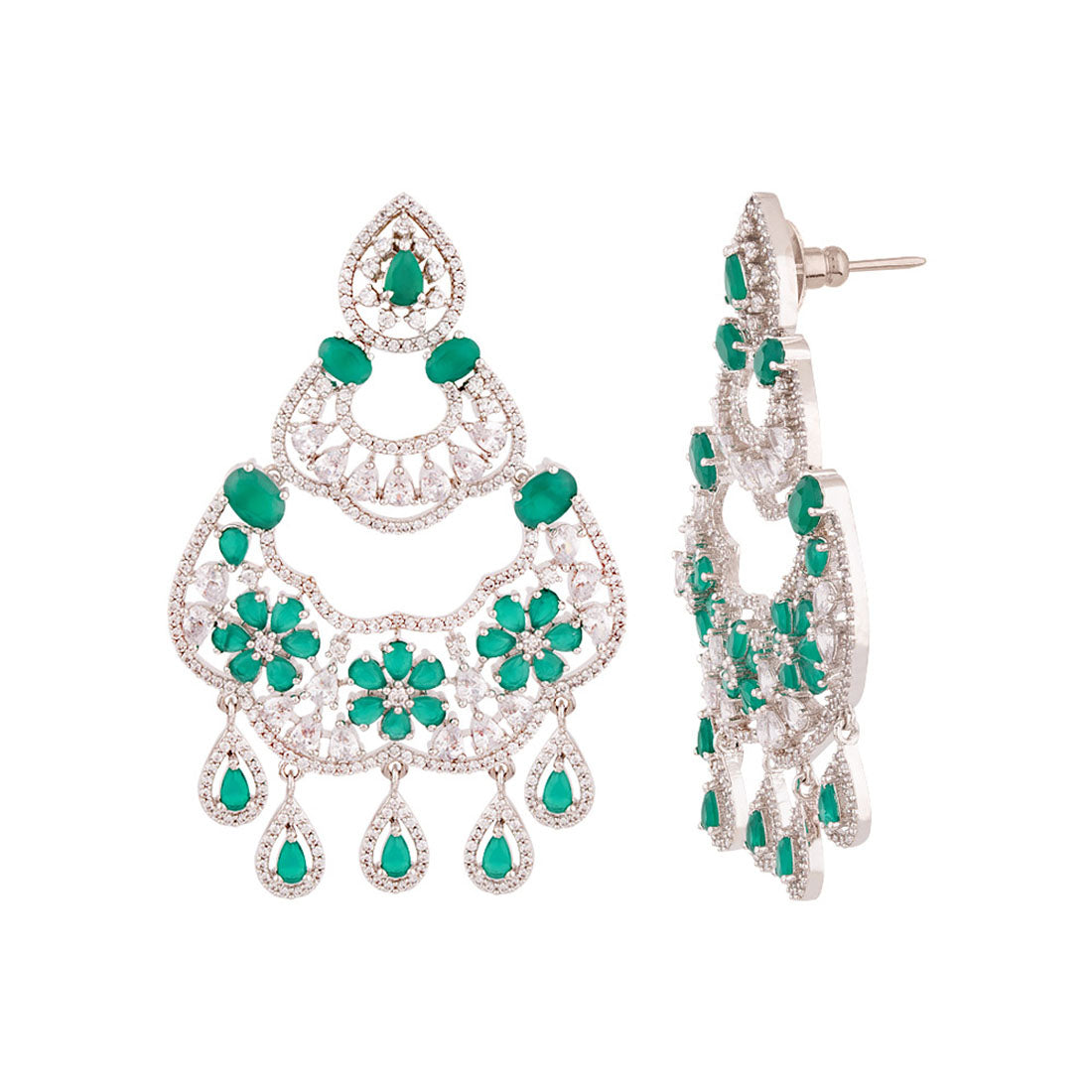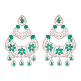 Green and white American Diamond gems adorned floral motifs brass earrings. Silver plated, lightweight and versatile.