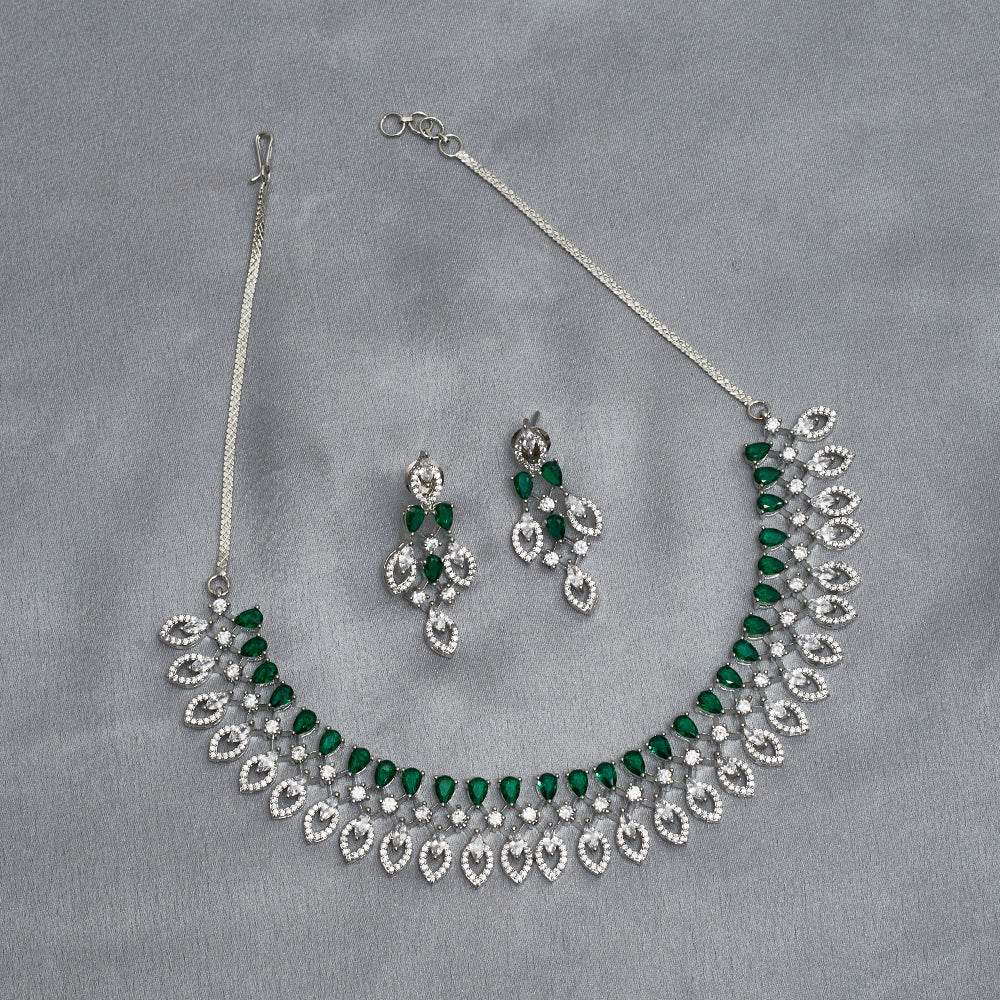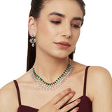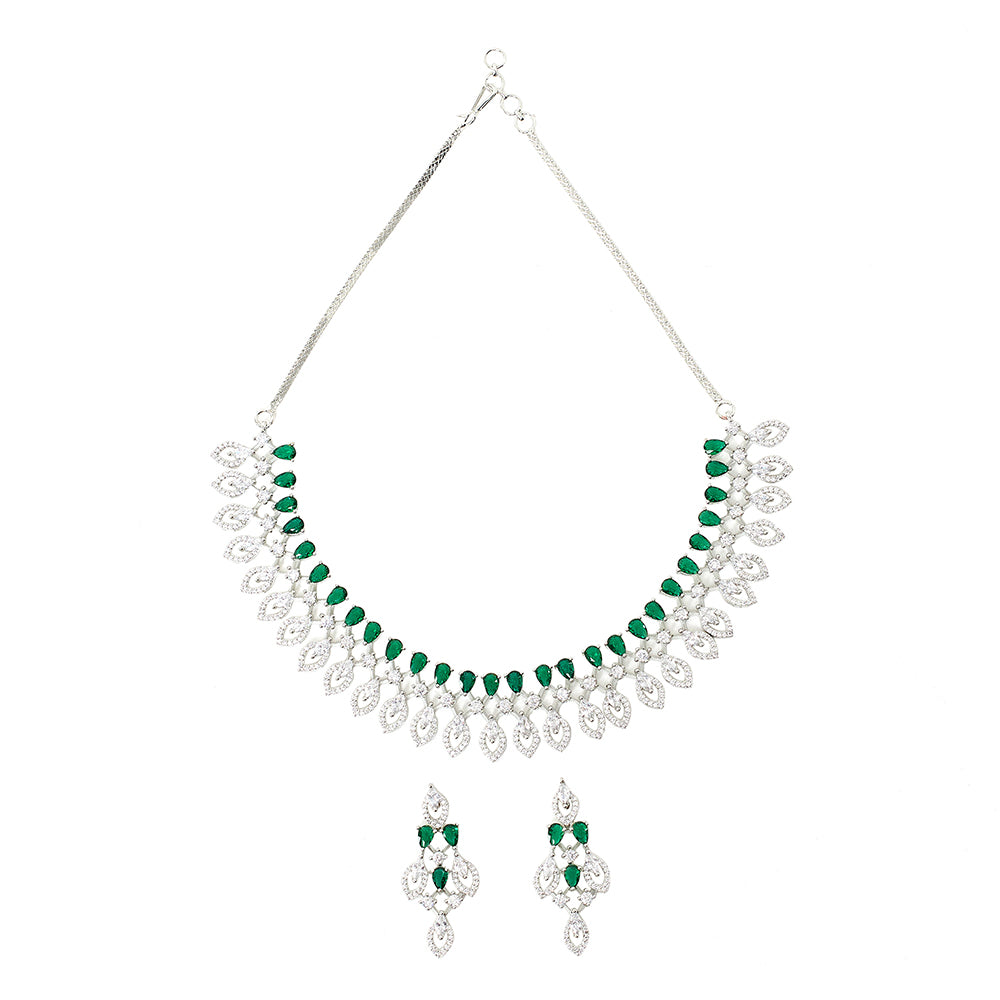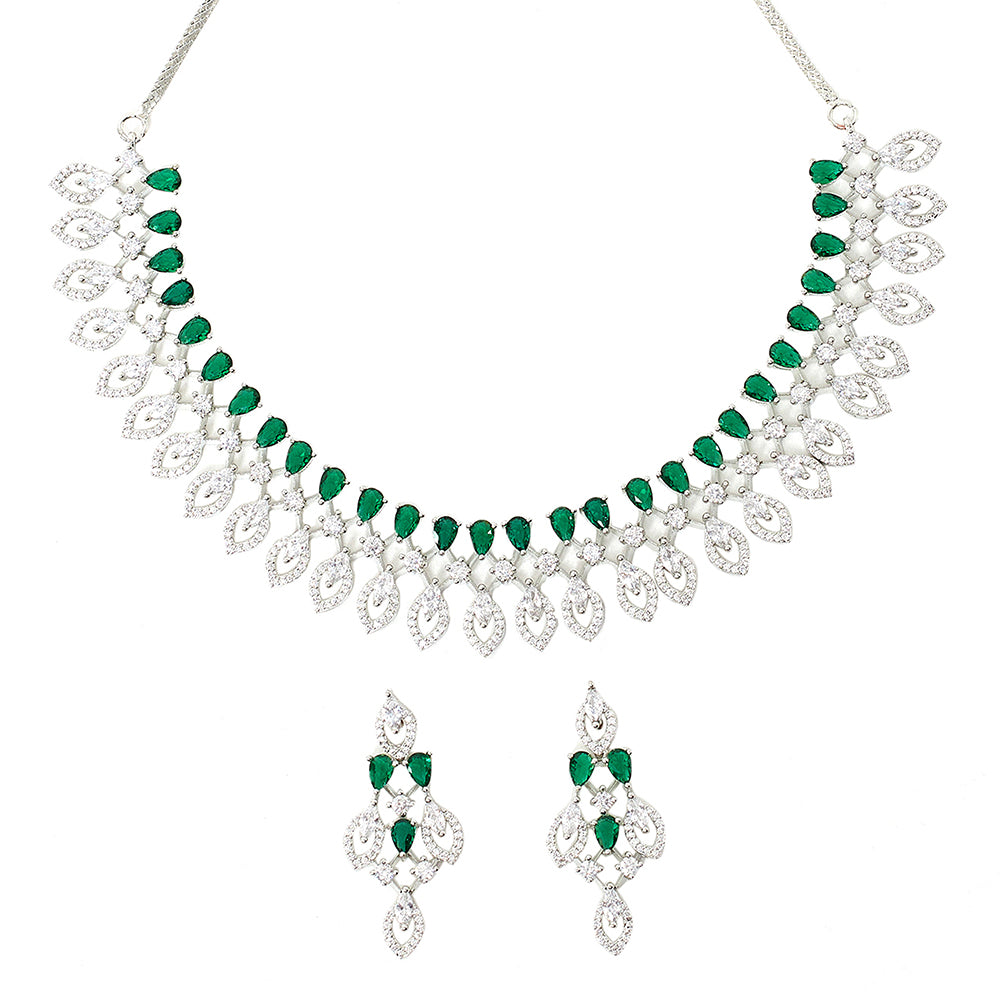 Green and white cubic zirconia gemstones in a classic teardrop cut have been used to embellish this opulent jewellery set. The necklace and matching drop earrings have been fashioned out of brass. Silver plated for added charm, the lightweight set can be paired with formal outfits of all types.