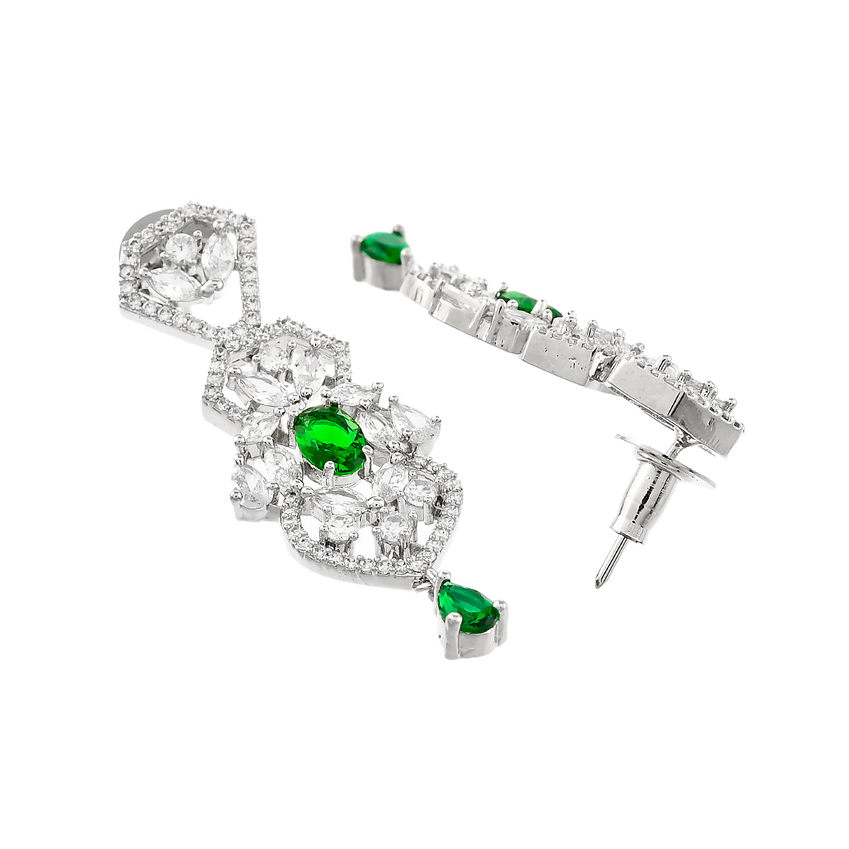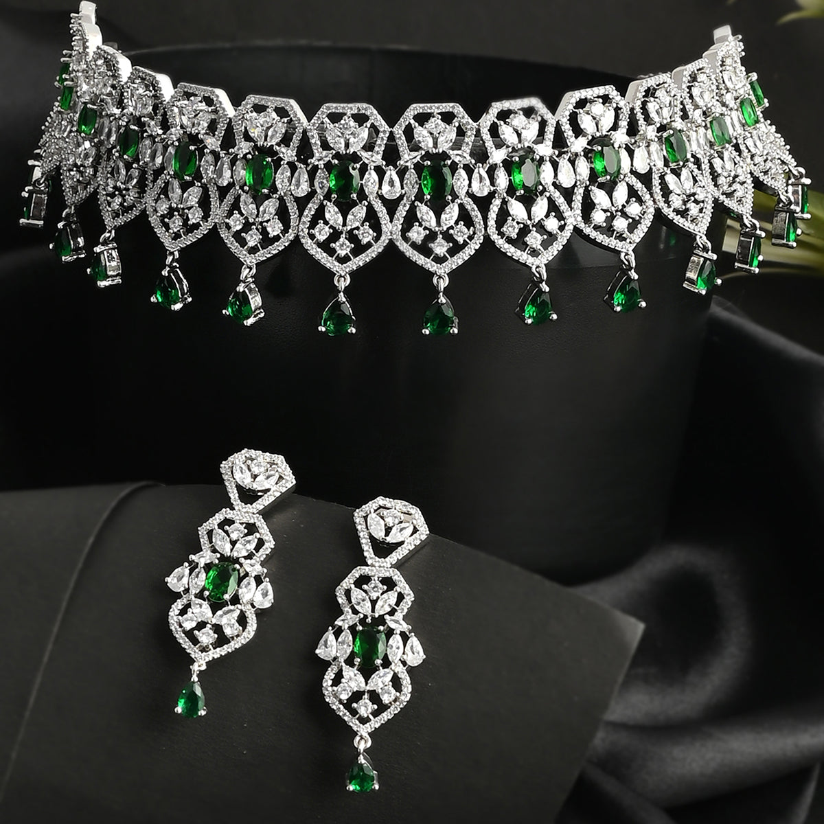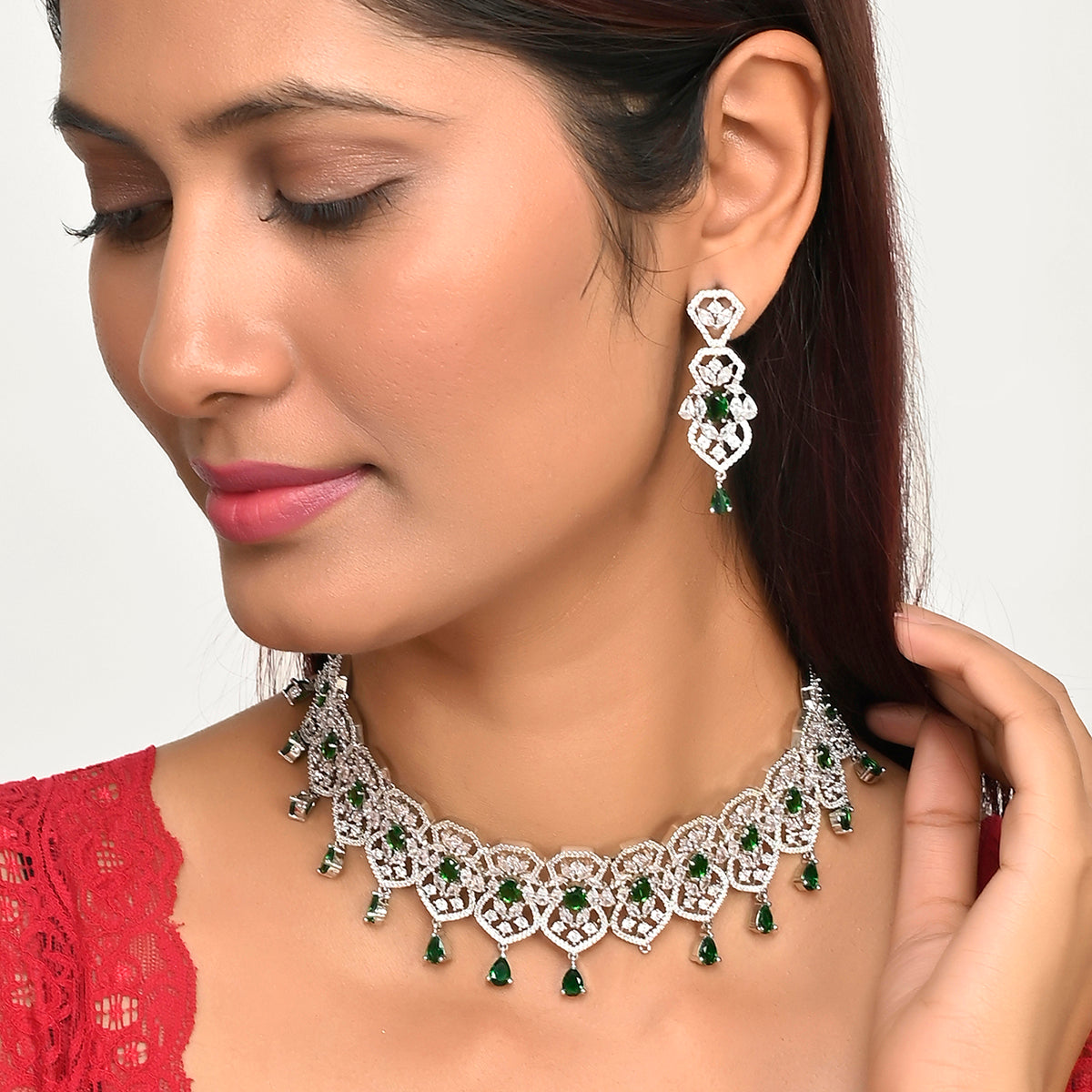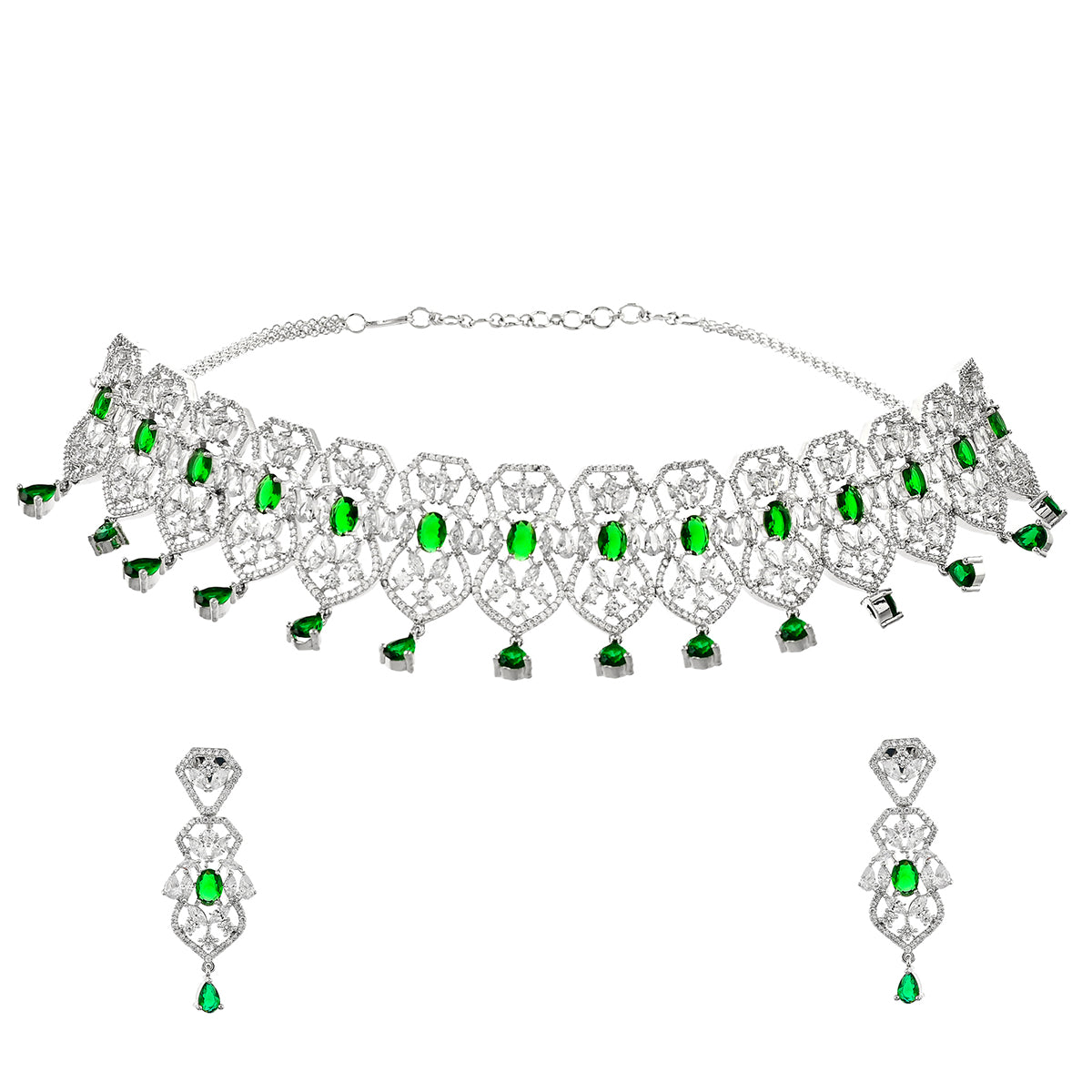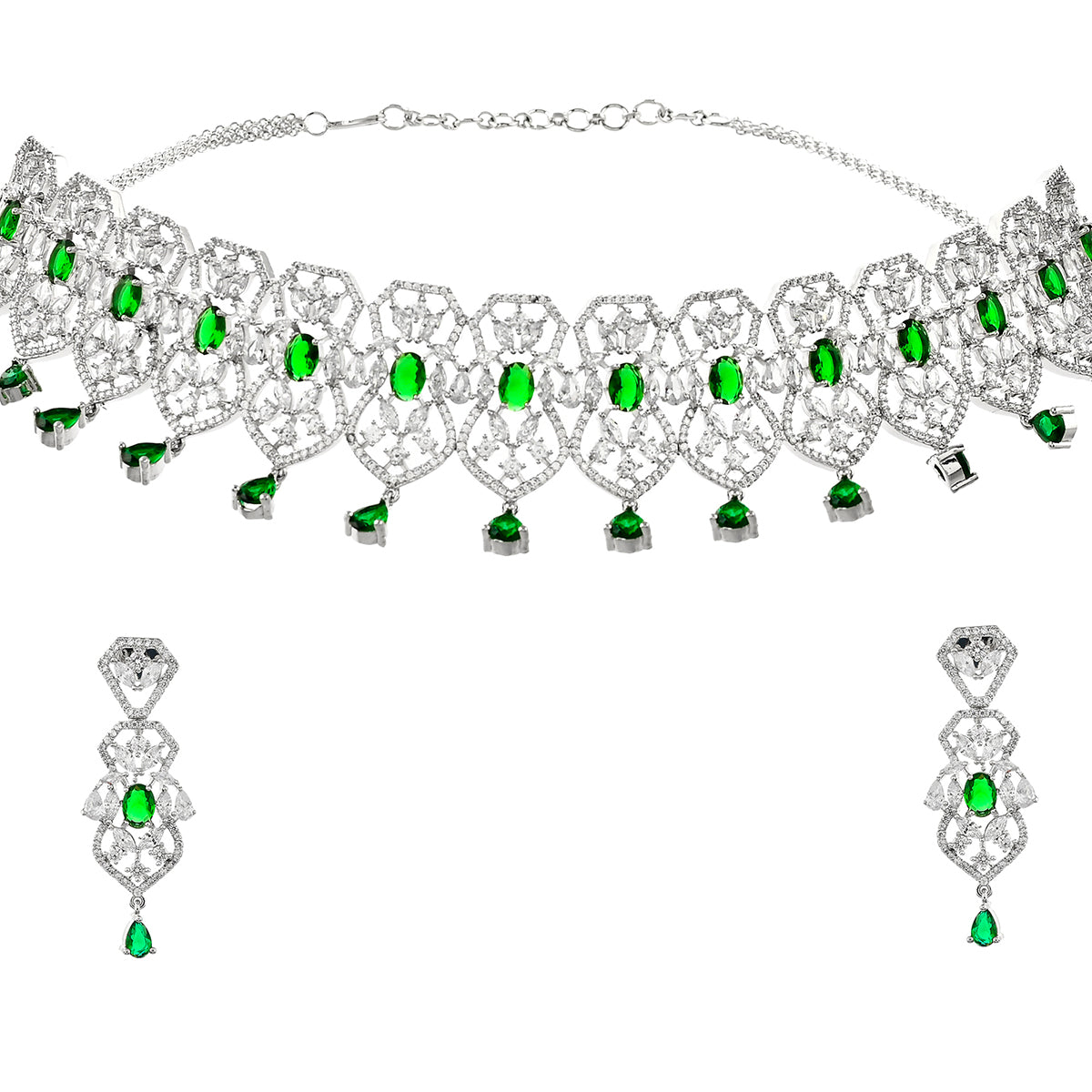 Green and White Zircons Adorned Opulent Silver Plated Brass Jewellery Set