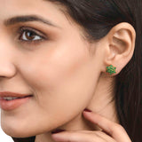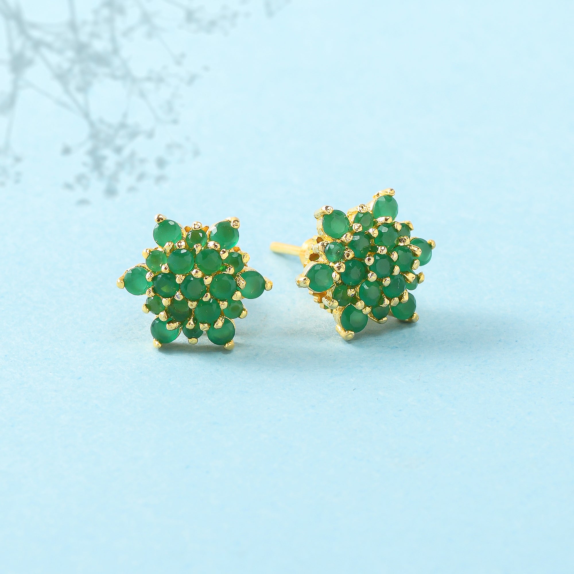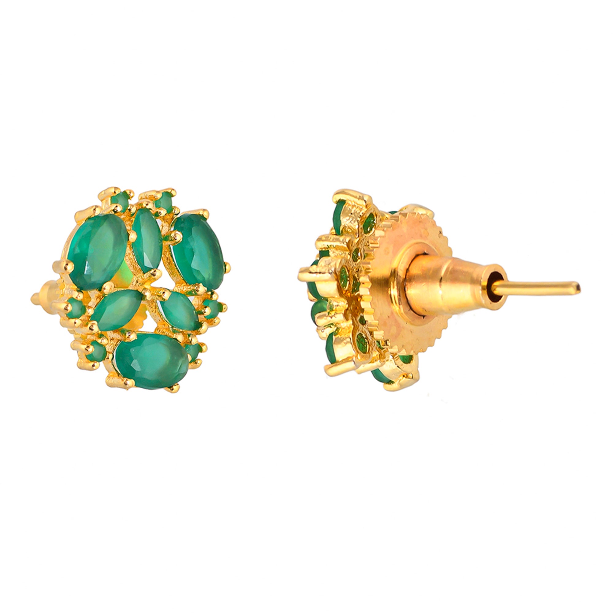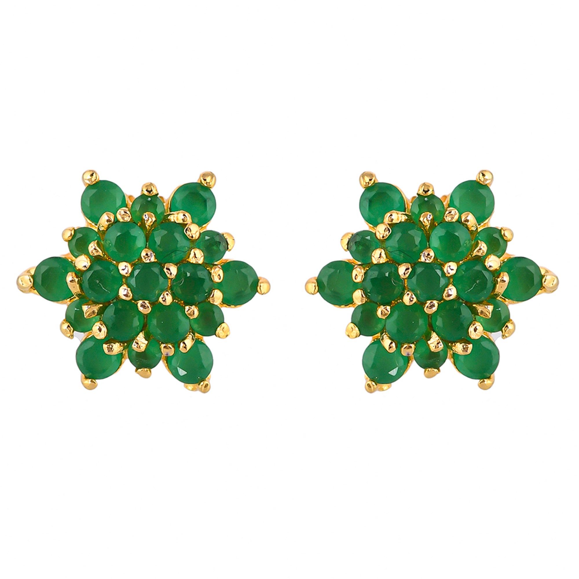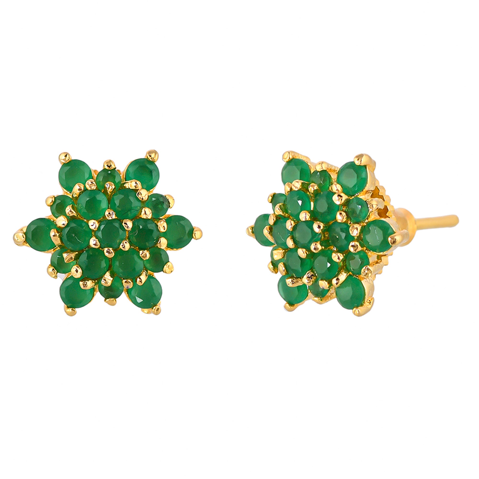 Brass stud earrings with gold plating, adorned with green CZ gems in a classic cluster setting. Pair with casual looks.