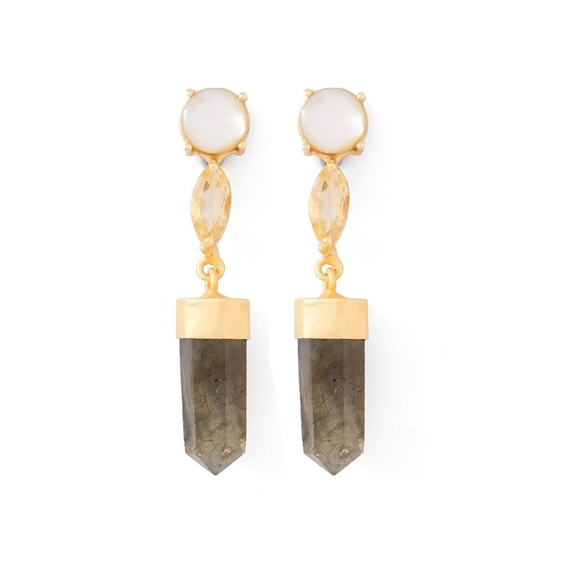Keep ahead in fashion race with this pair of uniquely designed dangler earrings decked with mop stones.The luscious gold tone finish with a combination of green stone drop gives them a trendy appeal.