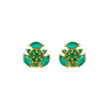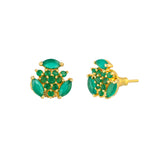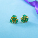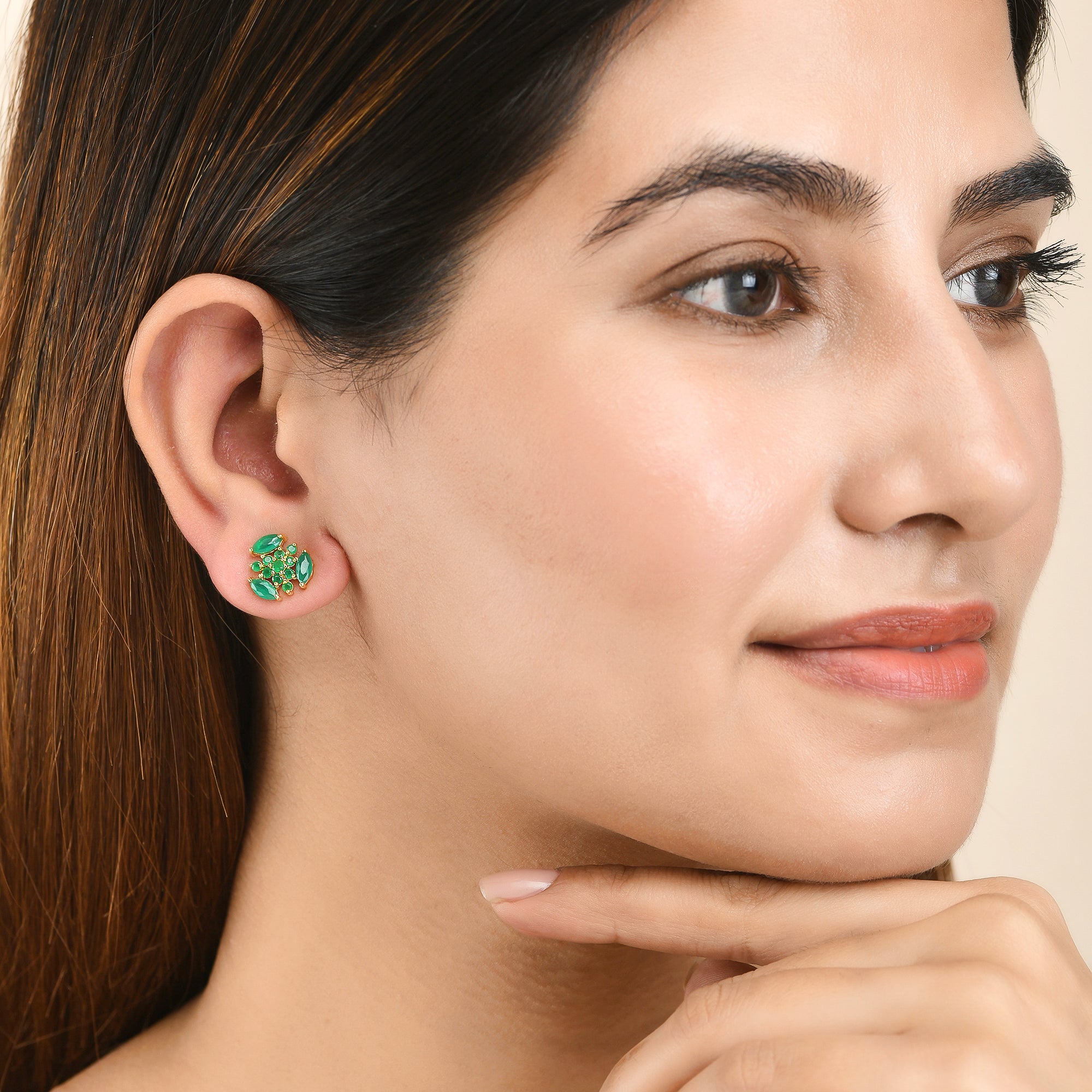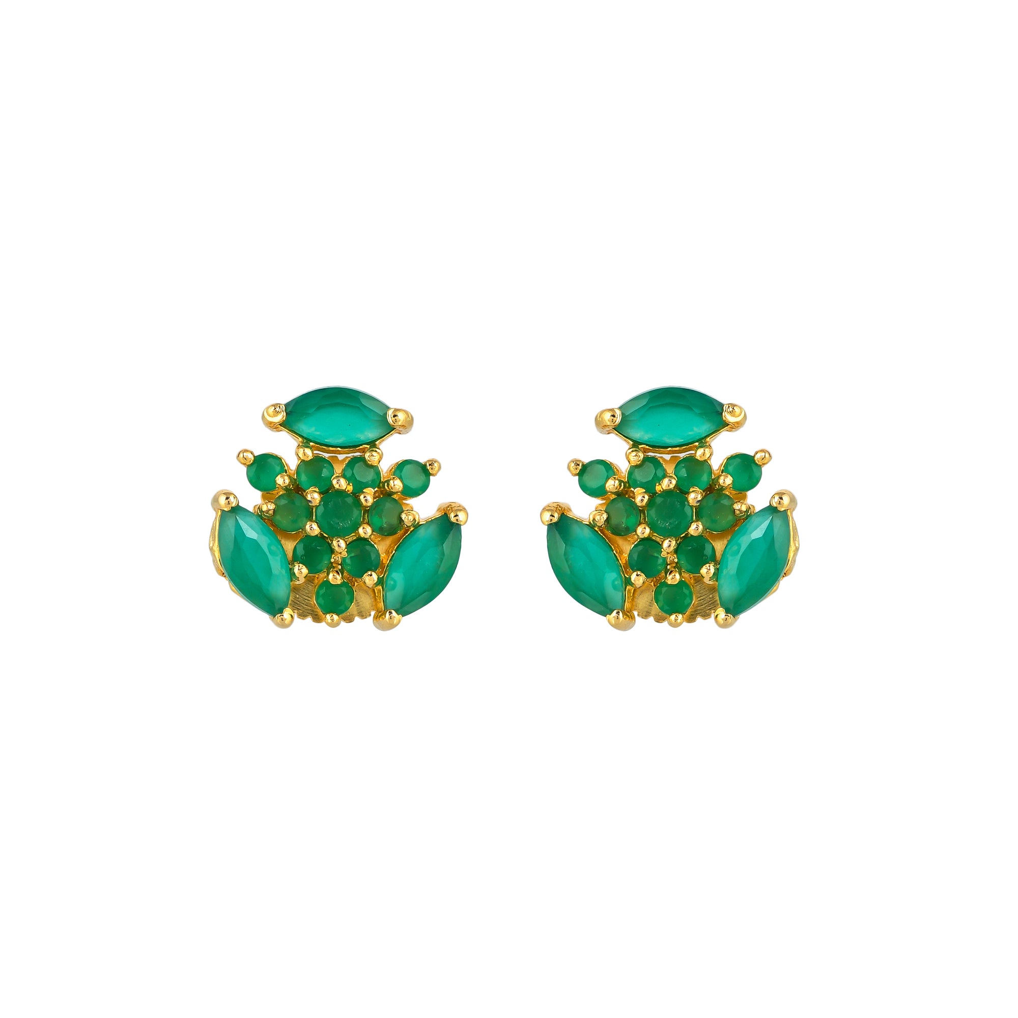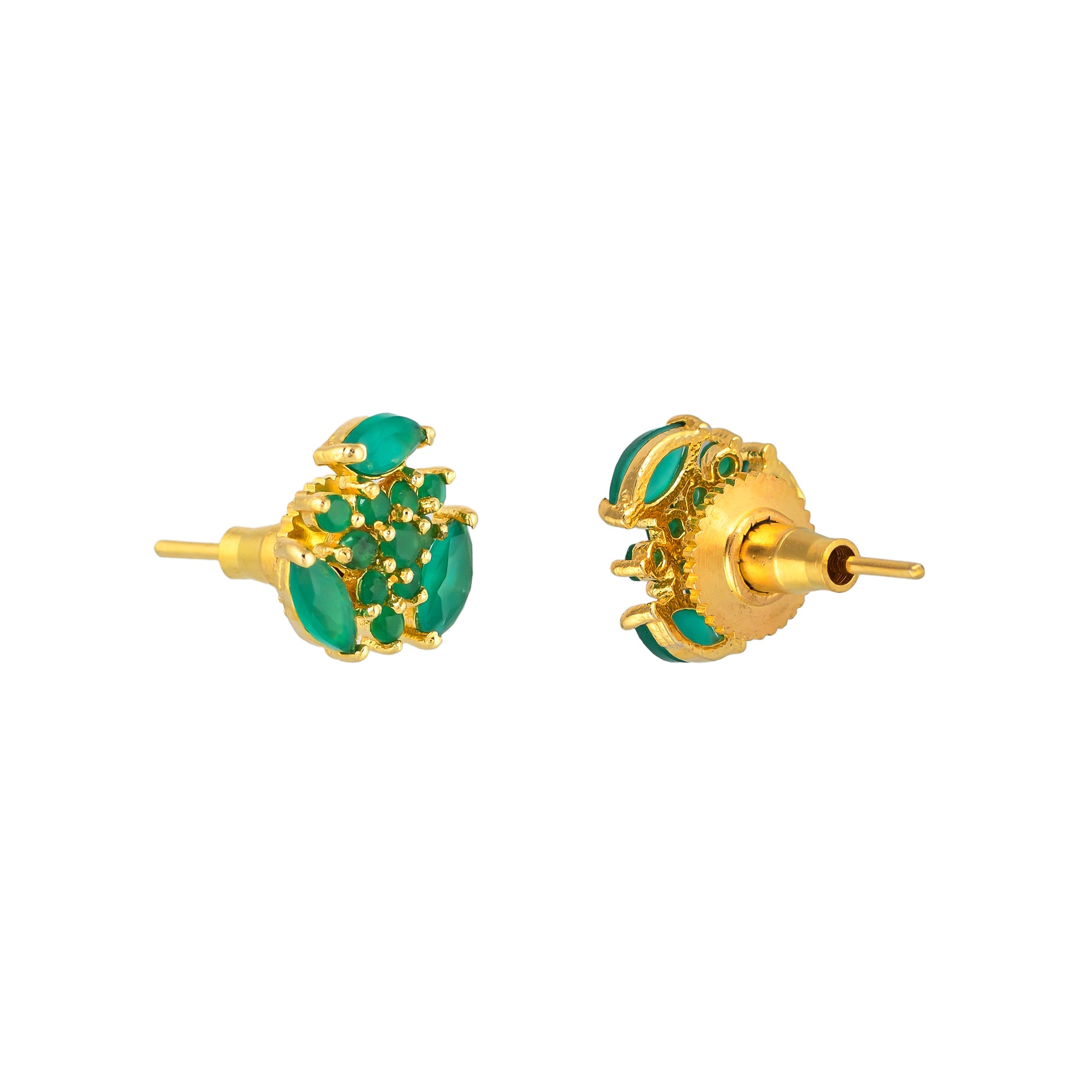 Green CZ gems adorned tiny brass stud earrings with gold plating. Good for casual looks.