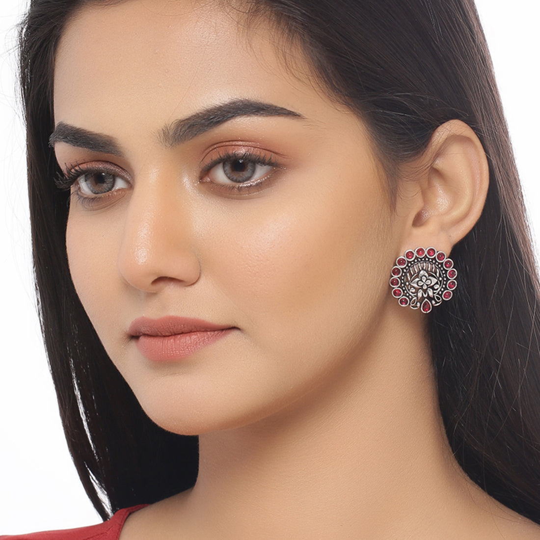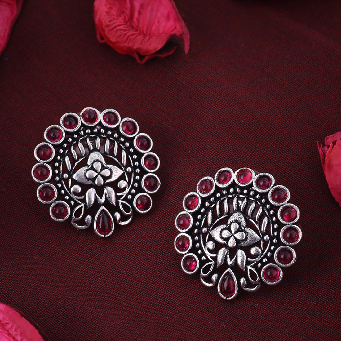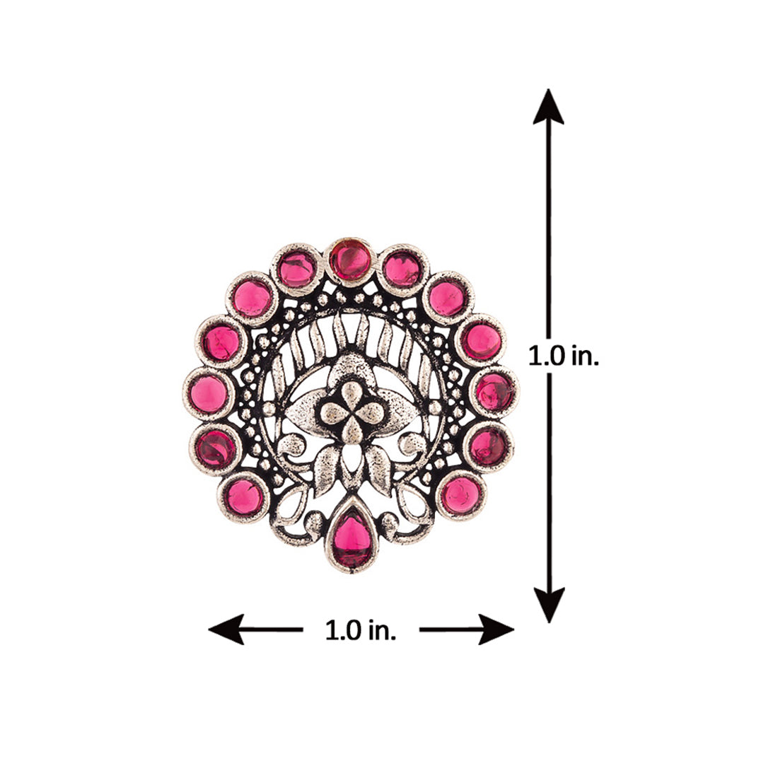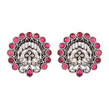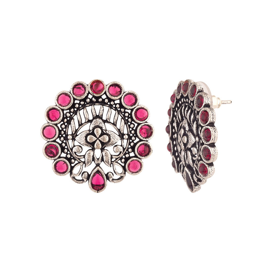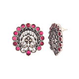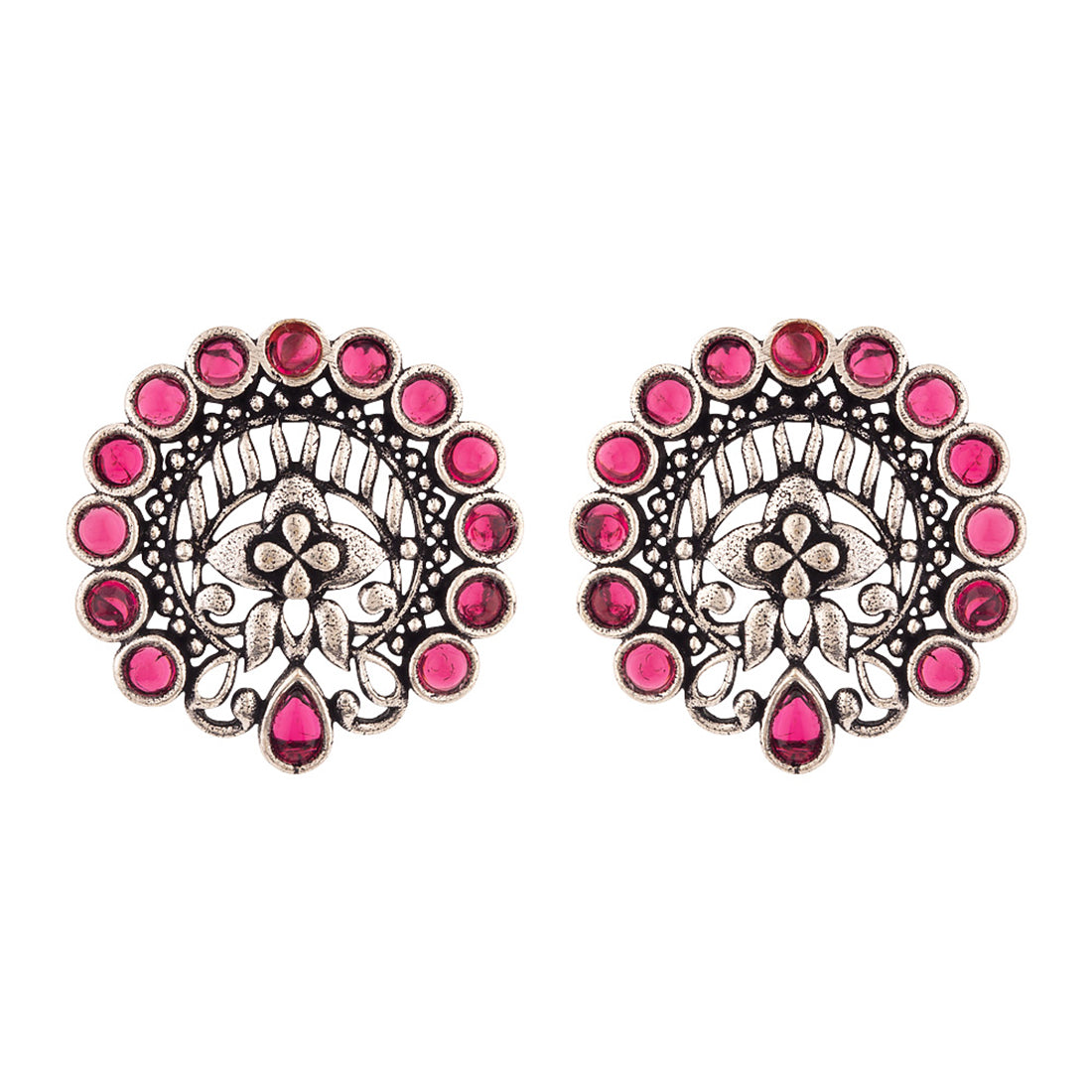 Pink stones adorned floral motif stud earrings made from brass. Oxidised silver plated. Pair with ethnic and Indo-Western looks. This piece of jewelry comes with the Voylla assurance of quality and durability.