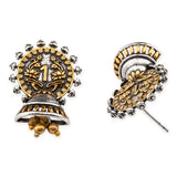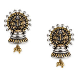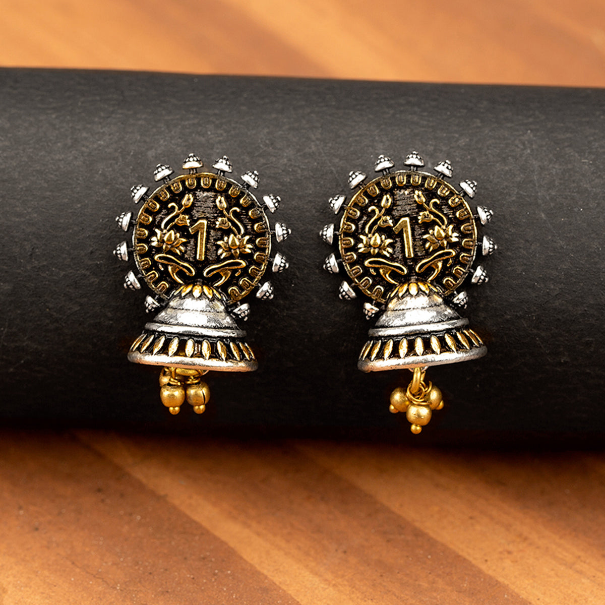 Dual tone earrings with antique finish in engraved texture.The design boasts clustered ghungroo beads and dome drops.
