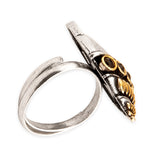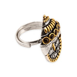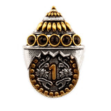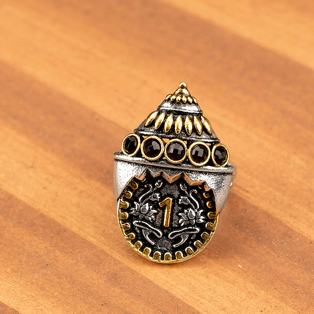 This unique numeric ring is a perfect option when you want to make a style statement.This brass ring features dual tone plating studded with black stones.You can wear a chunky ring with your outfit to get a bold look for an evening party.
