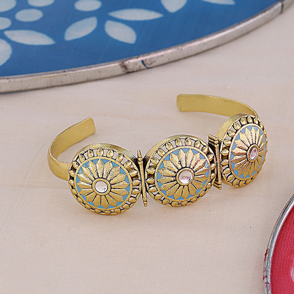 Open style circles motifs brass bracelet inspired by the art and architecture of the Gwalior fort. Each circles has been embossed with a floral motif and the bracelet has been given an oxidised gold plating. Enameled and lightly embellished, the bracelet is good for formal looks as well as everyday wear.