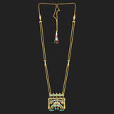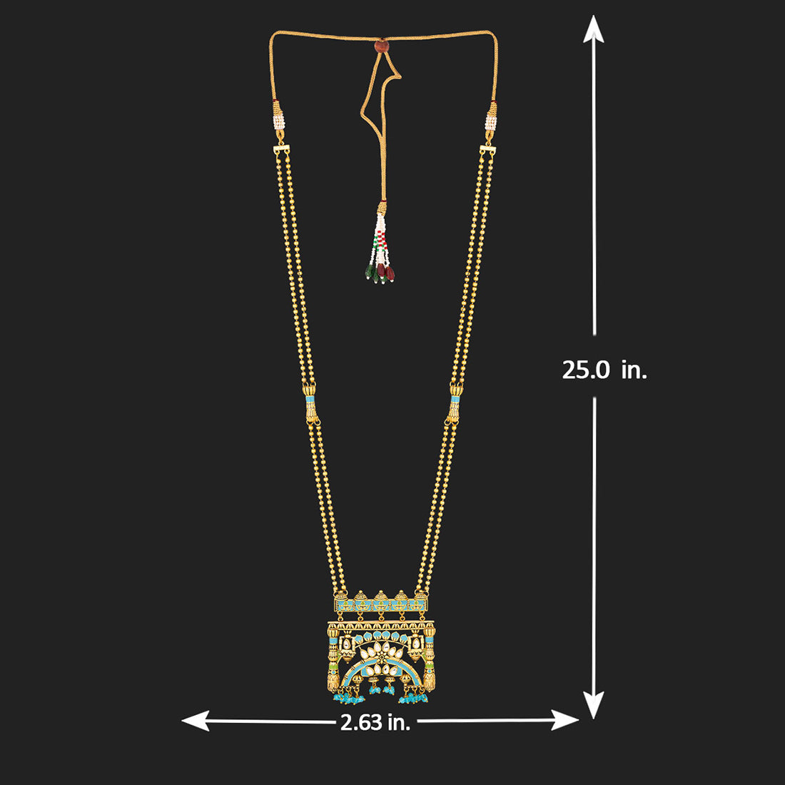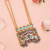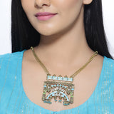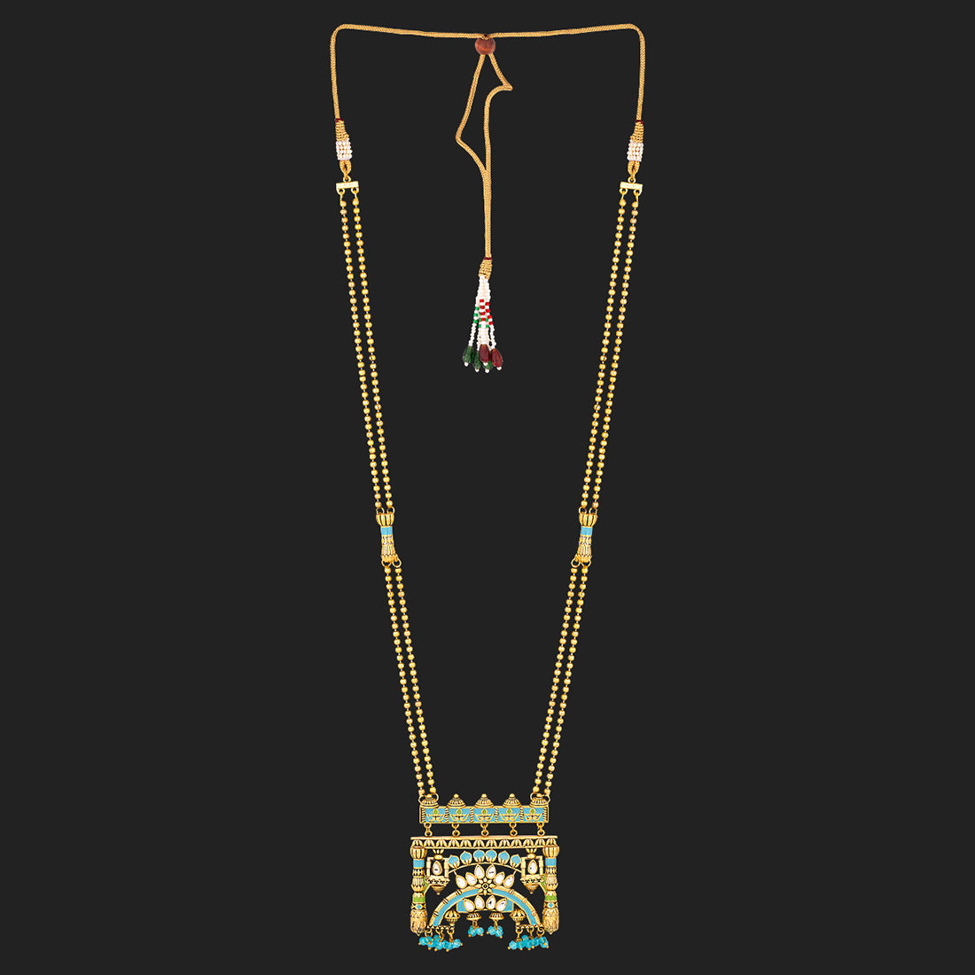 Decorative arch motif necklace with a beaded chain, inspired by the architecture of the grand fort of Gwalior. Brass has been used in the making of this oxidised gold plated necklace, which has been enameled. Pair with a traditional saree.