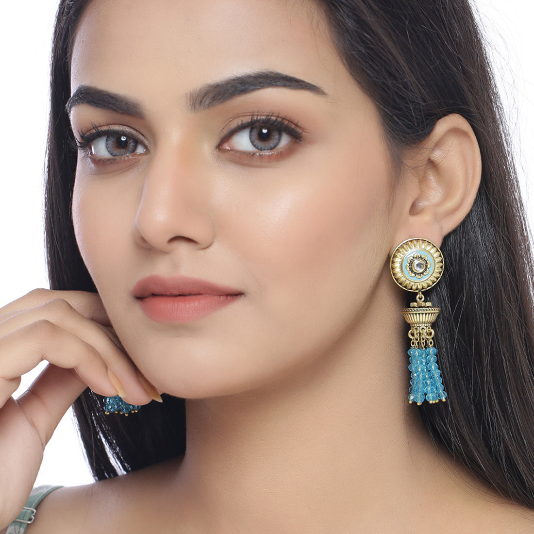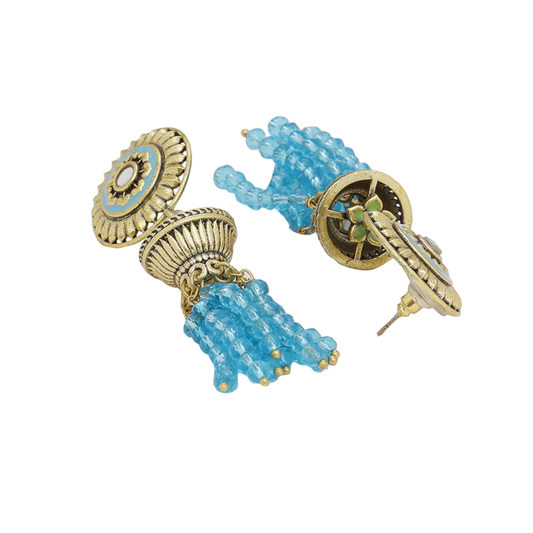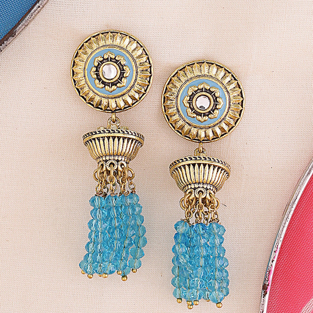 Dome and tassels drop earrings inspired by the architecture and motifs of the fort of Gwalior. Made from brass and oxidised gold plated, the earrings have been lightly embellished. Enameled and a good match for ethnic looks.