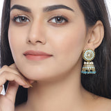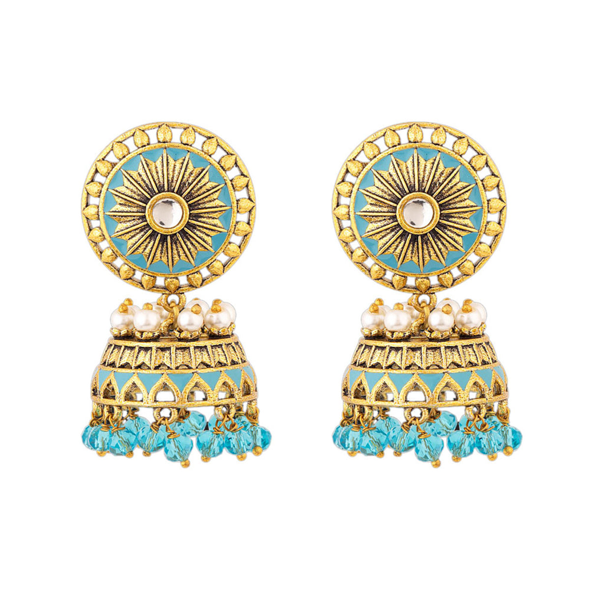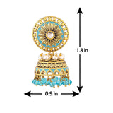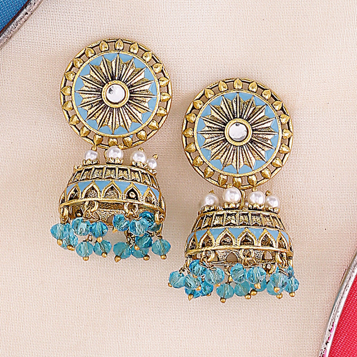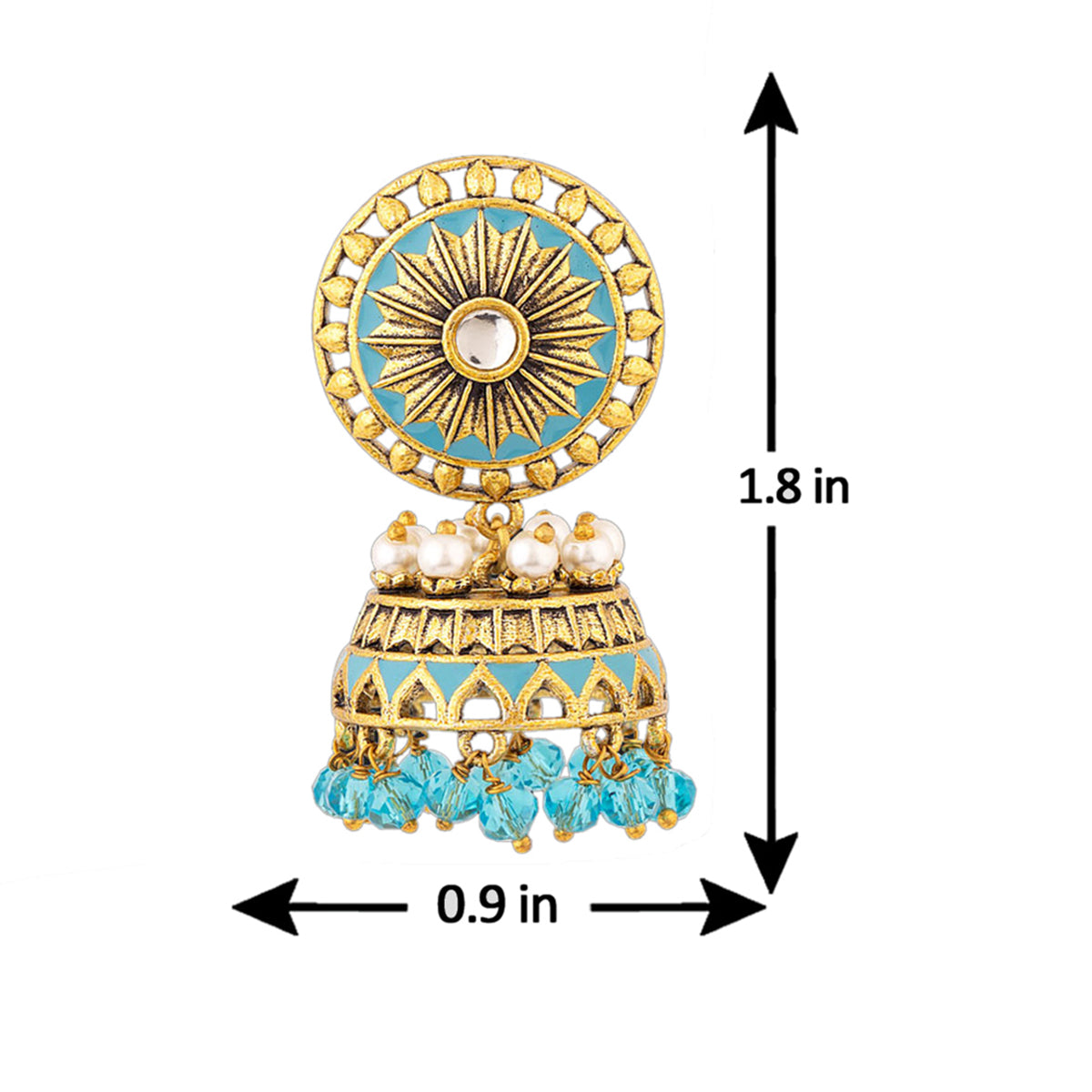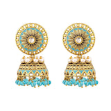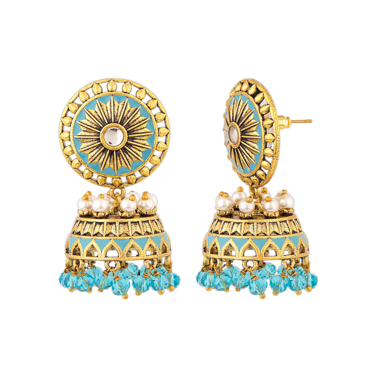 Dome enameled jhumka earrings, embellished with faux kundan gems and inspired by the grand architecture of the fort of Gwalior. Made from brass and oxidised gold plated, the enameled pair is a good match for casual and formal ethnic attire.