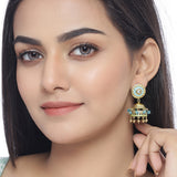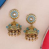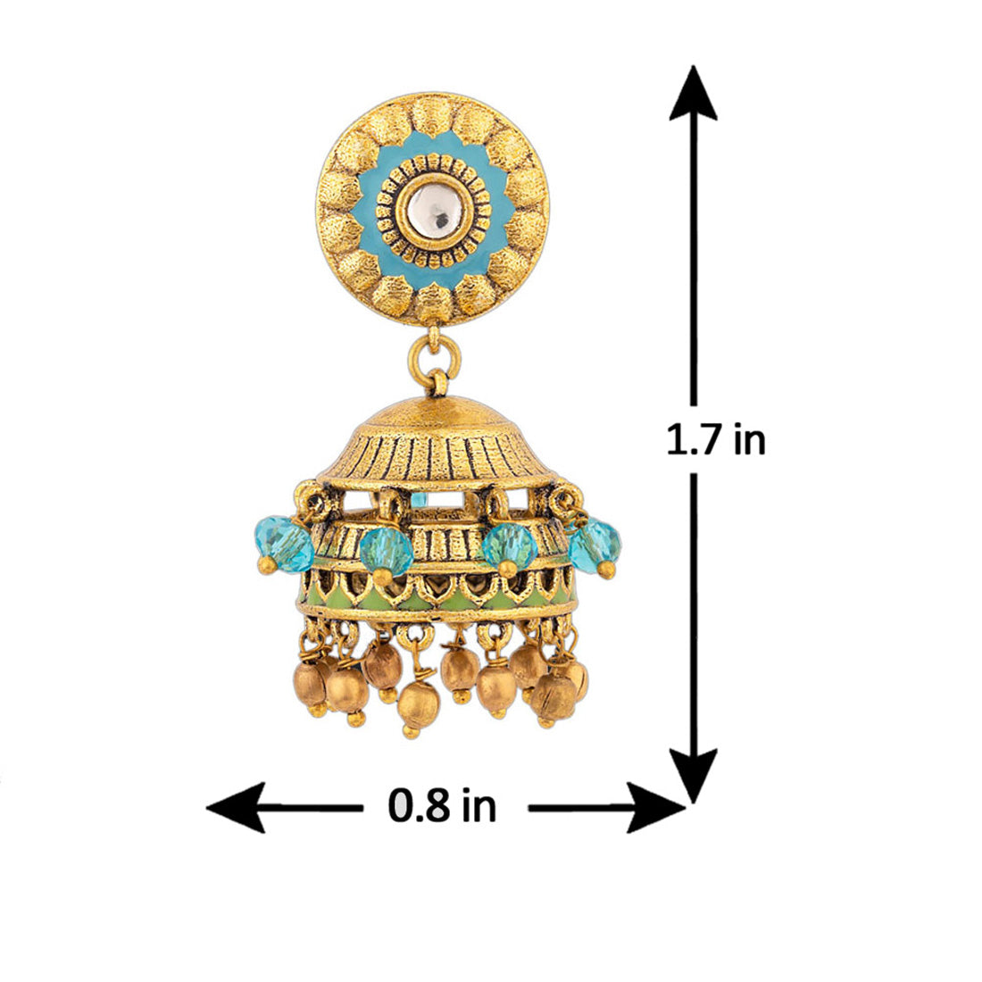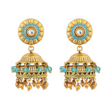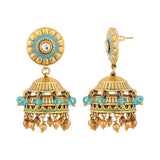 The art and architecture of the grand fort of Gwalior have inspired these ethnic jhumka earrings, which have been fashioned out of brass. Enameled and oxidised gold plated, the drop earrings have bee lightly embellished and can be paired with causal and formal ethnic attire.