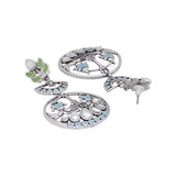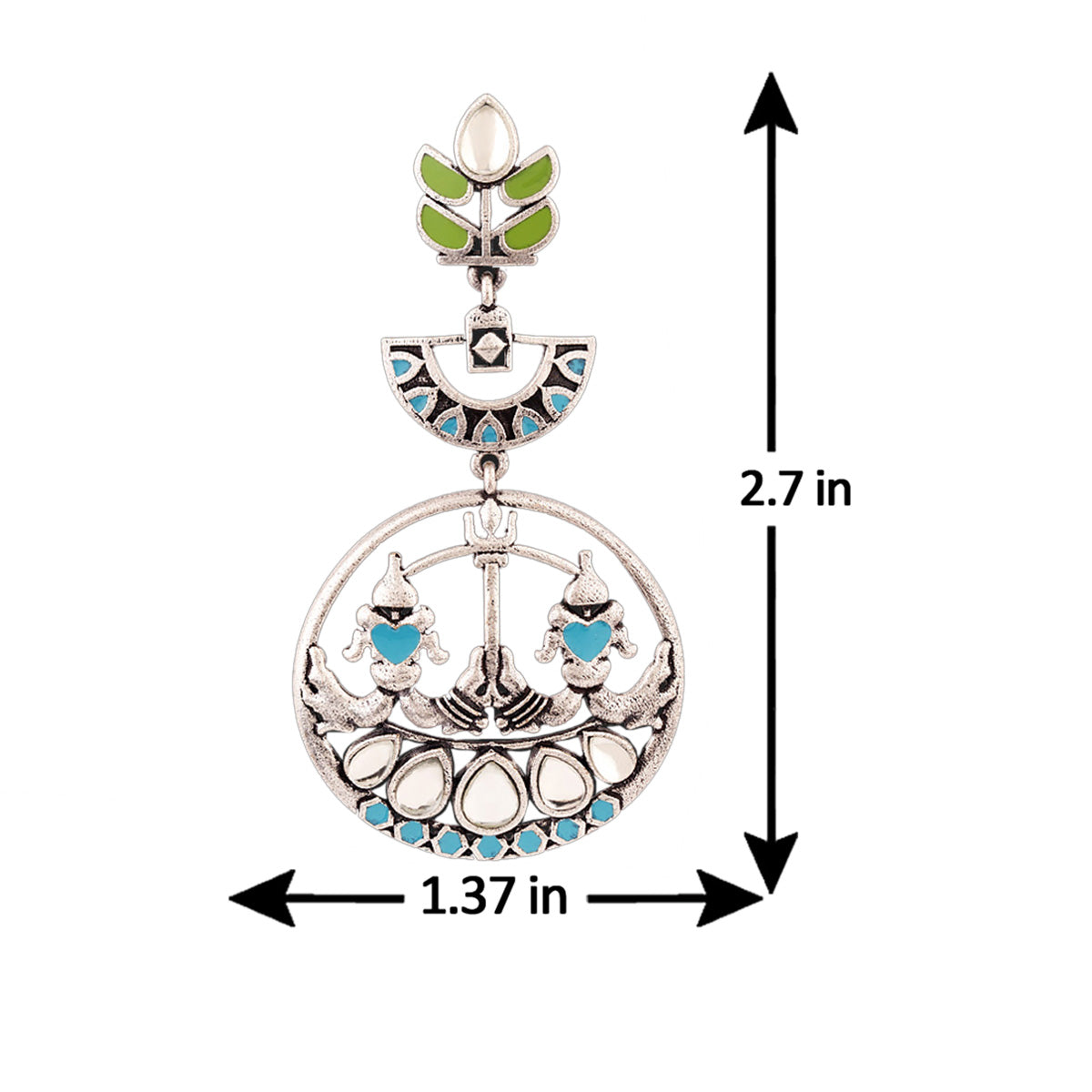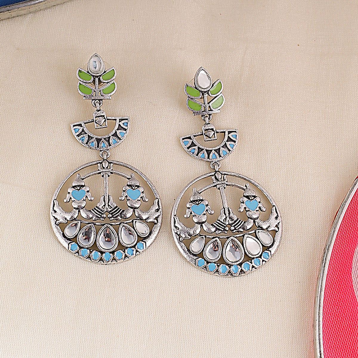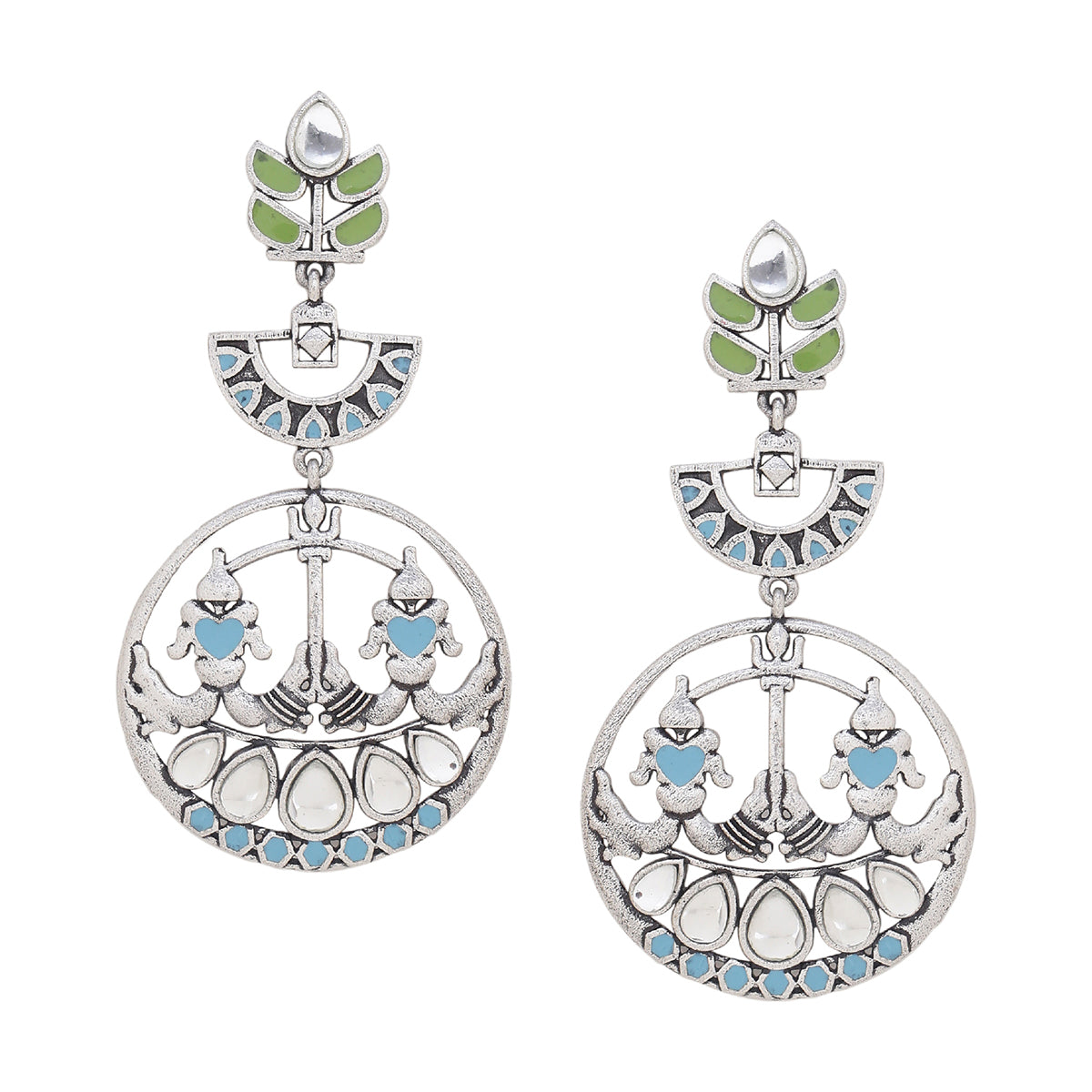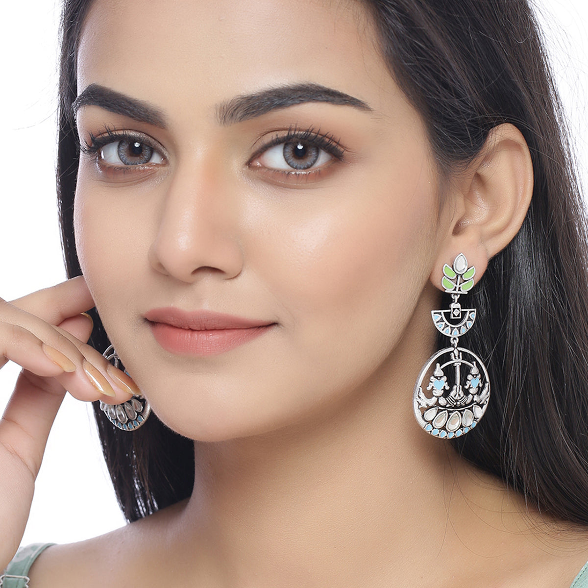 Filigree design drop earrings adorned with motifs inspired by the architecture and designs of the fort of Gwalior. Made from brass and oxidised silver plated, the lightly embellished and enameled pair can be paired with casual ethnic and Indo-Western attire.