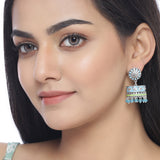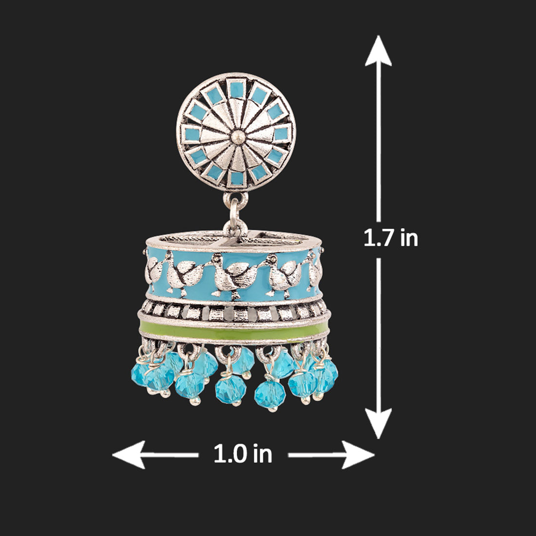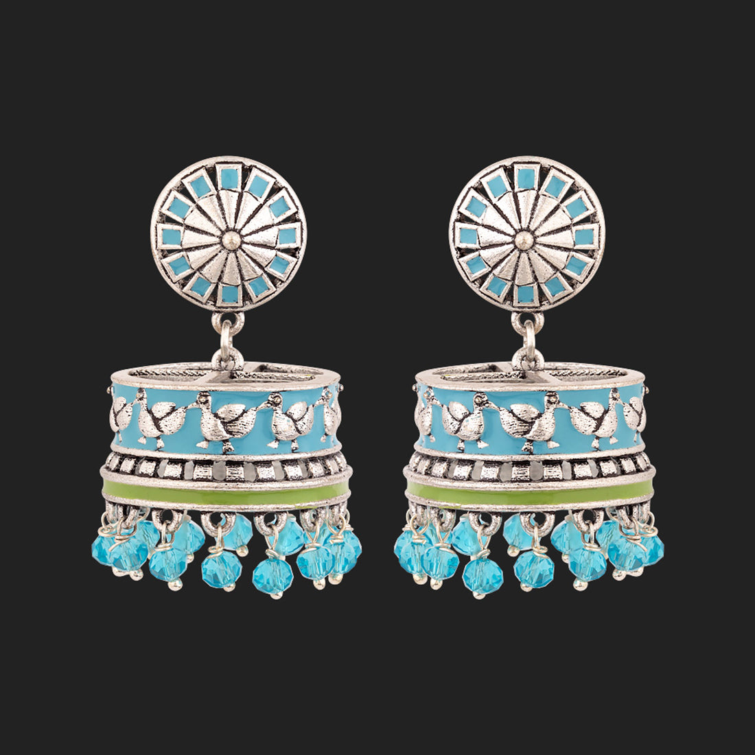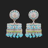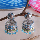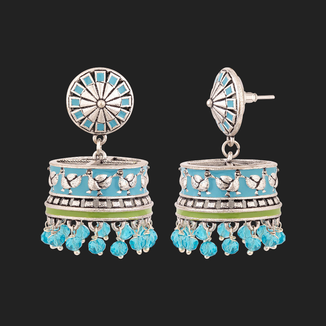 Floral and ethnic motifs embossed jhumka drop earrings, inspired by the Gwalior fort and its architecture. Made from brass and oxidised silver plated, the enameled pair has been lightly embellished. Pair with ethnic attire.