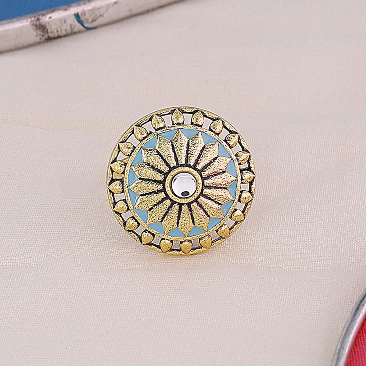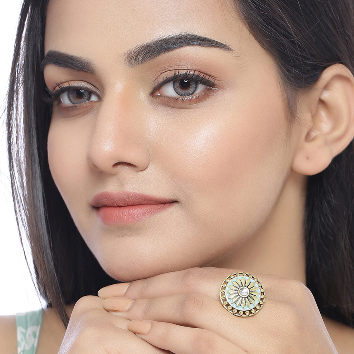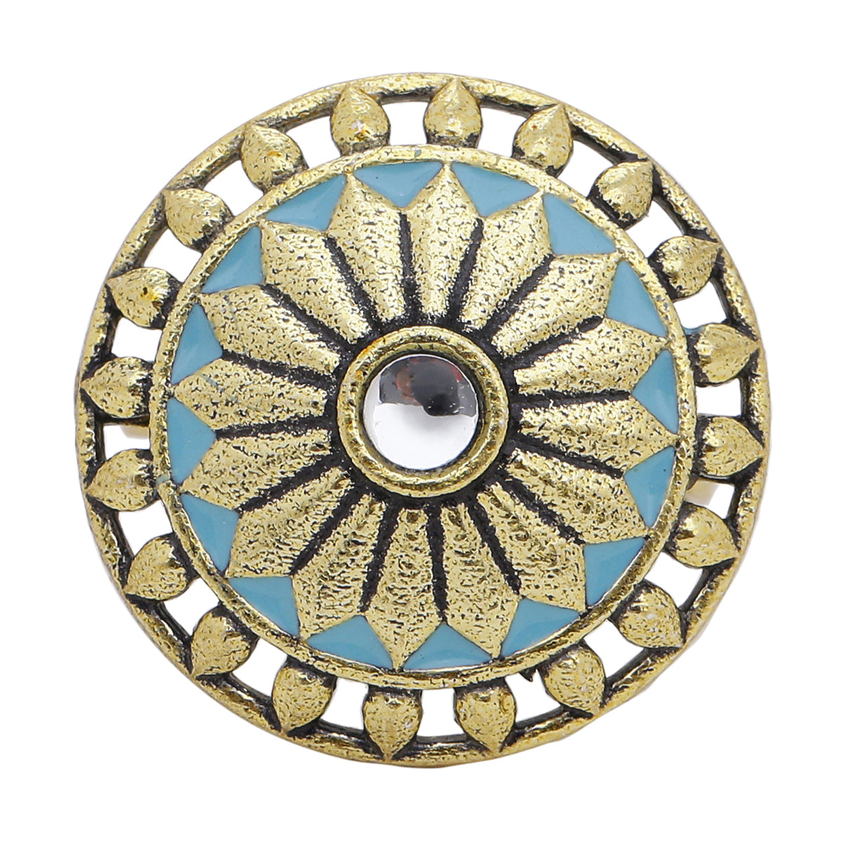 Embossed with a floral motif, the brass statement ring has been inspired by the grand fort of Gwalior, its architecture, motifs and colour schemes. Oxidised gold plated and enameled, the ring is adjustable and can be paired with ethnic and Indo-Western looks.