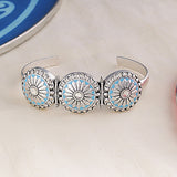 Floral motifs embossed three-circles bracelet inspired by the Gwalior fort, its domes and motifs. Made from brass and oxidised silver plated, the enameled bracelet is adjustable and can be paired with ethnic and Indo-Western looks.