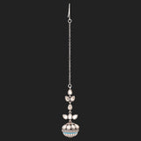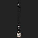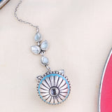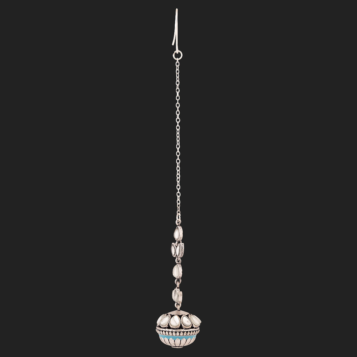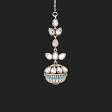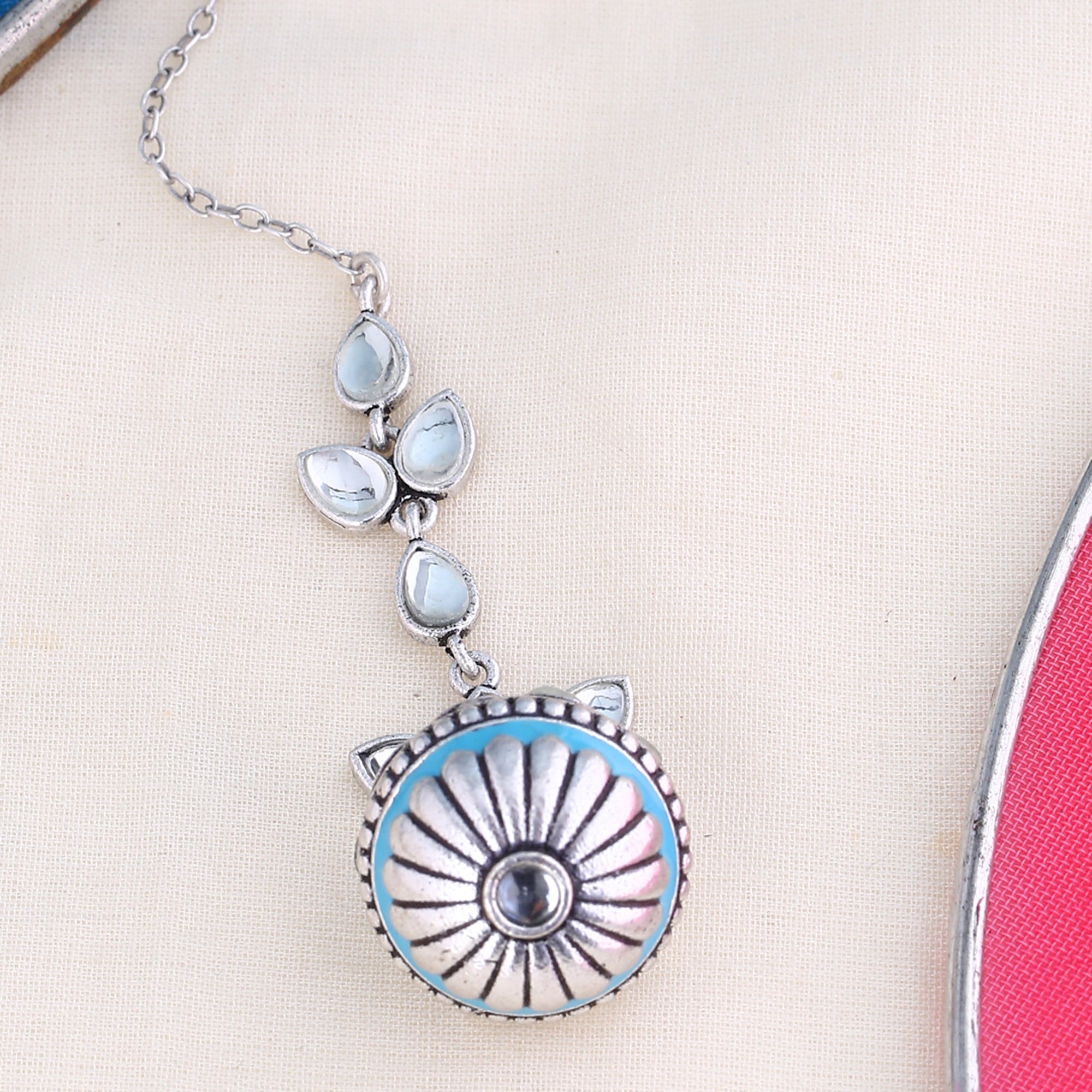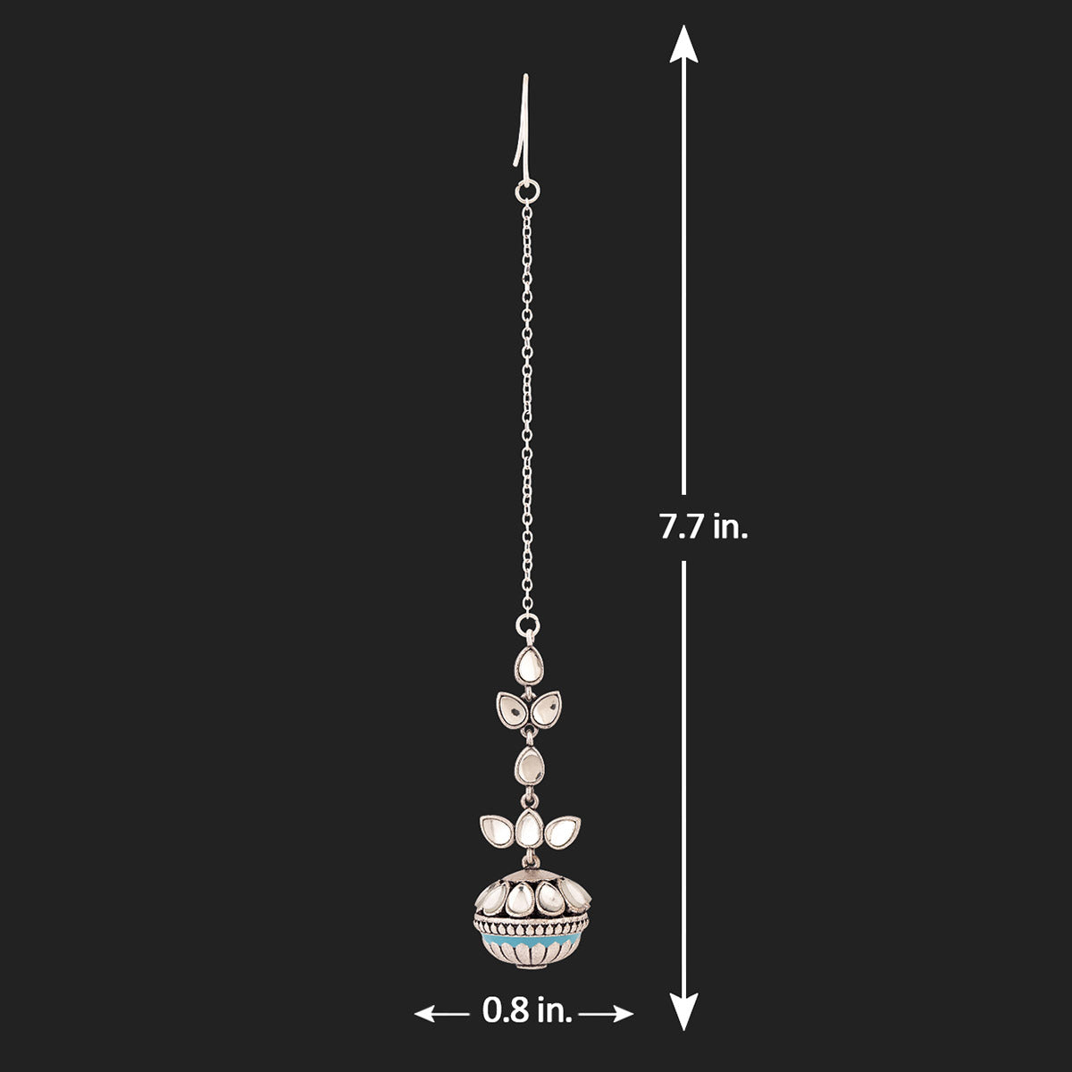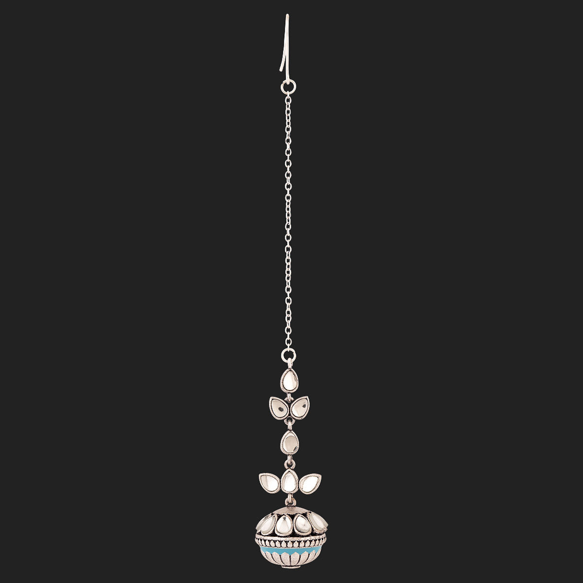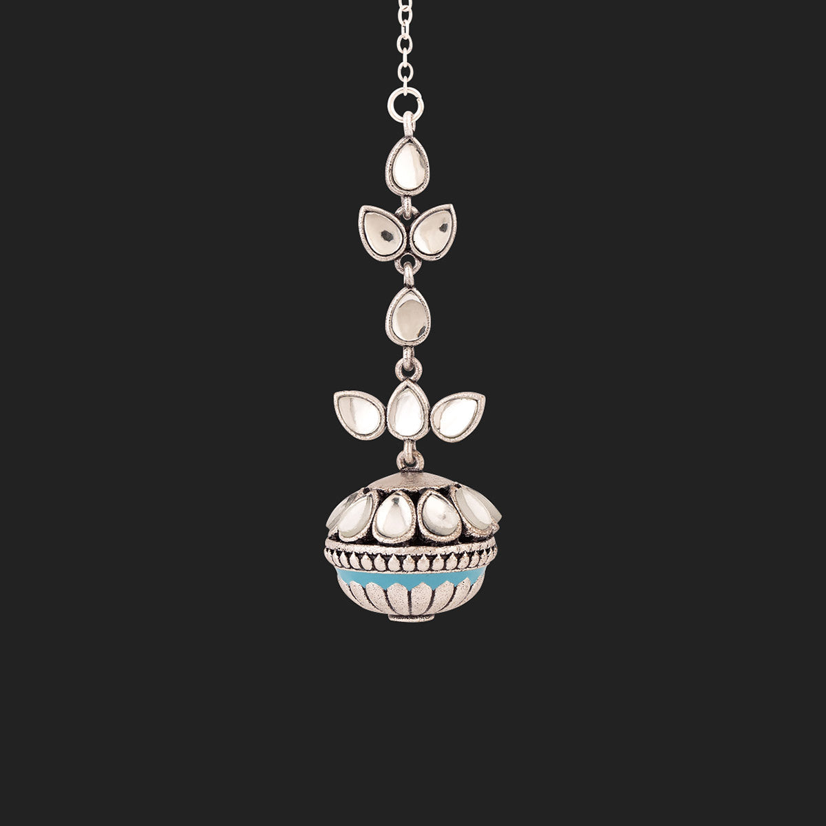 Faux kundan gems embellished borla maang tika, inspired by the grandeur and architecture of the Gwalior fort. Brass has been used in the making of this oxidised silver plated tika. Enameled and versatile, the tika can be paired with ethnic and Indo-Western looks.